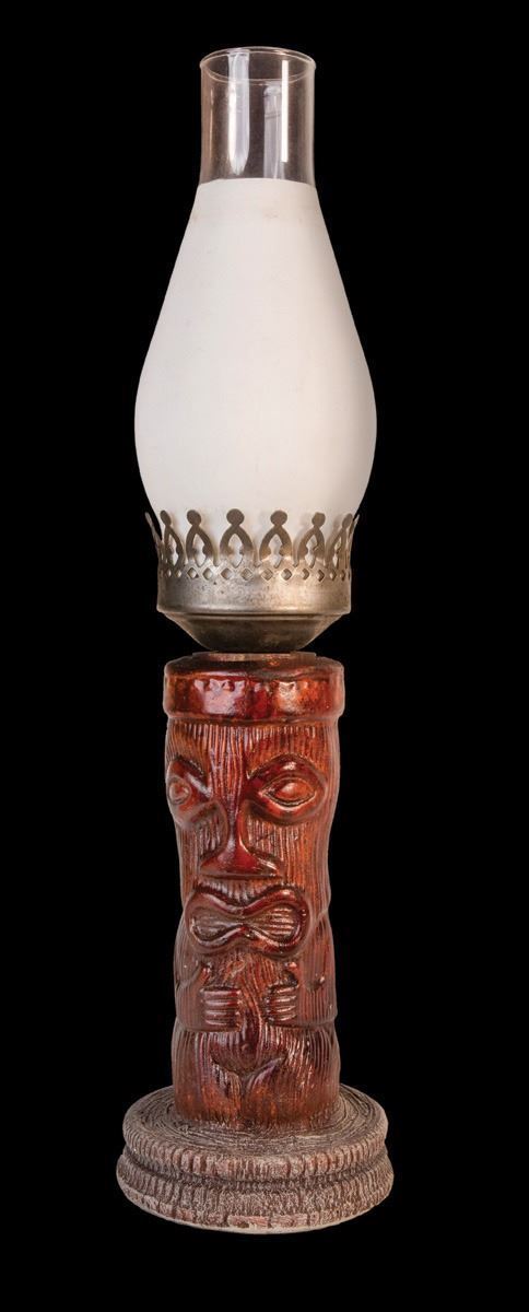 (1960s) This resin lamp base was made out of a Paul-Marshall mug with a tall chimney glass.16"x7"VG+