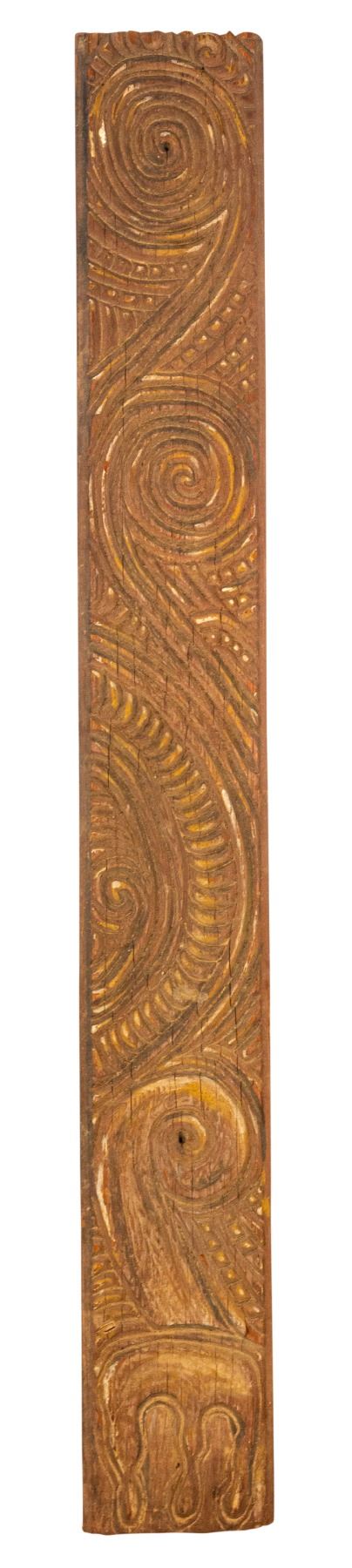 (1950s) A Lovely Tahitian-style swirled symbols designed carving into this long dark wood panel. The carving is exquisite. An architectural element, the trim piece was removed from a commercial location in Honolulu. Wood. 46.75"x6". VG+ with typical wear.