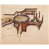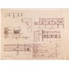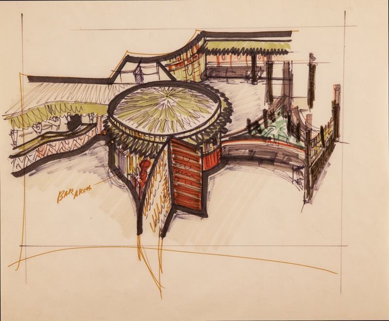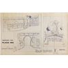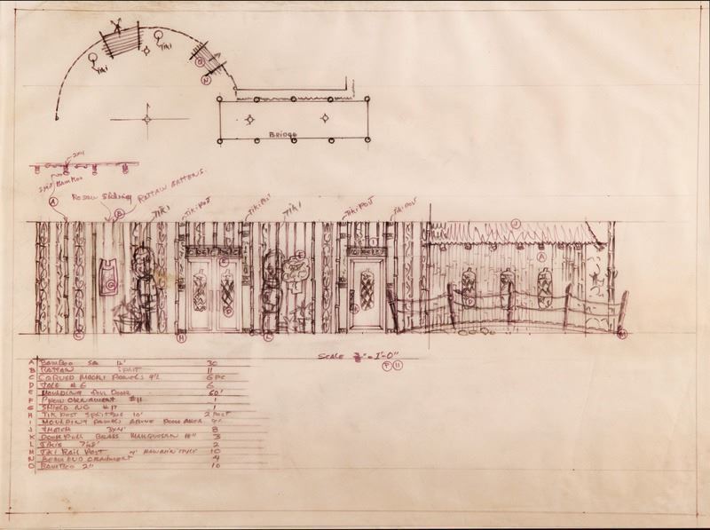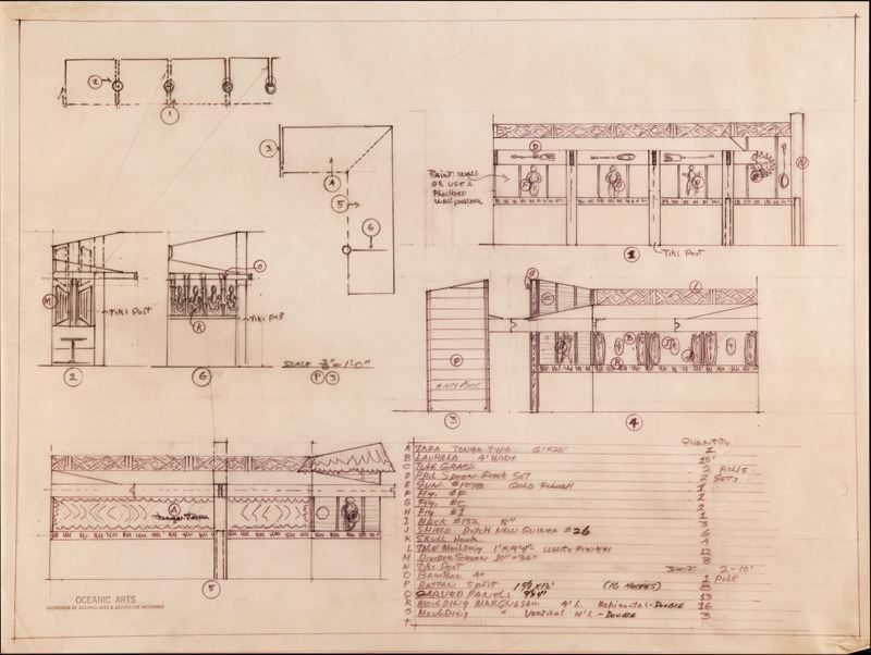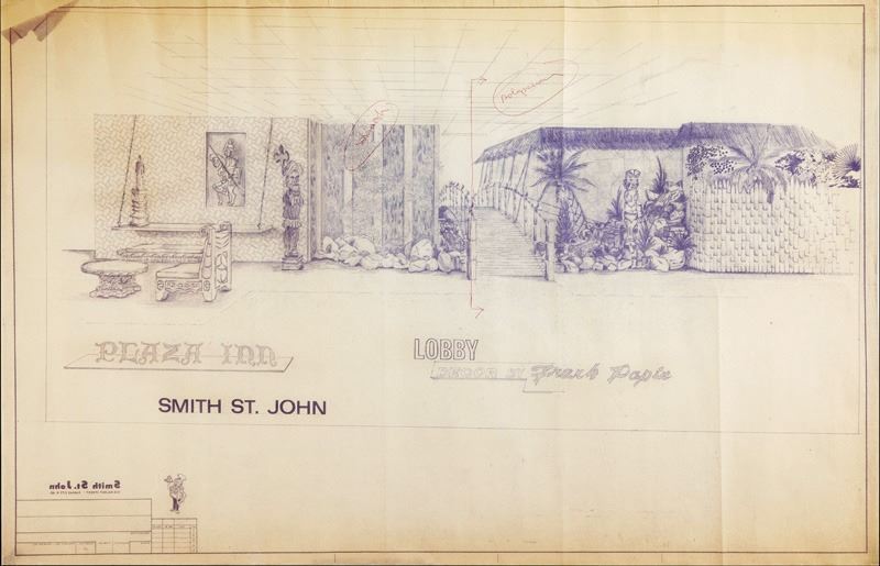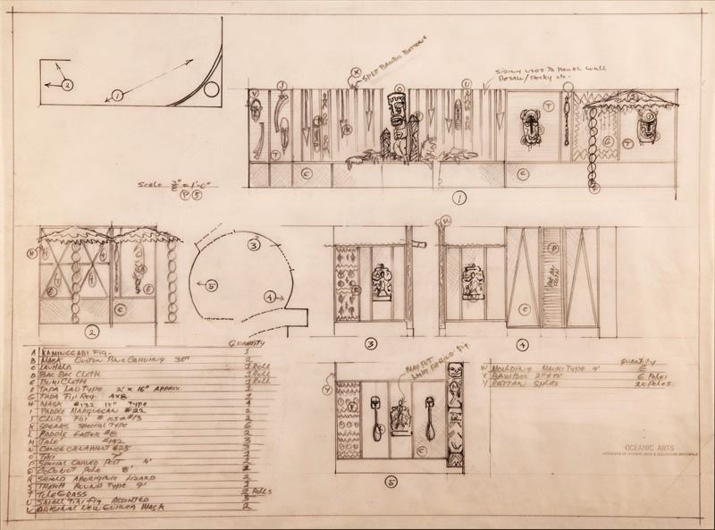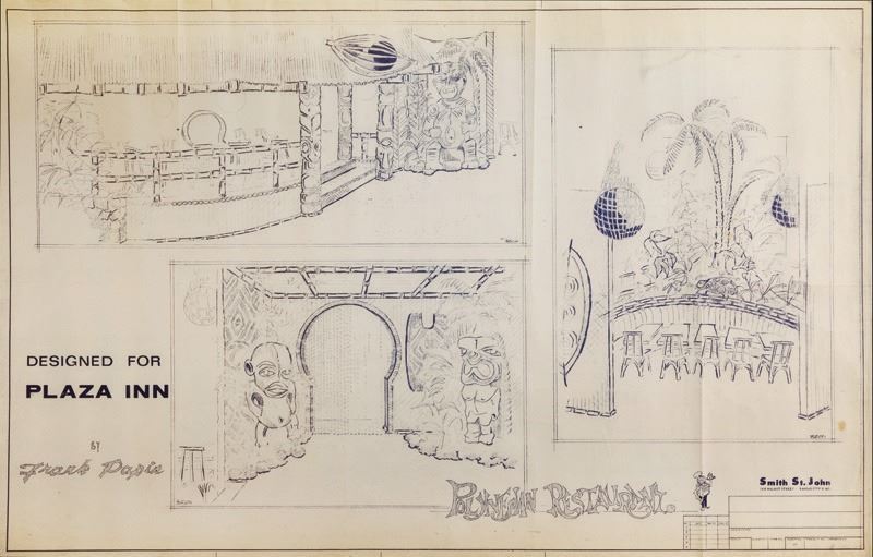 (1966) A historical set of plans from the ultra-mod Plaza Inn Polynesian restaurant in Kansas City. Blueprints of plans and dimensional renderings with groovy people and exotic effigies. The main restaurant also splits into two styles: Polynesian and Witco-Conquistador/Spanish. Also, a large number of original LeRoy Schmaltz original ink and marker on vellum drawings. Included are LeRoy suggested "flow" concepts where an unusual and mysterious environmental effect was suggested with the proper placement of curved entryways to a central interior bar. 14 Ink on vellum drawings and 9 stat construction ozalid prints.Drawings : 18"x24", Stats: 34"x22"VG+ with typical wear and creasing.