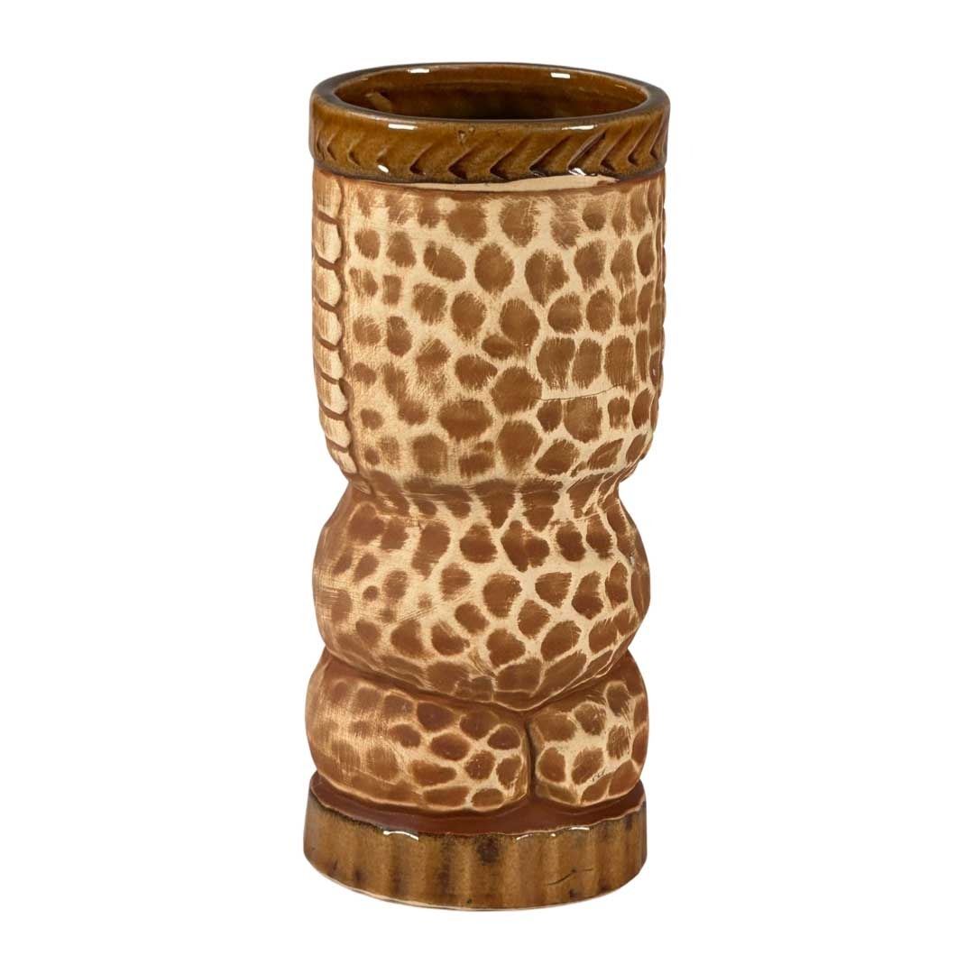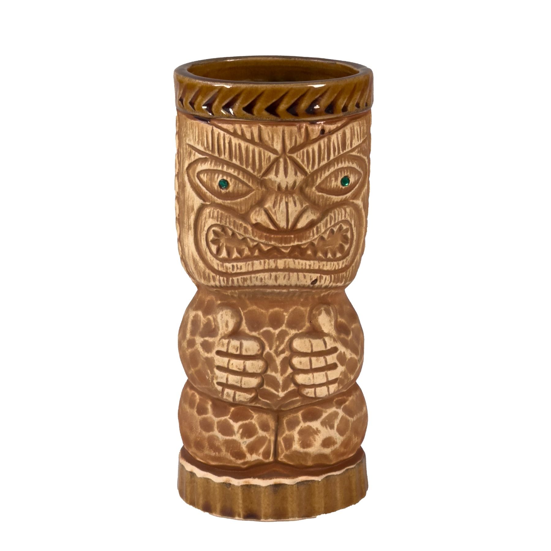(1960s) Striking raw tan KU War God mug by Orchids of Hawaii with inset green rhinestone jewel eyes. 6"x2.75". VG+.