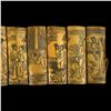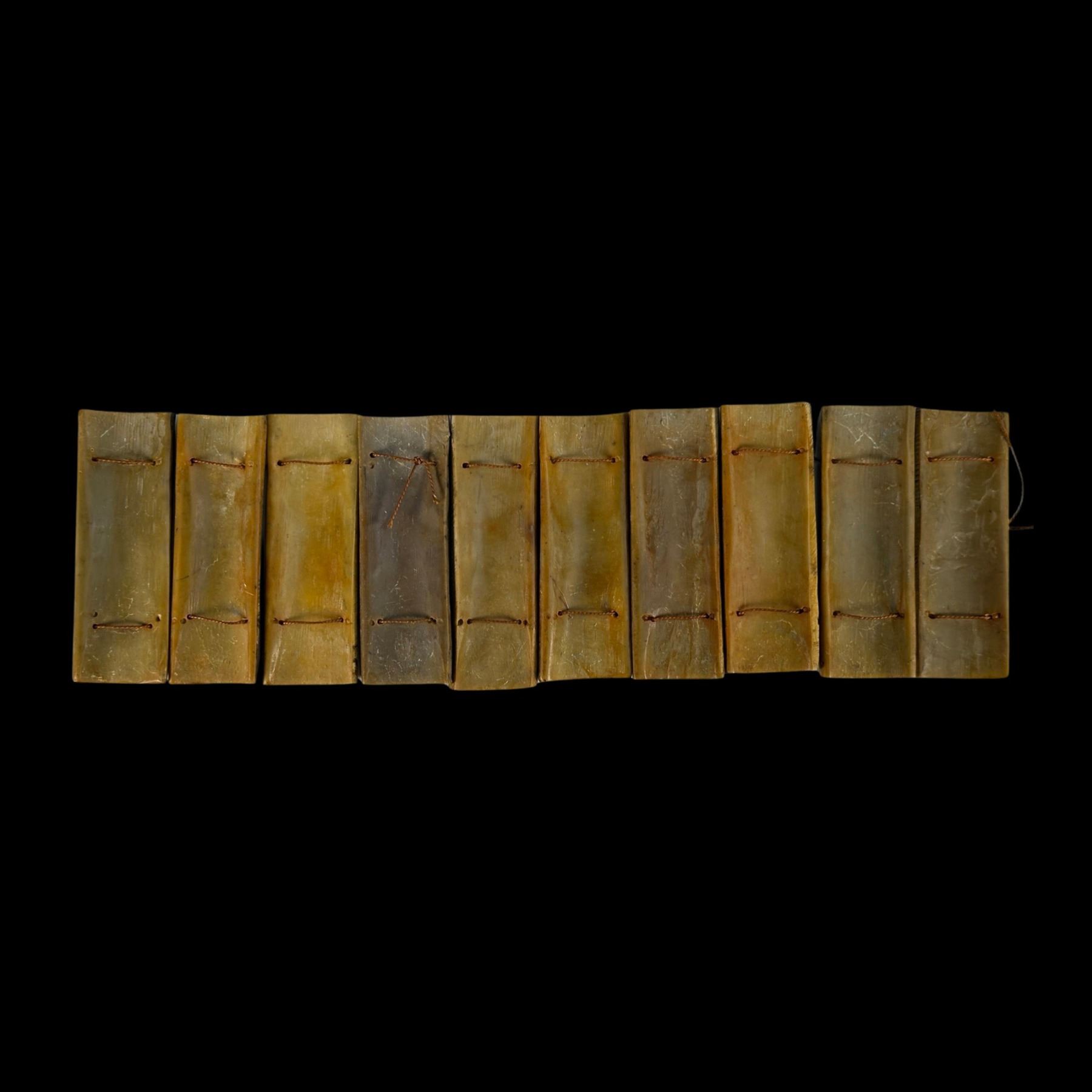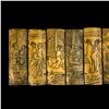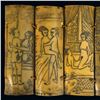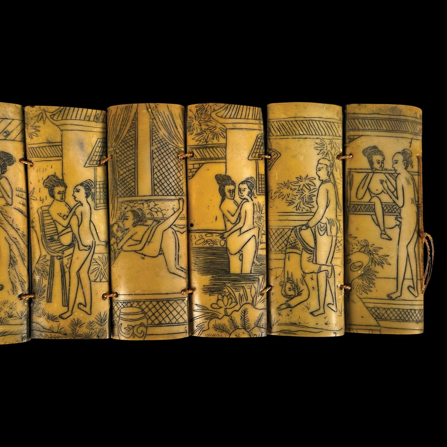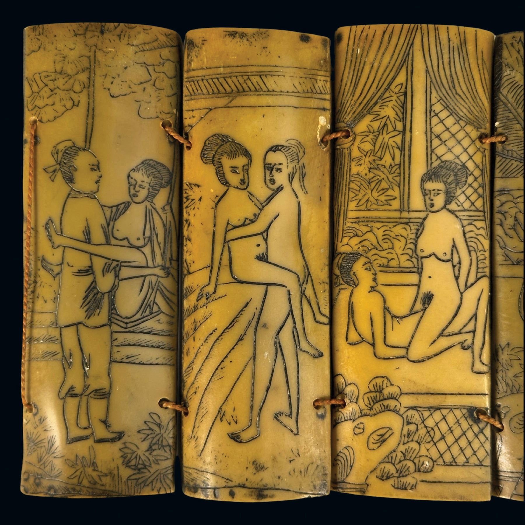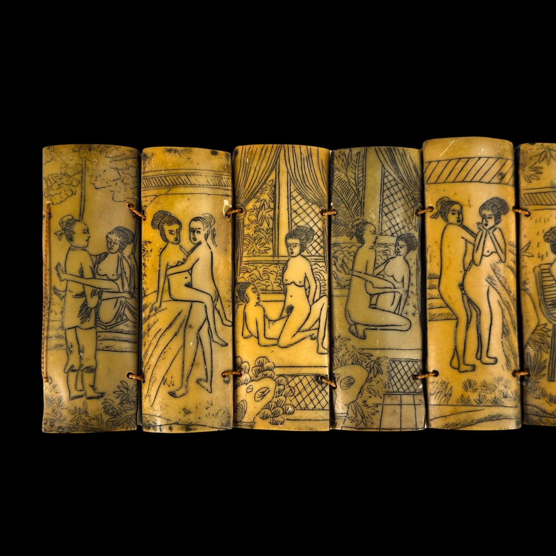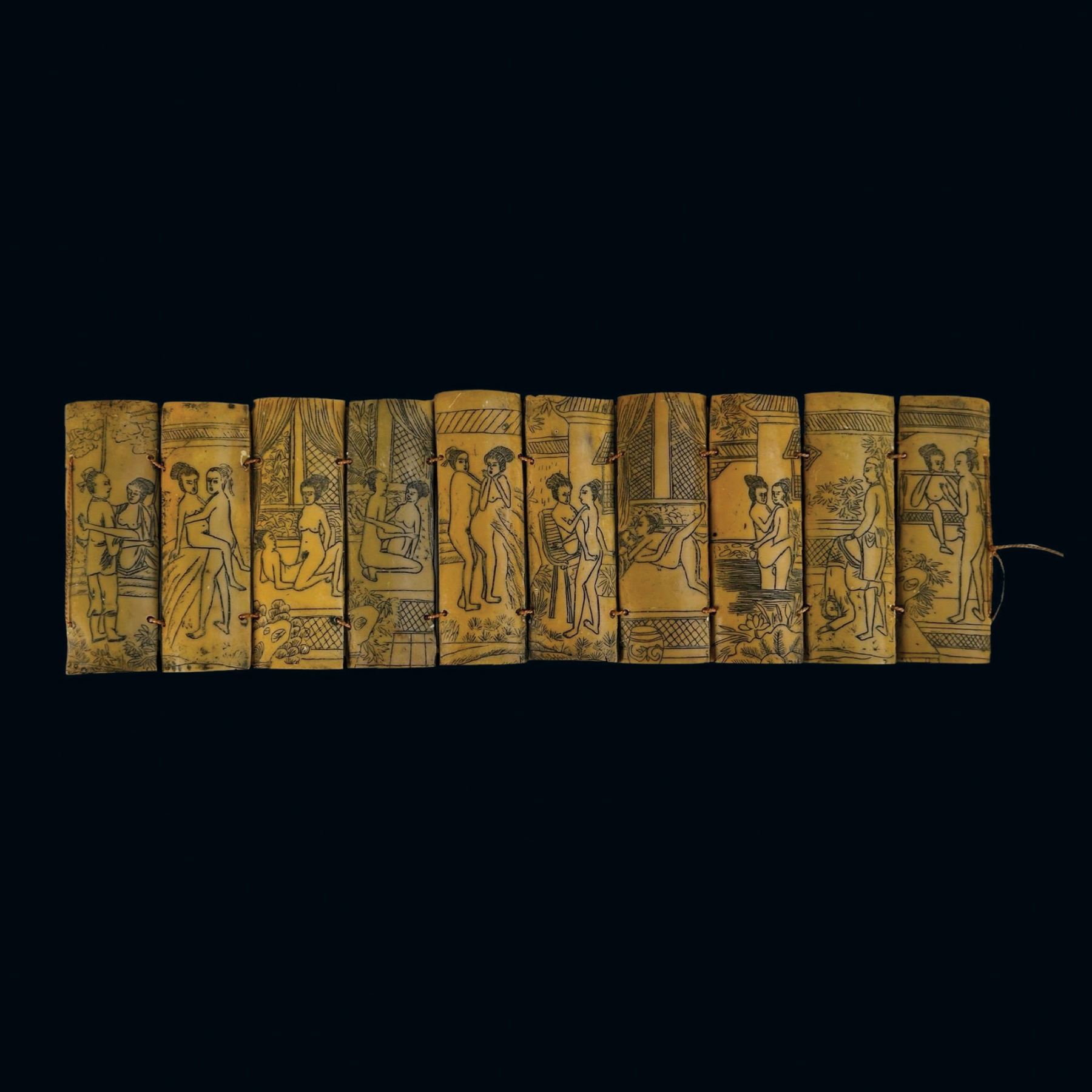 (1930s) A detailed scrimshaw consisting of ten ox bone panels depicting some of the more illustrative Netsuke or Kama Sutra lovemaking positions celebrated in cross-Asian culture. Silk thread ties bind the series of tablets together. VG+.13.5"x4".