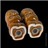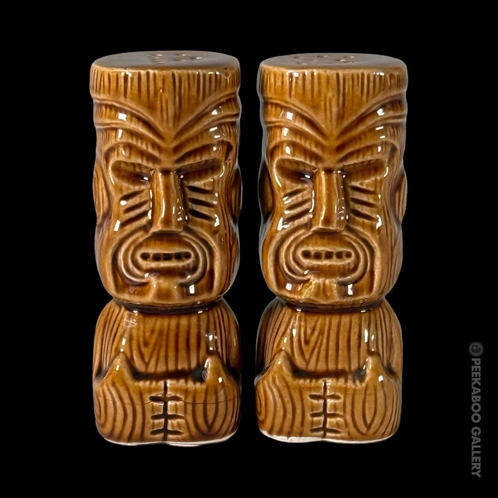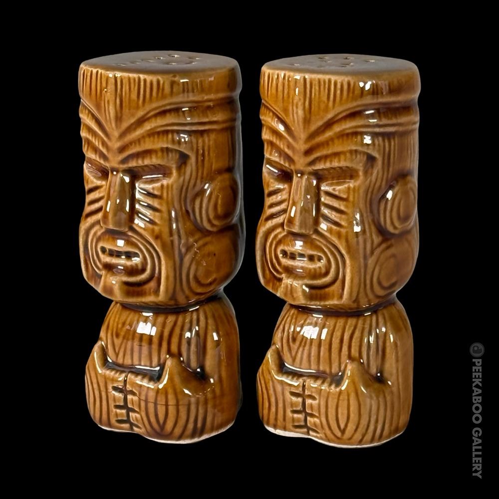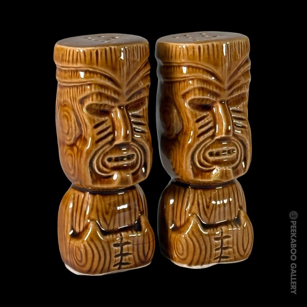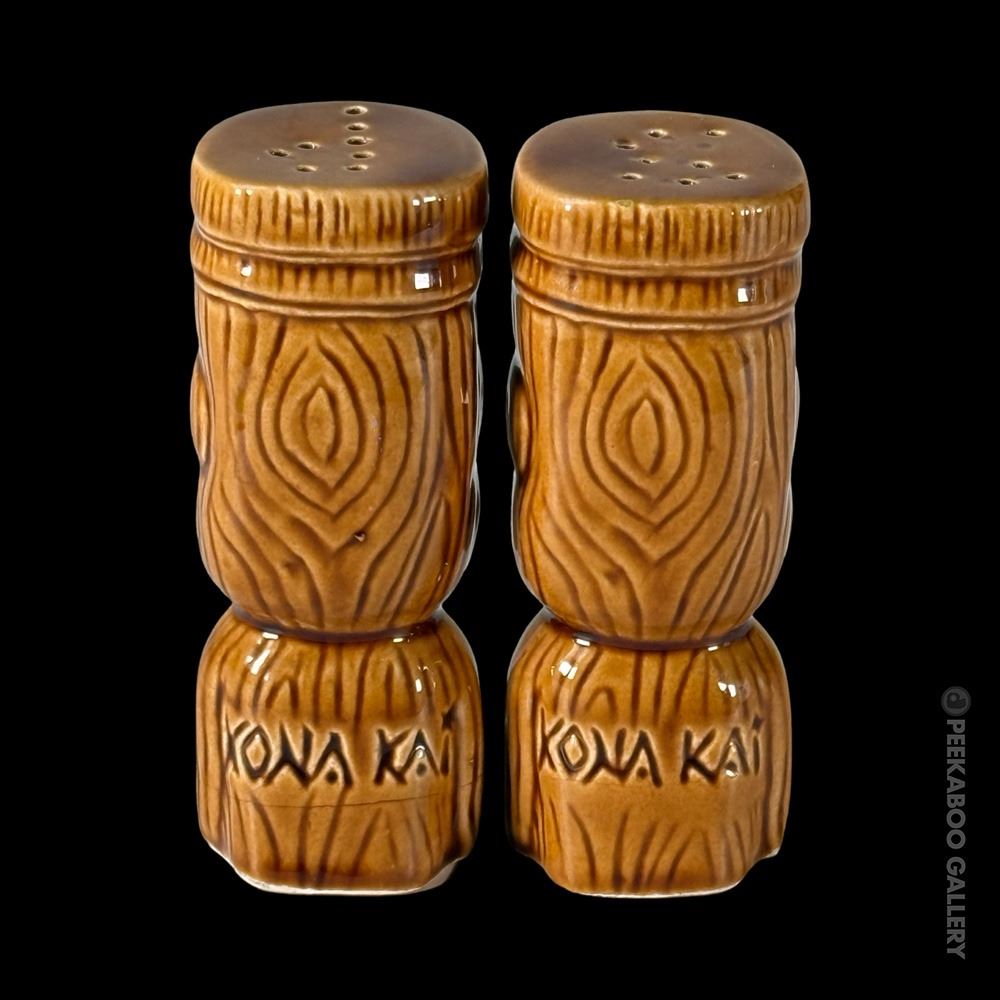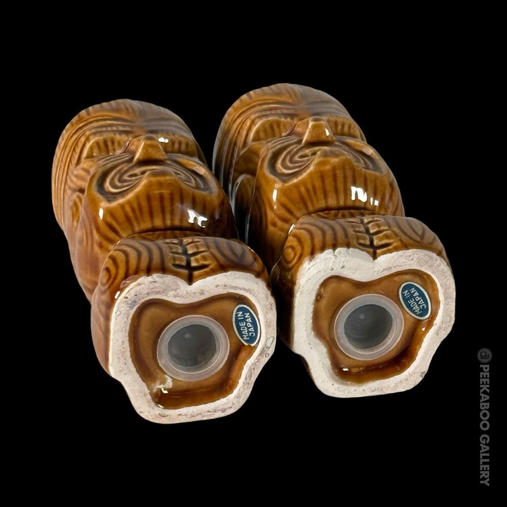 (1960s) Handsome Maori Tiki shakers from the flagship location of Marriott's KONA KAI in Philadelphia. VG+ with minor wear. 4"x1.75"dia each.
