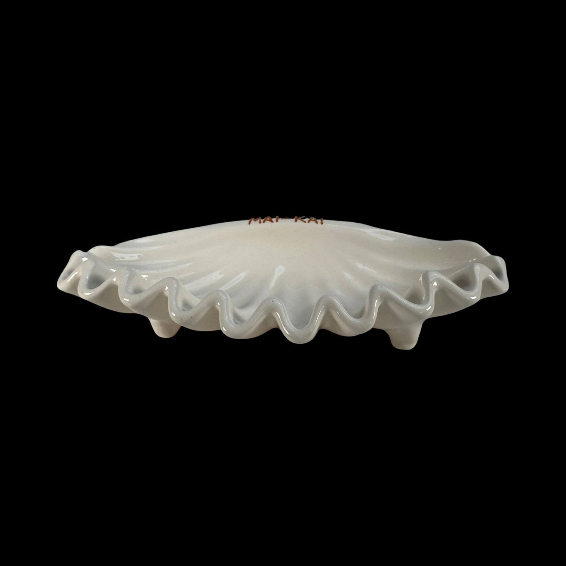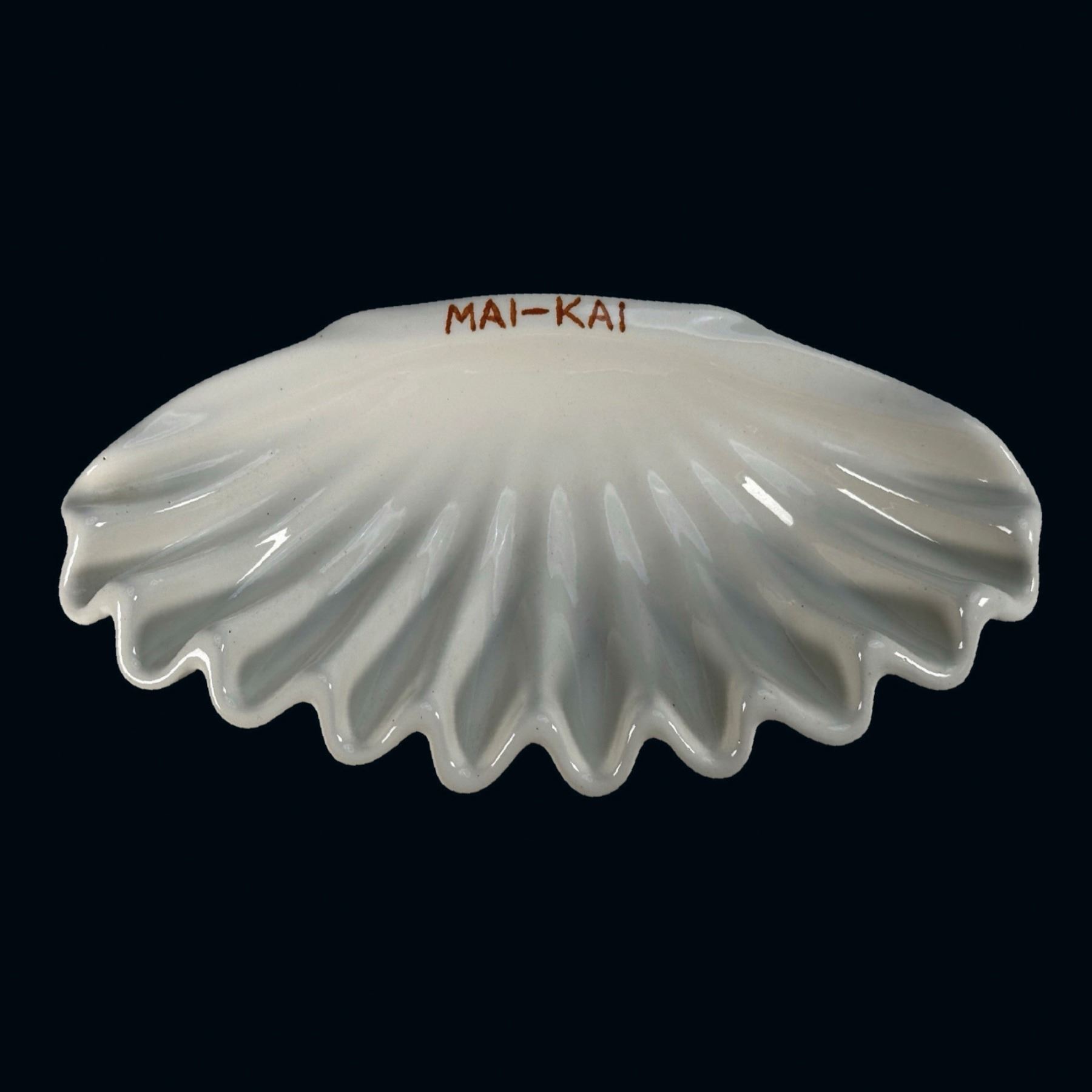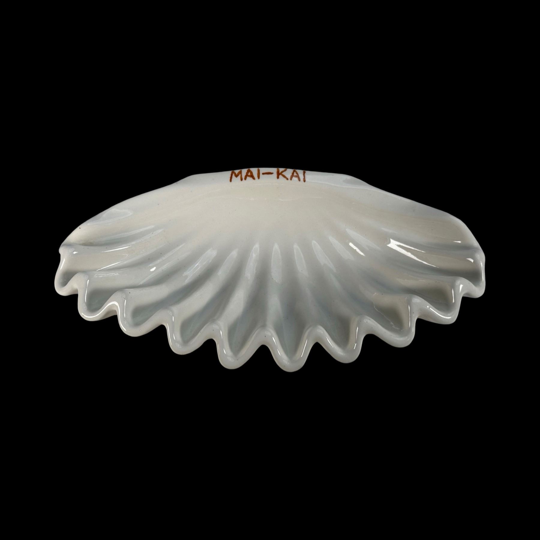 (1950s) A very early souvenir from the famous, MAI-KAI gift shop. Dating from the late 1950s to early 60s, this figural clamshell candy tray features a hand painted underglaze of "MAI-KAI". VG+. 11.5"x2.25"x6".