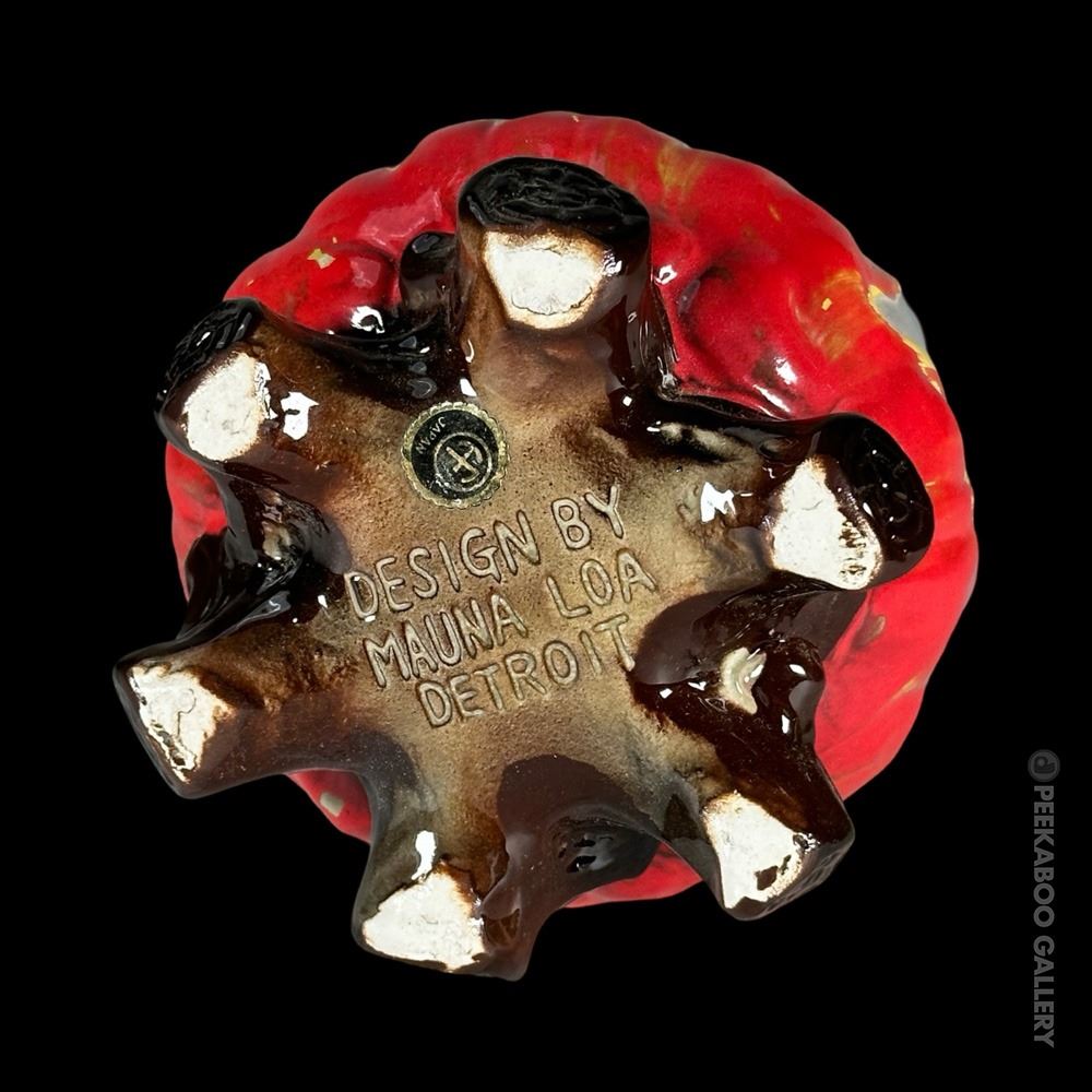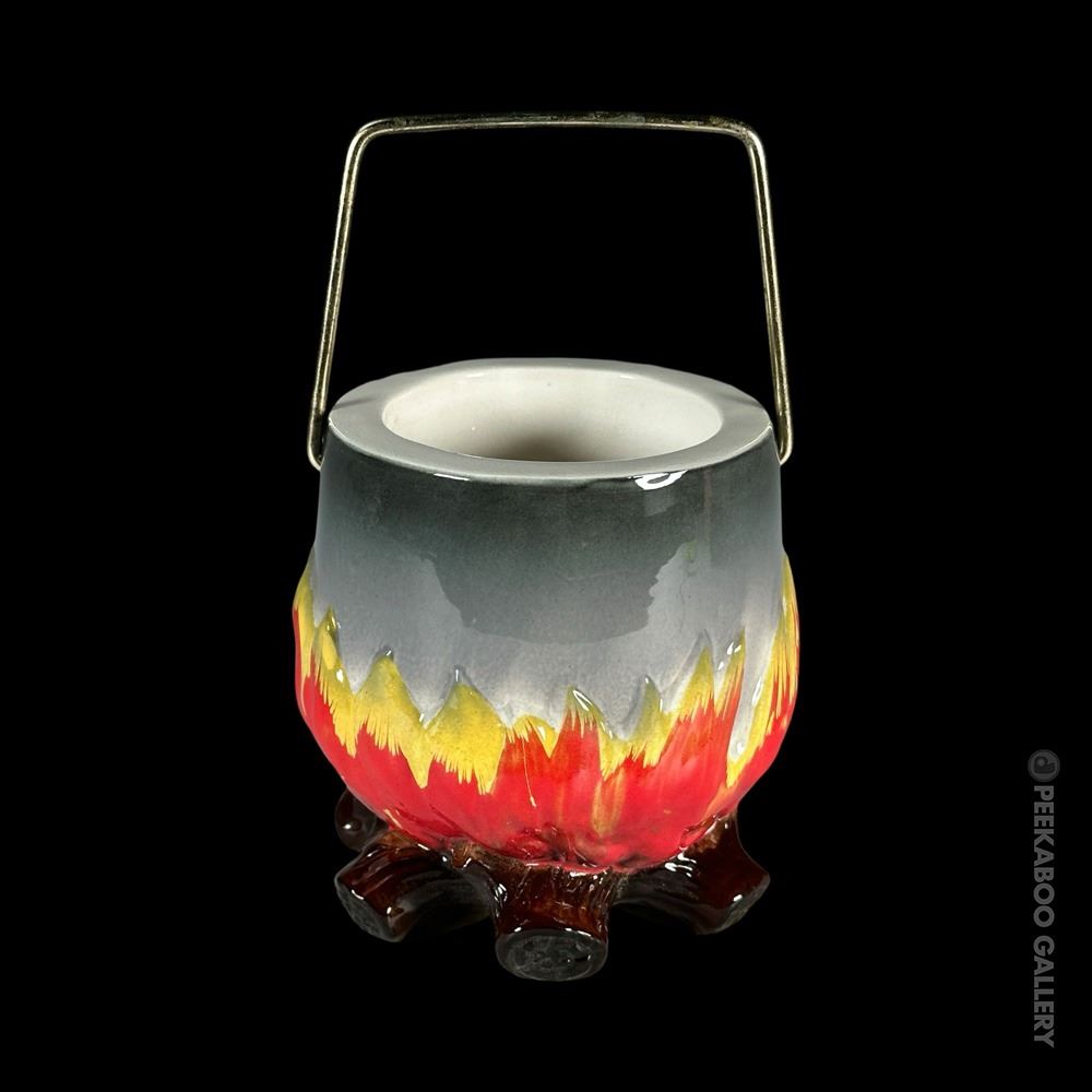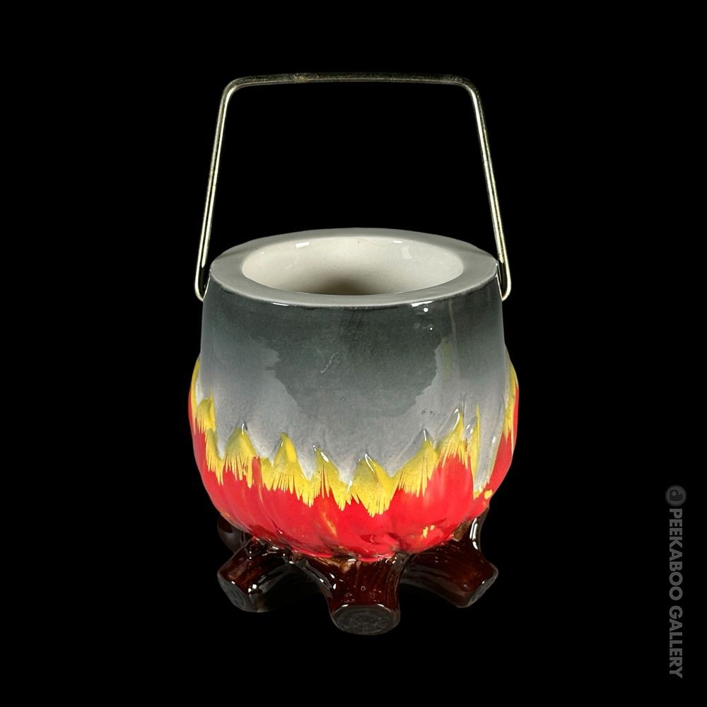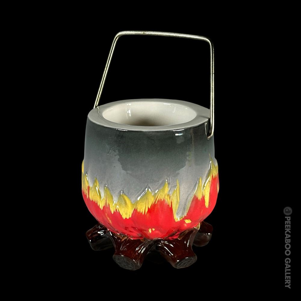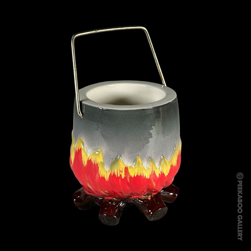 (1960s) One of the coolest mugs in Tikidom! The Mauna Loa had amazing custom mugs created by Gabe Florian of Steve Crane and Associates. Of them, this one takes the cake! Used for Hot Navy Grogs and Buttered Rums, the double walled mug features a thick brass hinged handle rather than an attached side handle. Practicality was not in the cards! The sides are treated with cold top paint (which often chips) that depict hot flames under the cauldron. Marked Mauna Loa Detroit. Comes in its original shipping box. VG+ with typical wear. 5"x4.5"dia.