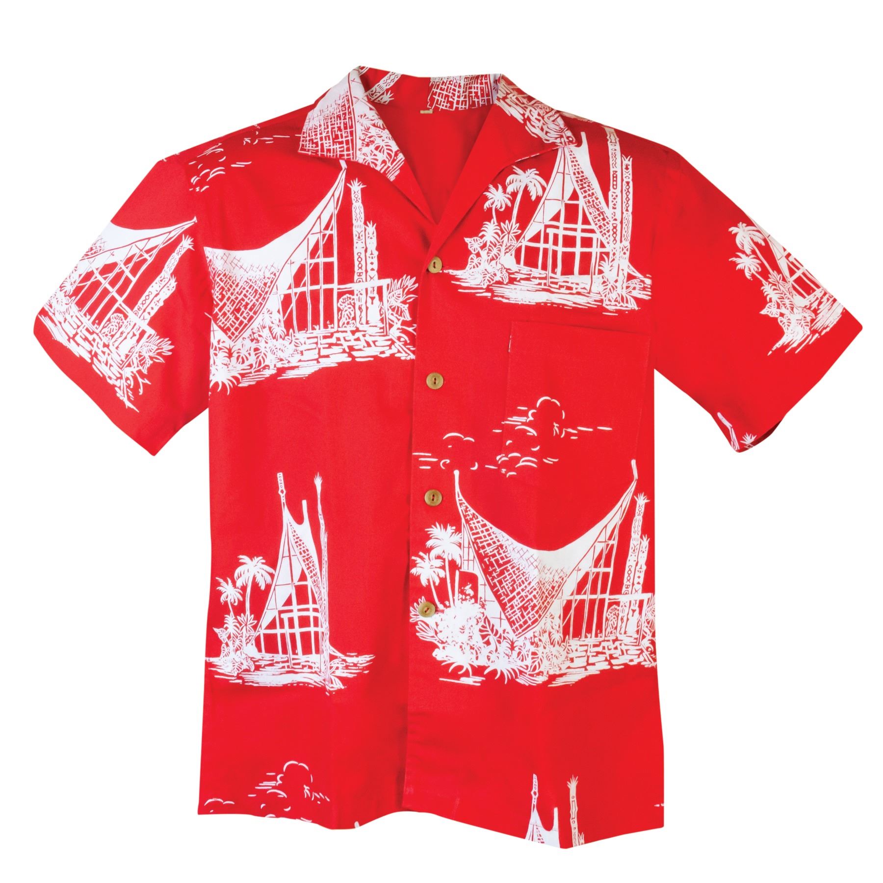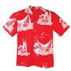 (1950s) A very rare shirt with a fabric print consisting of line drawings of the iconic main lobby building of The Waikikian Resort Hotel and it's equally famous Tahitian Lanai restaurant and bar. This and the next two lots are resort-ware sold exclusively at the hotel gift shop. Mens Shirt. Chest 23" across, Length 26". VG+ with minor wear.