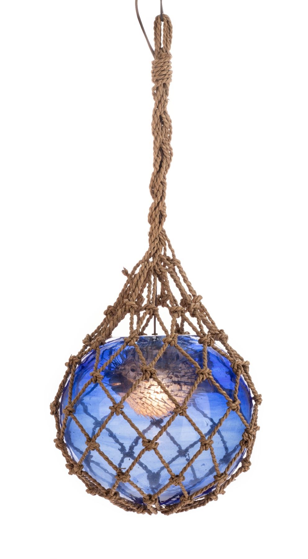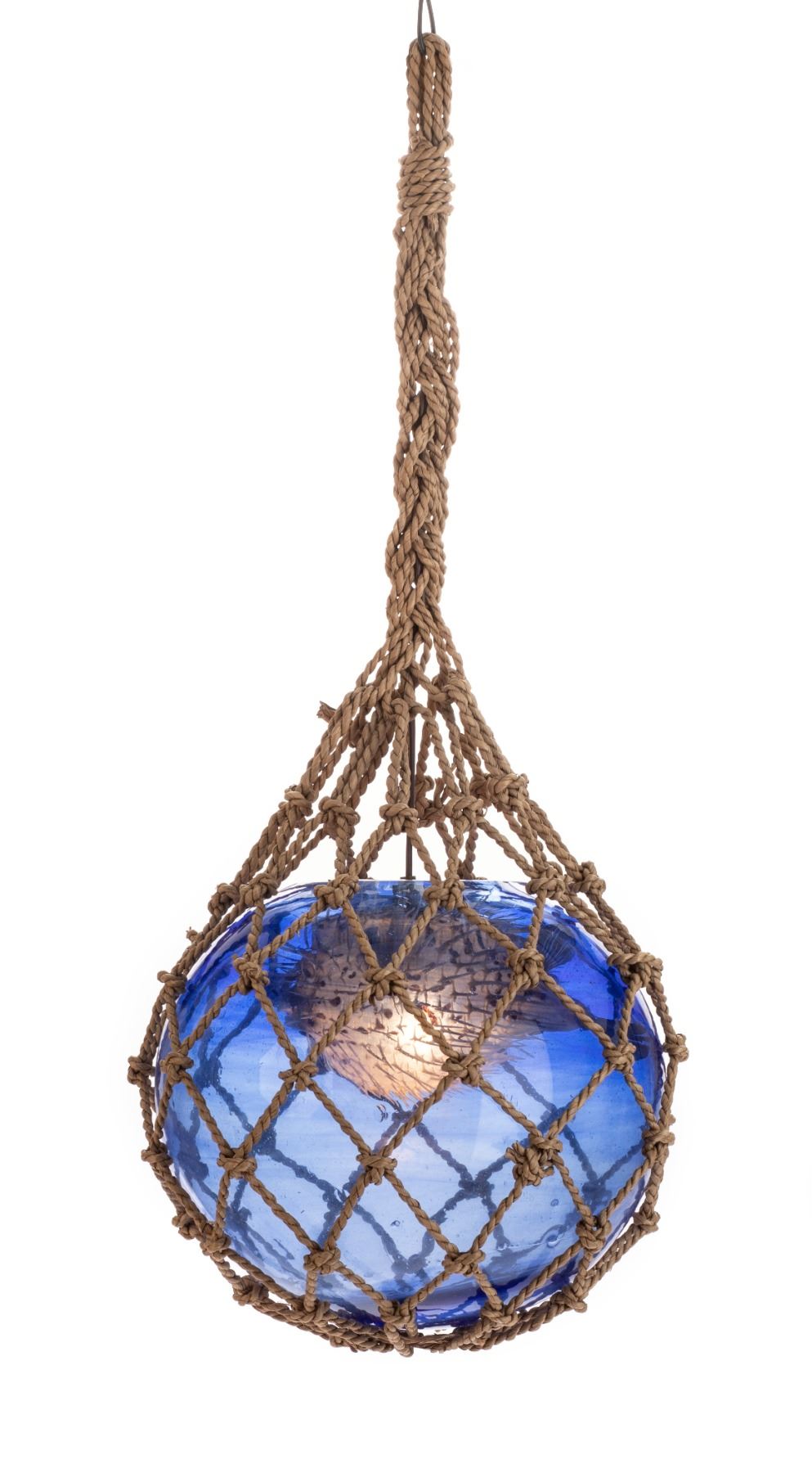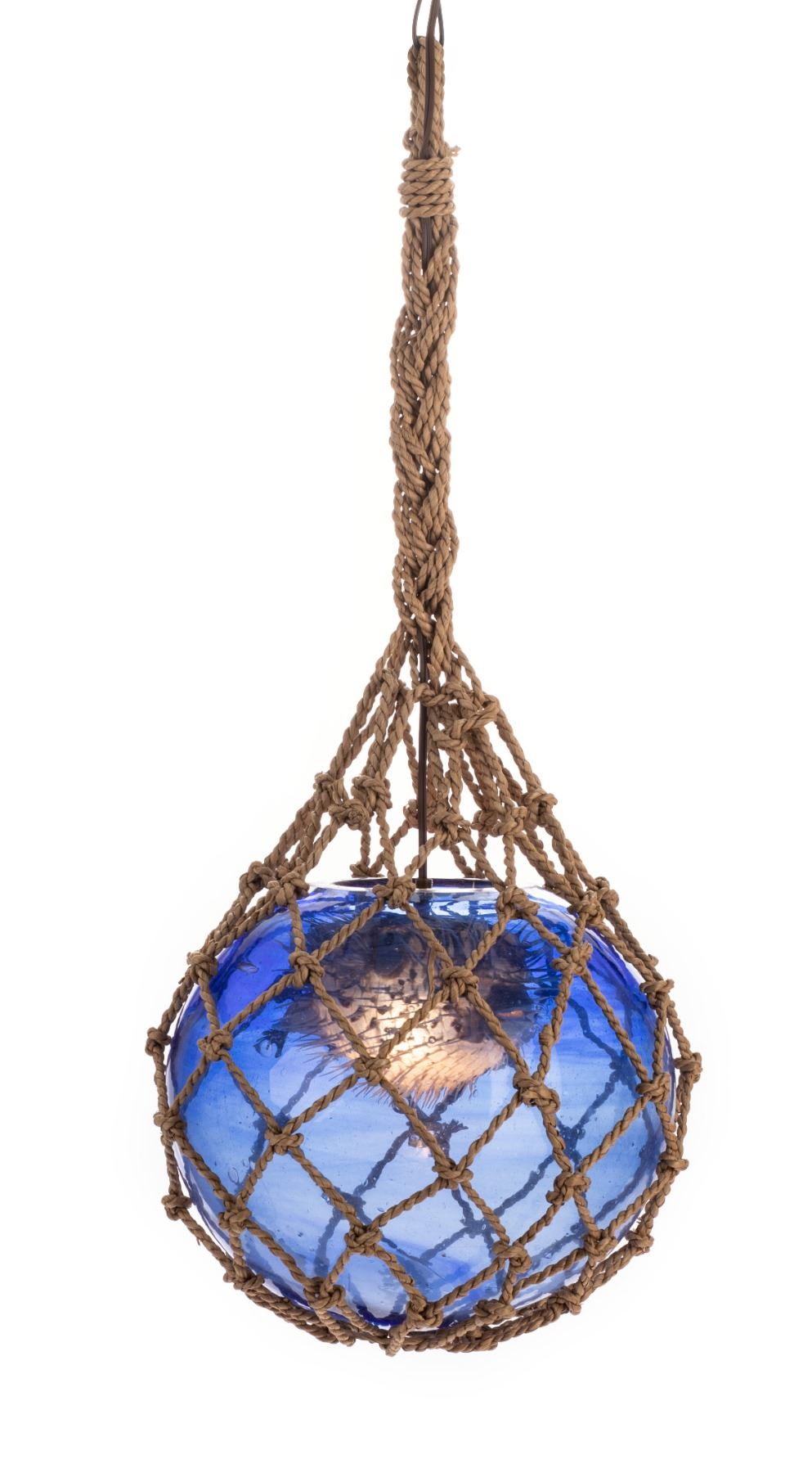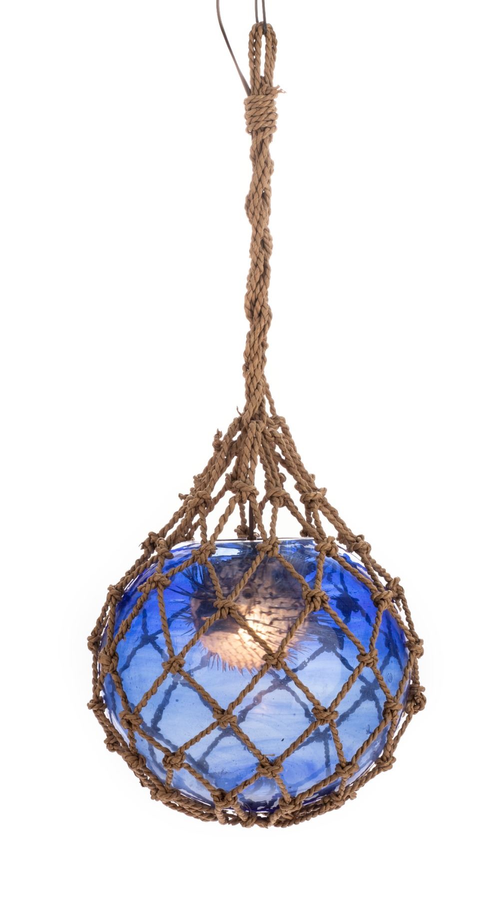 (1970s) A rare and iconic example of Poly-fantasy lighting by famed Whittier, CA supplier, Oceanic Arts. Awesome under-the-sea impression with this puffer fish inserted into the deep blue glass float. Wrapped in tight rope and ready for hanging. 10" diameter. VG+ with minimal wear.