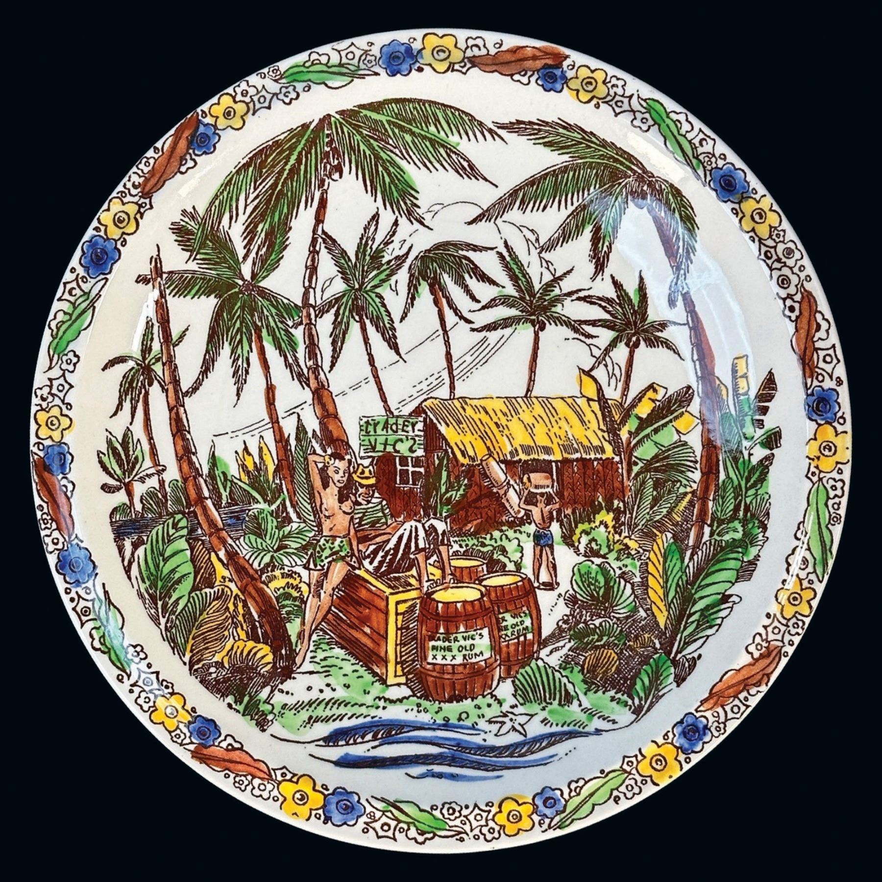 (1940s) Spectacular and somewhat scarce Trader Vic's souvenir plate produced by mythic pottery manufacturer, Vernon Kilns. VG+. 9.5"dia.