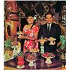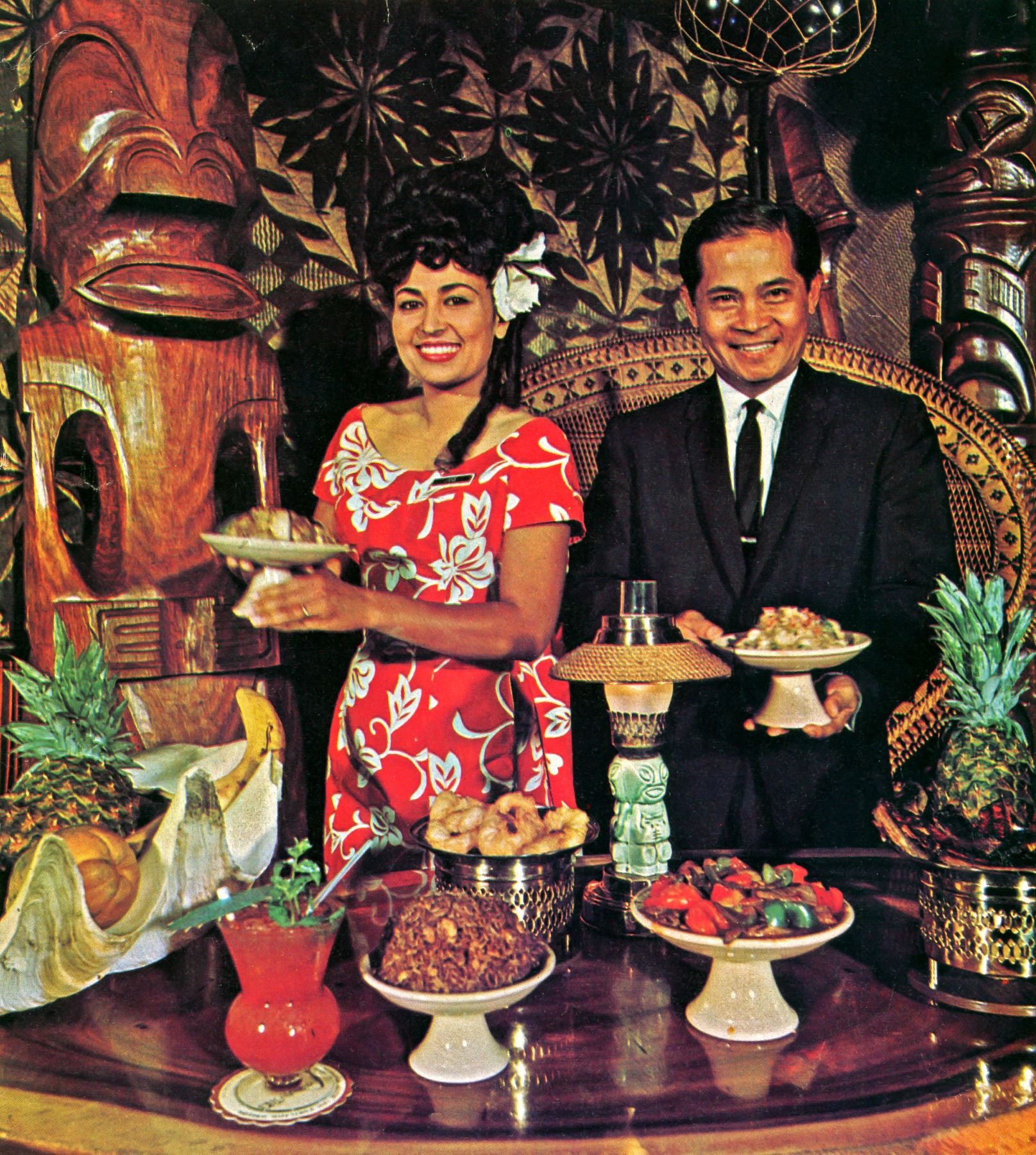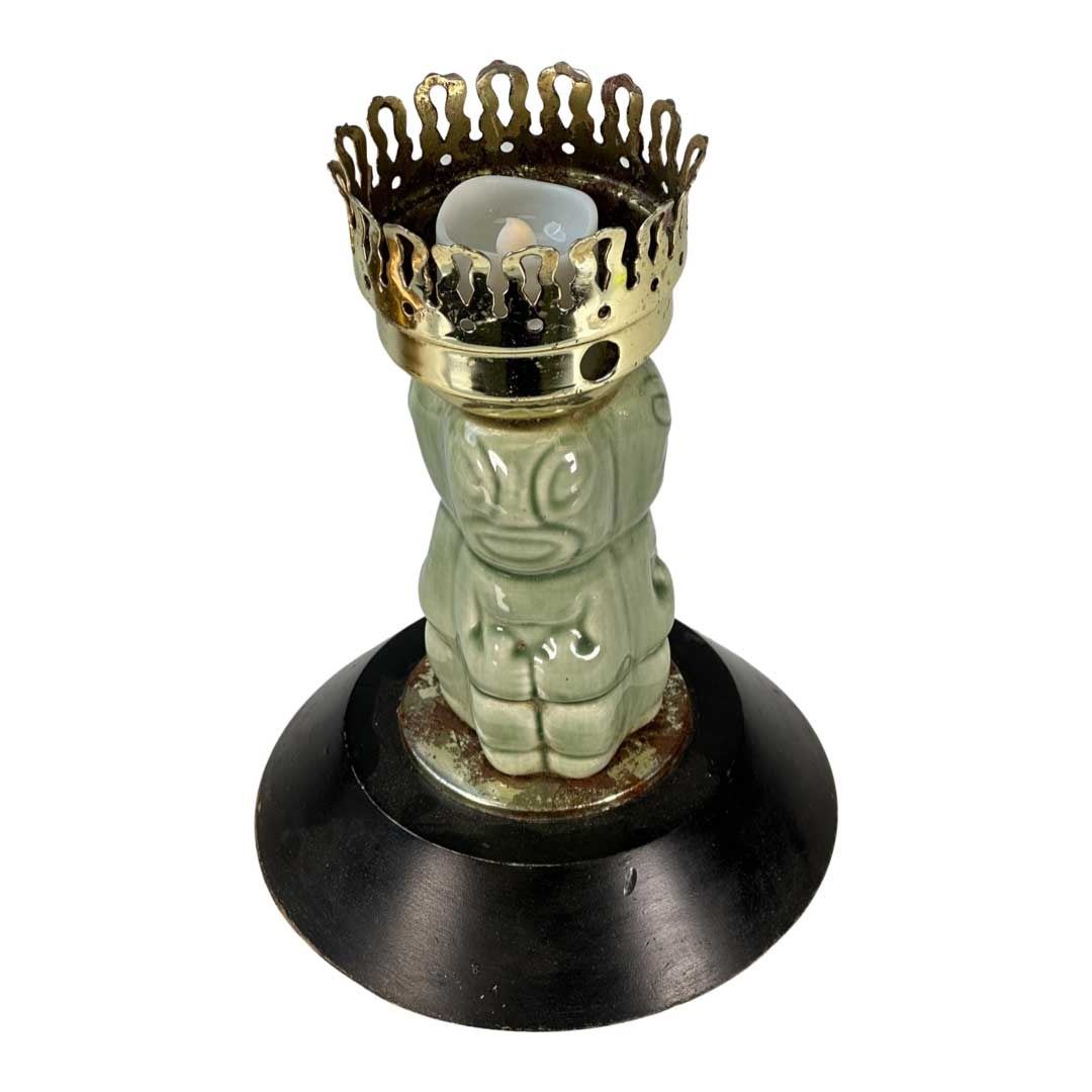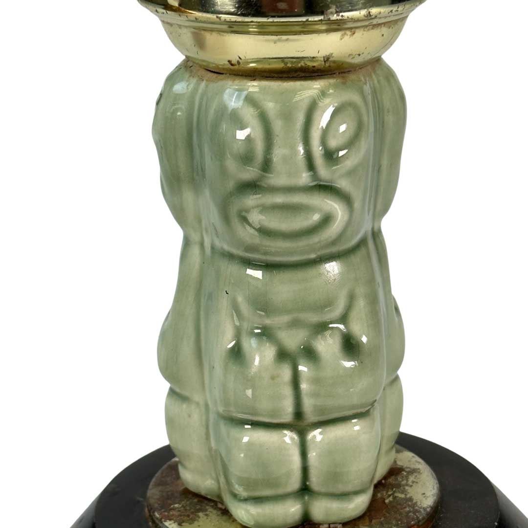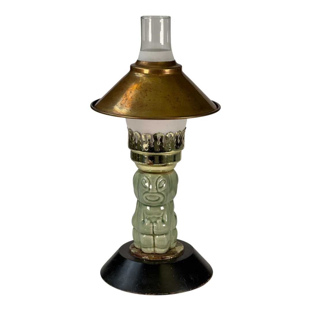 (1950s) An ultra rare artifact from on of the most influential venues in the MID CENTURY Tiki world! Steve Crane's THE LUAU on the famous Rodeo Drive in Beverly Hills was the hangout spot for so many Hollywood Elite that it boggles the mind. Anyone who was anybody in the Golden Age of Tinseltown went here regularly if for no other reason, it was right down the street from the residential part of the Los Angeles suburb where so many stars lived. Steve Crane was quite the socialite himself and with his proximity to so many movie star beauties, it is no surprise this place has high on the popularity list. What we have here is a handmade table candle lamp, supplied to every table in the restaurant and bar of THE LUAU. These were manufactured with ceramic parts from Stella Bodey's SPURLIN CERAMICS. It features the earlier, black metal base, ceramic Tikis and Hurricane lamp parts. A tealight candle would be changed out every hours or so when a new seating of diners was rotated to the table. In overall excellent condition with the exception of the base were there is surface rust. This does not detract, but could be cleaned off if one chooses to. Tiki table lamps are extremely scarce and this is one of the most in demand examples. A very rare piece of Hollywood and Tiki history! 14.5"x7". VG+ with some rust wear on top of base.