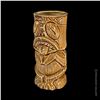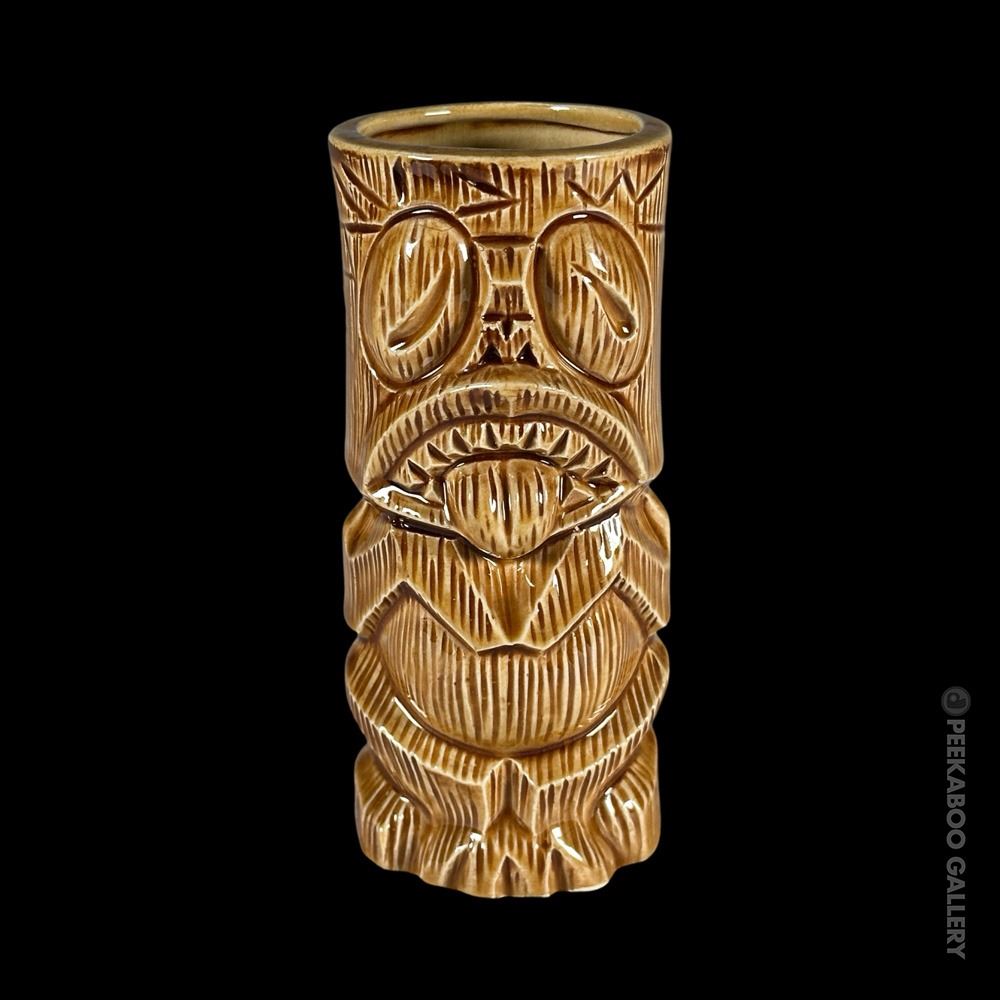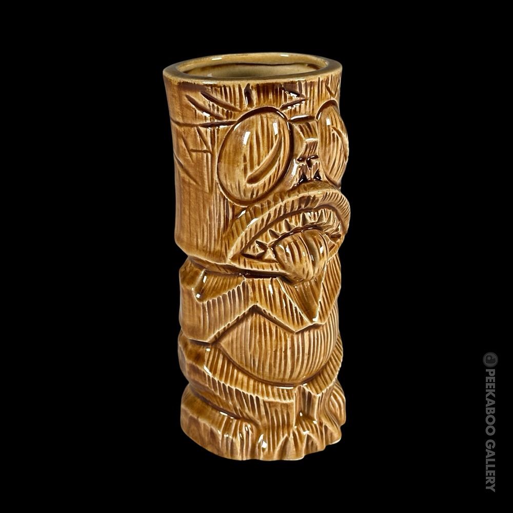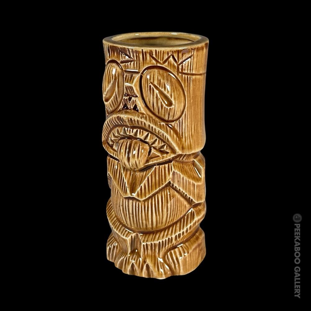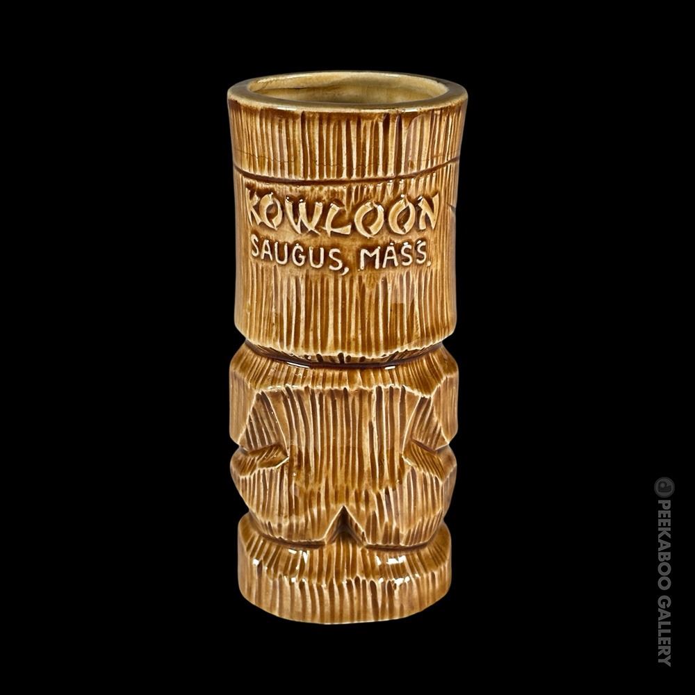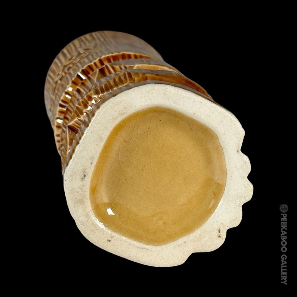 (1960s) This signature mug made by OMC for KOWLOON is certainly one of the most striking, graphic Tiki mugs of the era. This is the "B" or short version of the mug with greenish-grey interior glaze. VG+. 6"x2.75"dia.