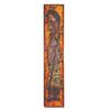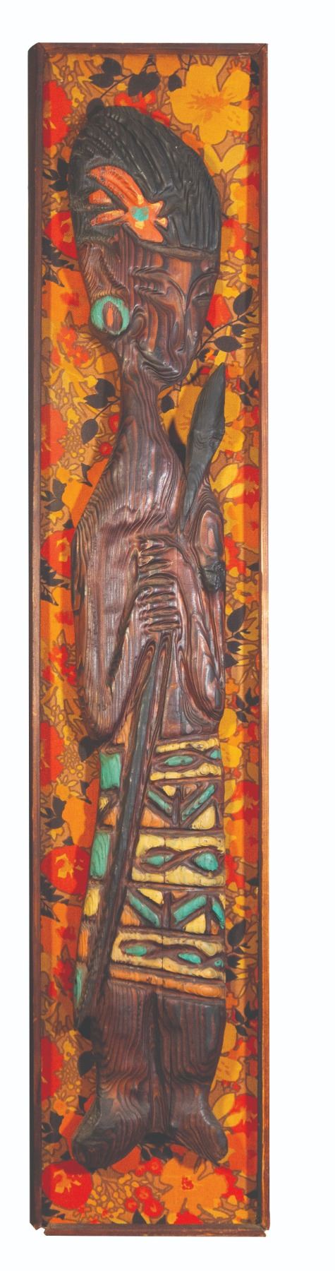 (1960s) Rare WITCO original wall hanging. Cedar wood hand-carved and painted Polynesian female topless with floral sarong skirt. A rare and powerful image of the era in its depiction of a woman with a spear. Placed against a 60s era fabric background of yellow and orange flower petals. One of the earlier offerings from the WITCO catalog. Wood frame. 12"x60". VG+.