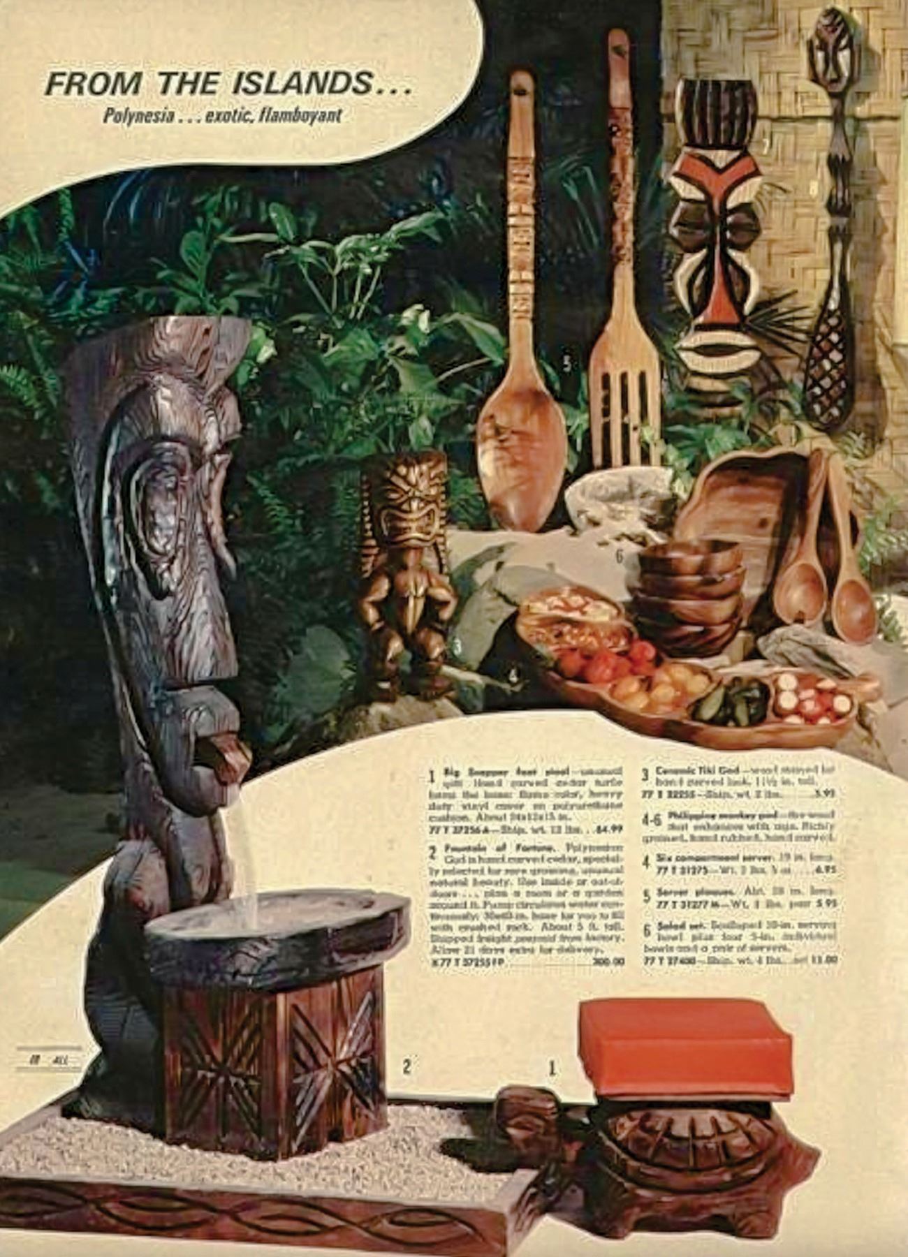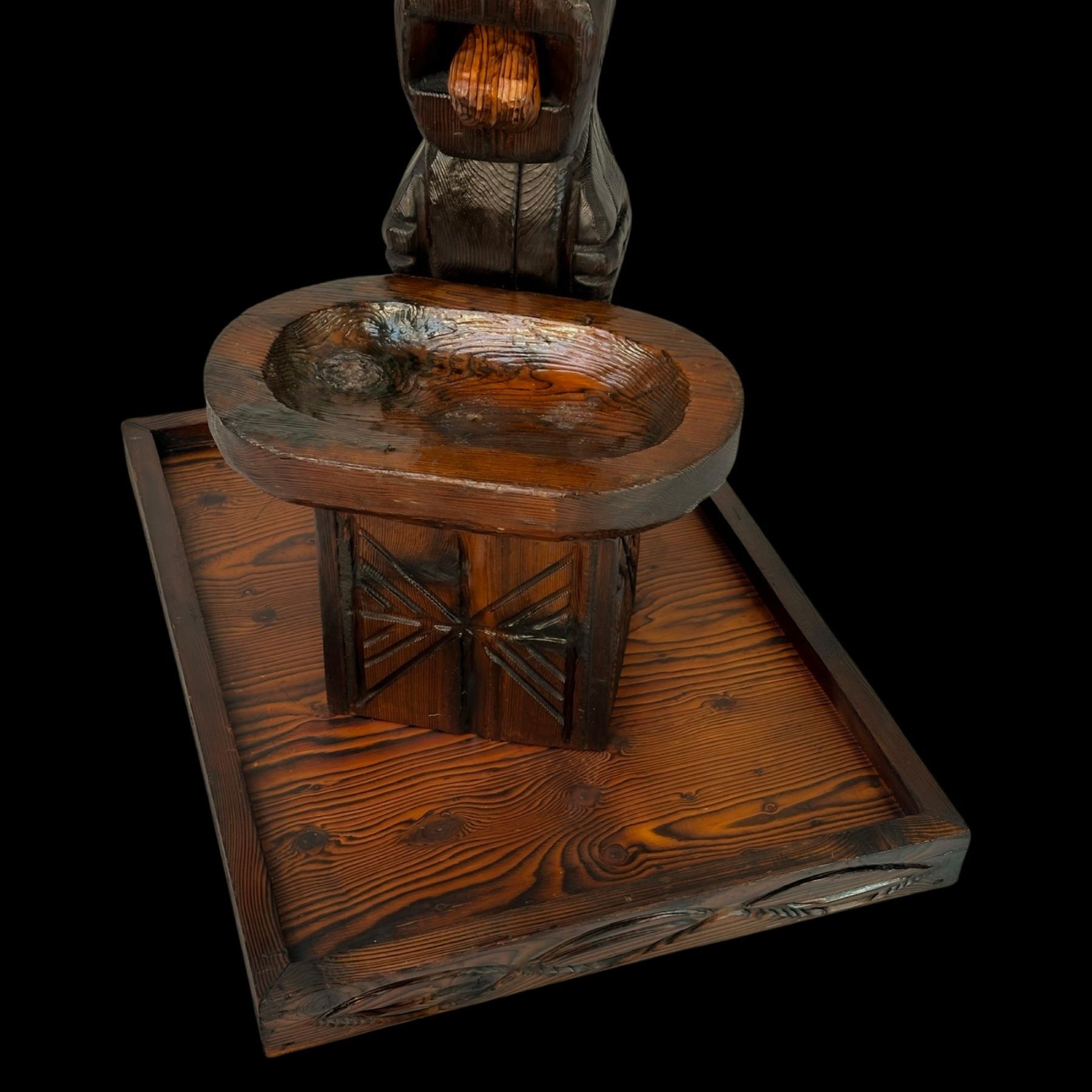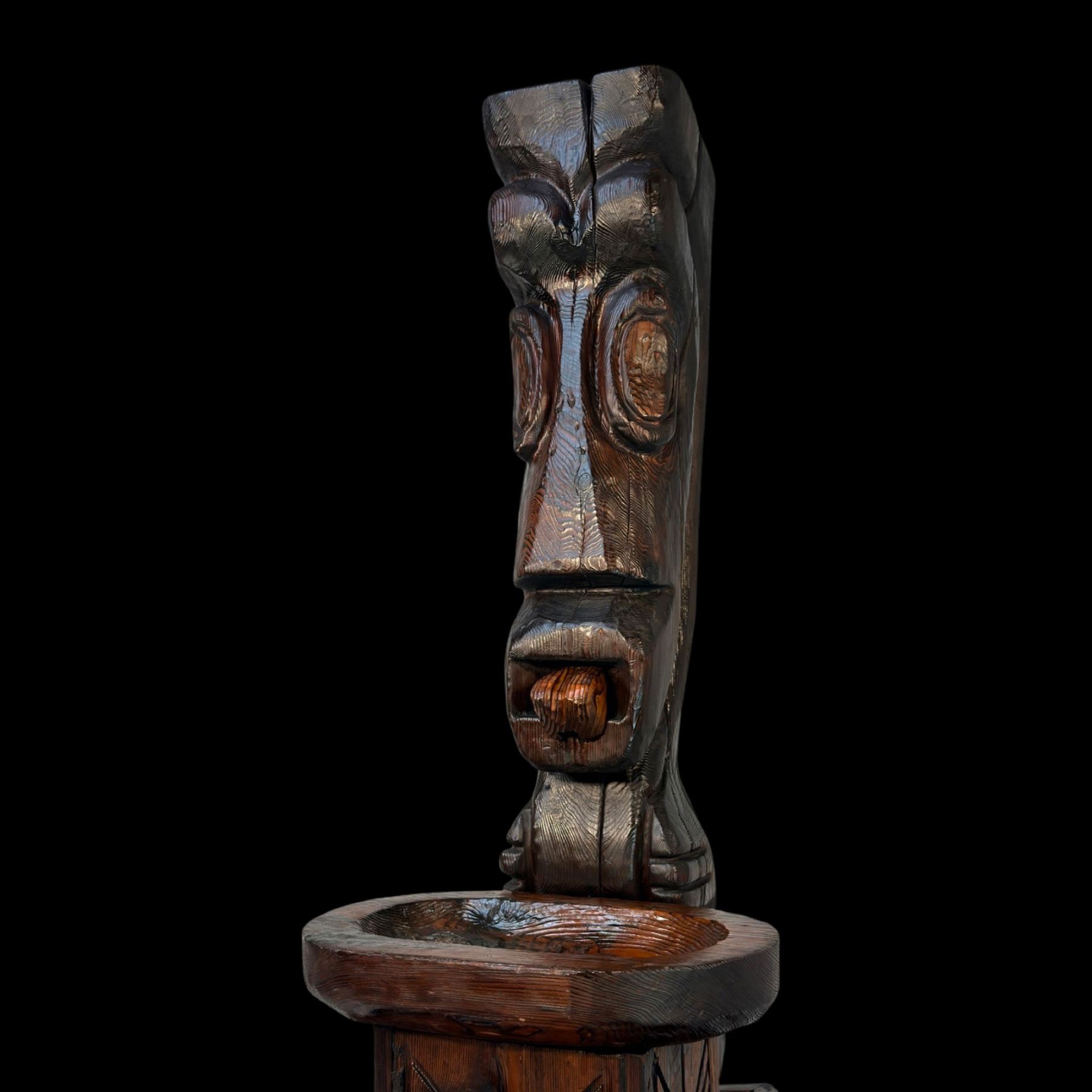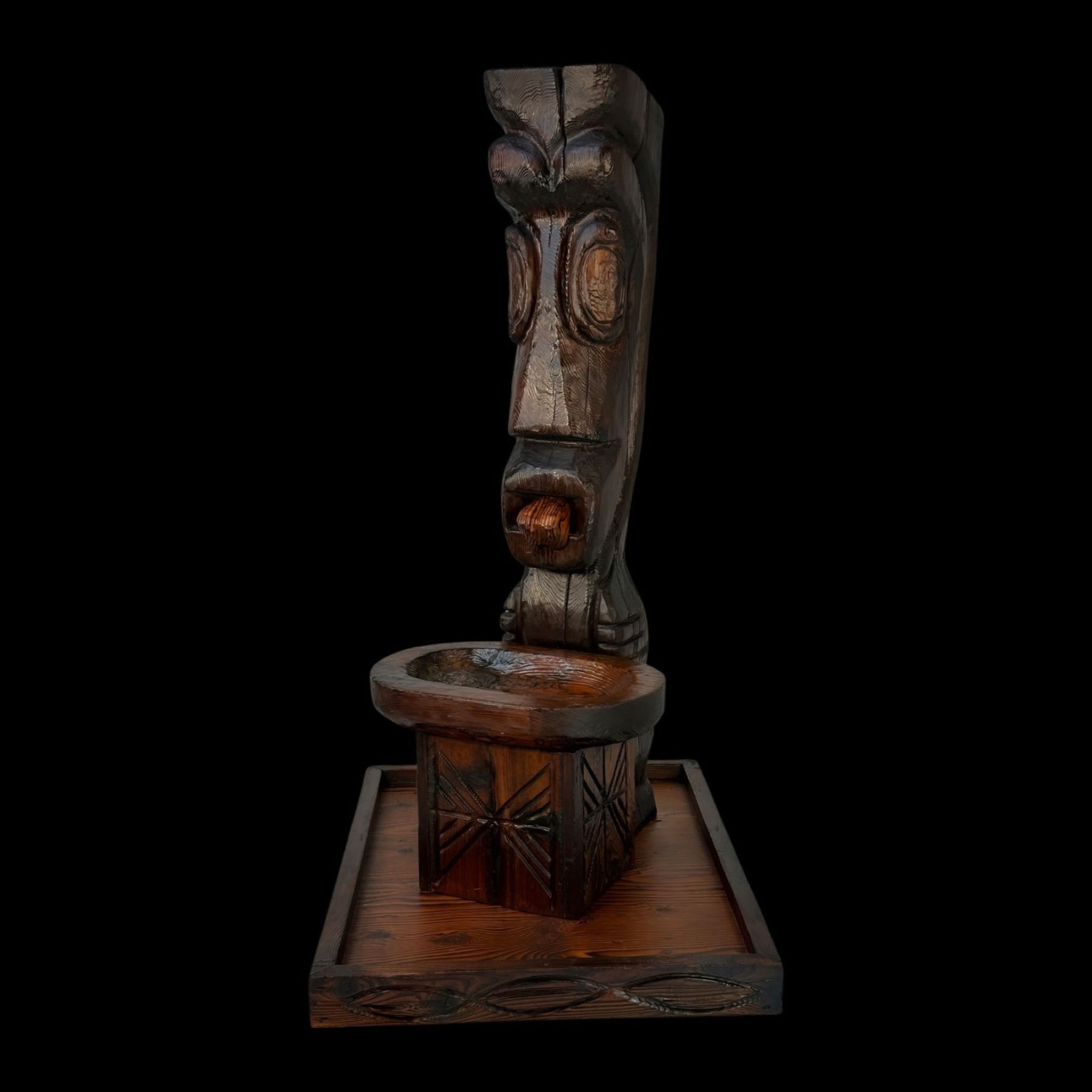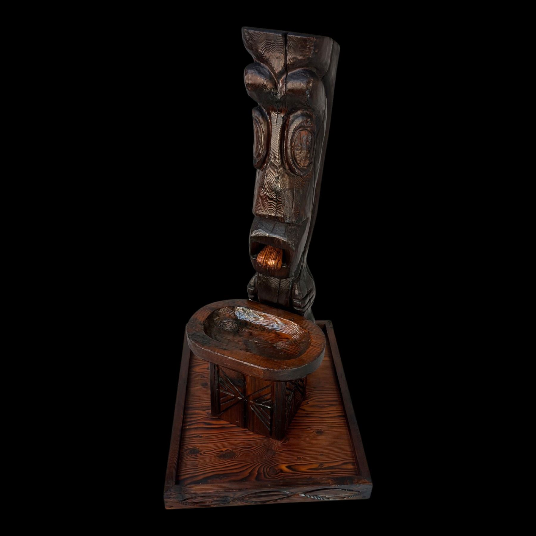 (1960s) The cornerstone of any Witco collection is this impressive carved fountain. Certainly one of the stars of the Witco catalog of products. Utilizing a larger version of the "God of Fortune" Tiki figure, this comes with the Tiki, water bowl, drain box and frame base. Holes are provided for the plumbing and operation is quite easy with a small water pump available on Amazon. Bowl has been top sealed with marine varnish. VG+. This item requires special shipping considerations. 30"x58.5"x40".