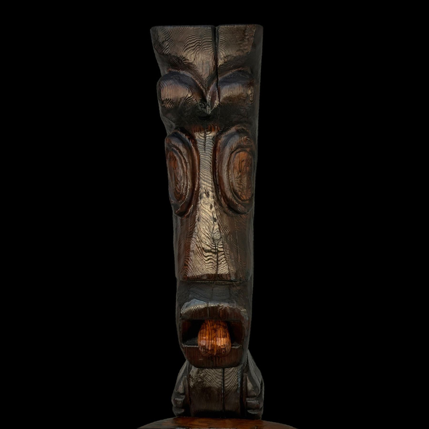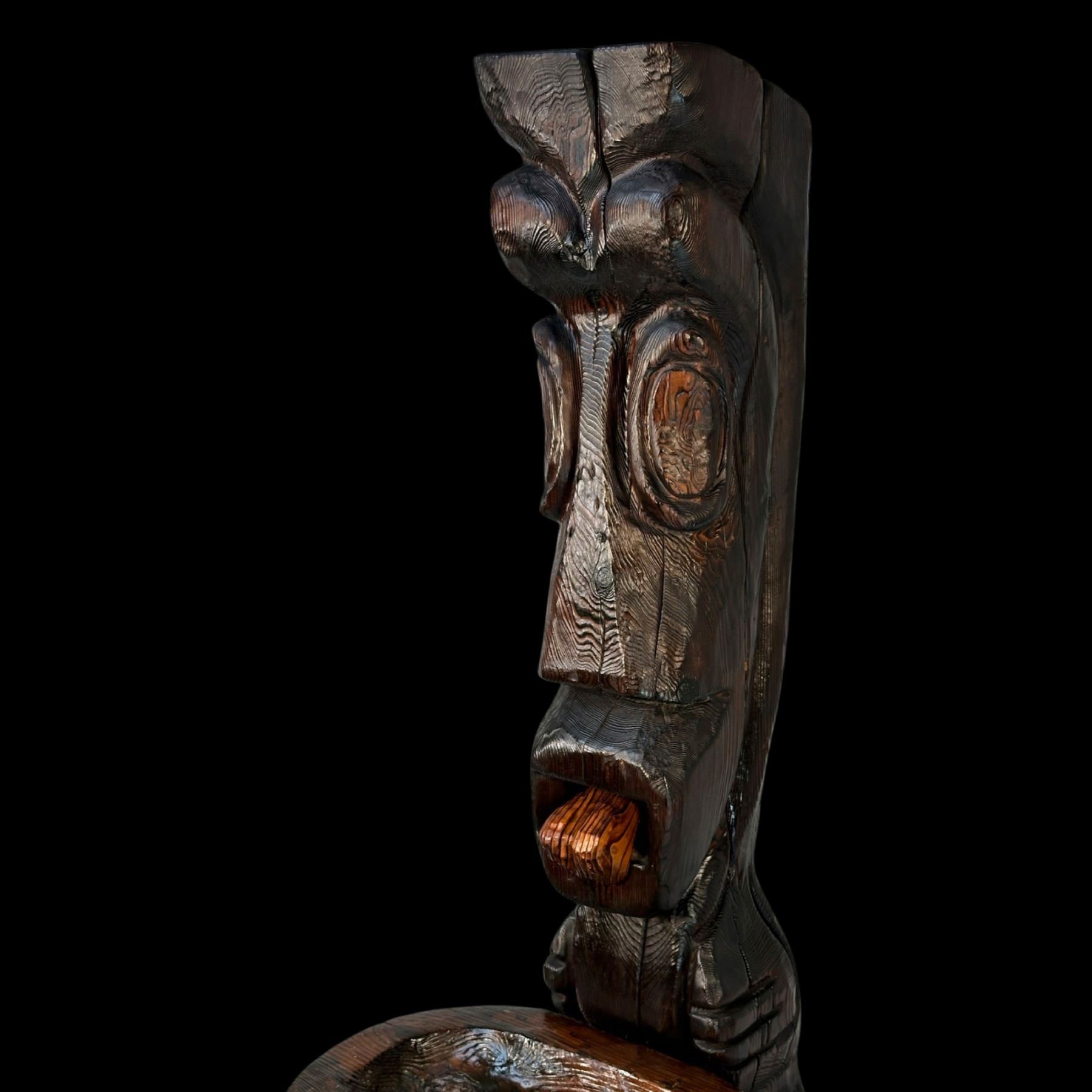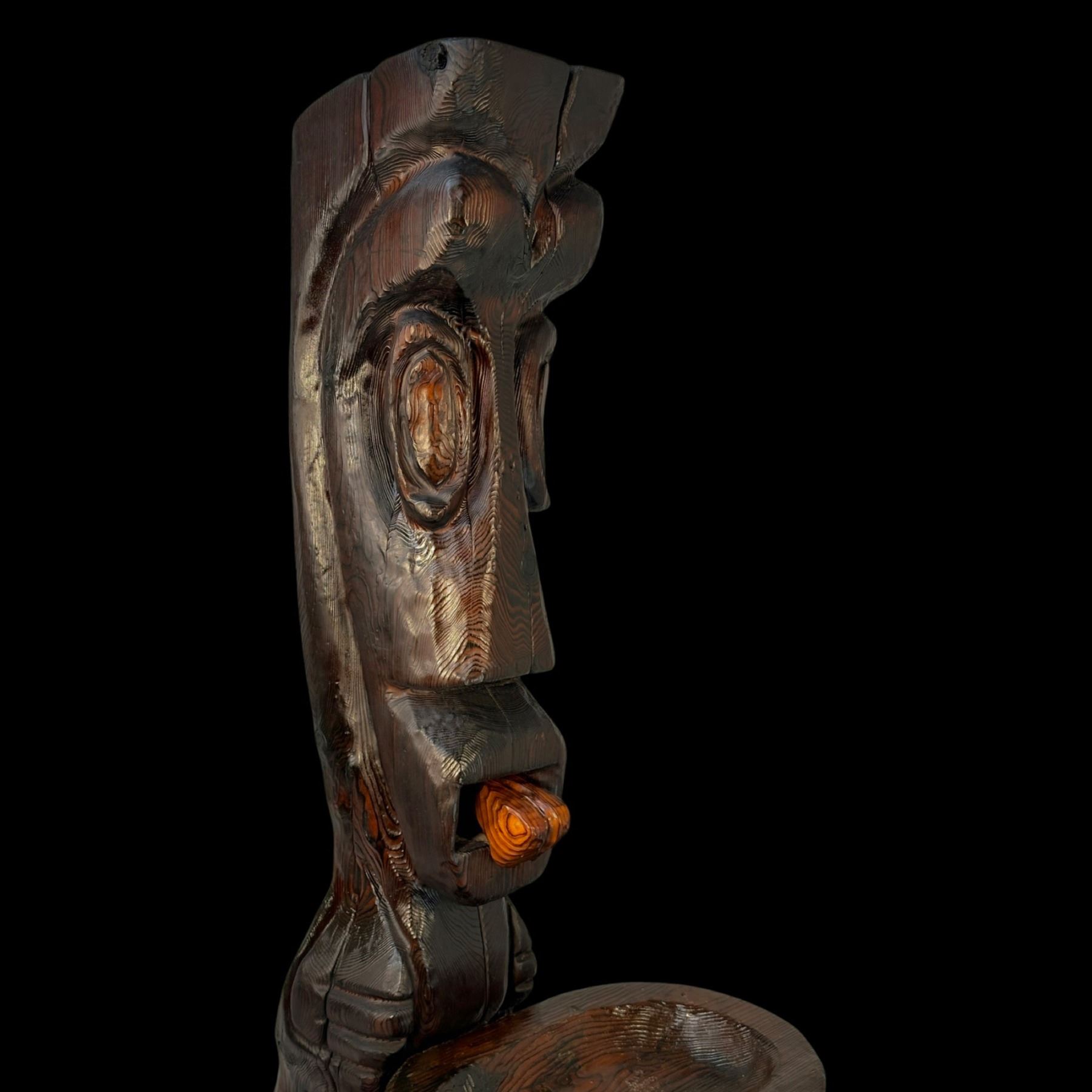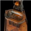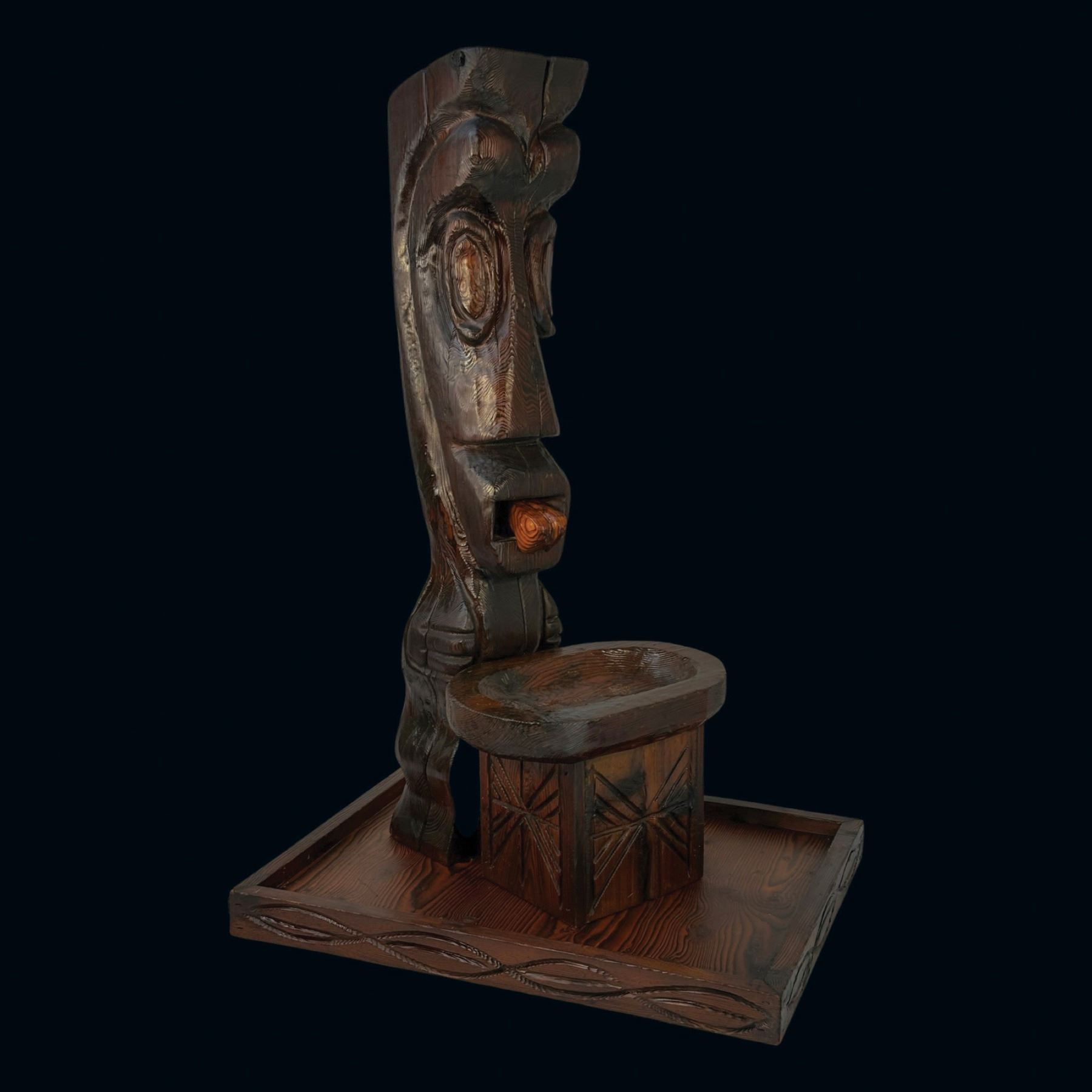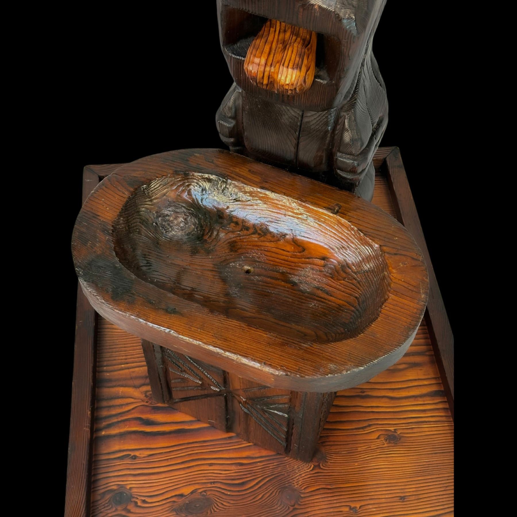 (1960s) The cornerstone of any Witco collection is this impressive carved fountain. Certainly one of the stars of the Witco catalog of products. Utilizing a larger version of the "God of Fortune" Tiki figure, this comes with the Tiki, water bowl, drain box and frame base. Holes are provided for the plumbing and operation is quite easy with a small water pump available on Amazon. Bowl has been top sealed with marine varnish. VG+. This item requires special shipping considerations. 30"x58.5"x40".