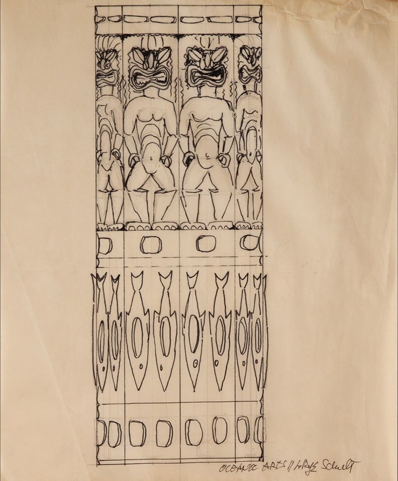 (1960s) A structural column concept drawing featuring a wrap around carving pattern of a Hawaiian Ku God and fish. This type of sketch would work from the architect's plans of the beam and how OA could provide the surround for it. Ink on paper. Signed by LeRoy Schmaltz.15"x11"VG with light folds, edge creasing and light browning
