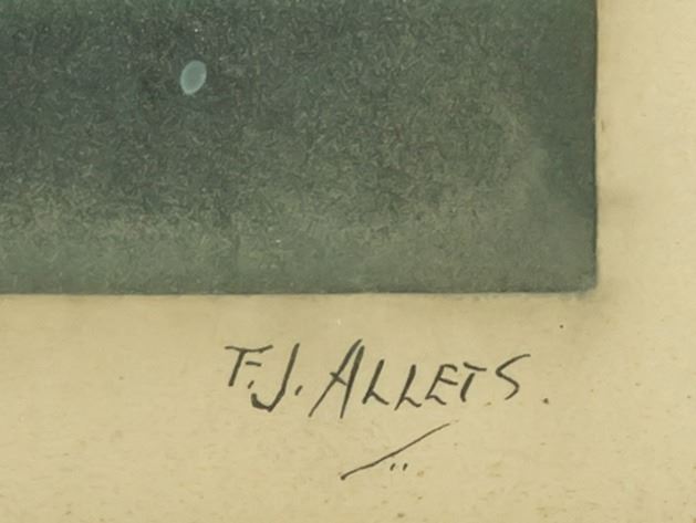 (1950s) Five stately palms against a rich background of a cloud-covered sunset is featured in this charming watercolor painting. Signed F.J. ALLETS on white mat with glass and wood frame. 11.25"x14.25". VG+ with minor wear and foxing to original mat.