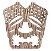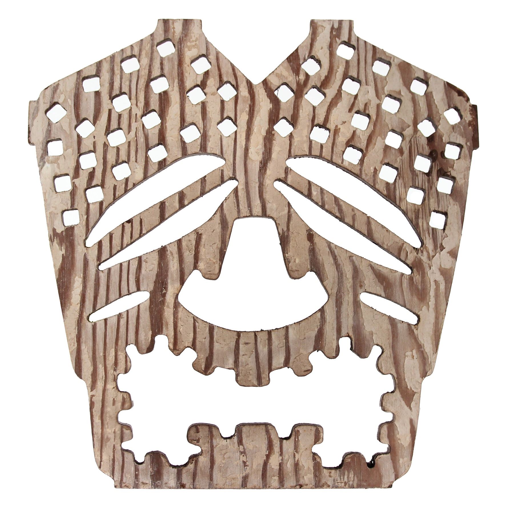 (1950s) Here is a stunning artifact salvaged from the famed, Waikikian Hotel in Honolulu. Perhaps no commercial venture of the Poly-Pop era was more influential and forward thinking as the Waikikian. Designed by star architect Pete Wimberley with installation art by Ed Brownlee, the hotel and it's Tahitian Lanai bar and restaurant were trendsetting to say the least. Inspired by Polynesian tribal Tiki masks, these were installed in the guest rooms throughout the hotel as breezeway screens that framed the hotel balconies. They can be seen in the brochures of the period and several designs were randomly placed throughout the resort. These were rescued from the demolition of the complex which made way for a modern timeshare tower. Wood punch stamped Tiki wall hanging. 14"x14". VG