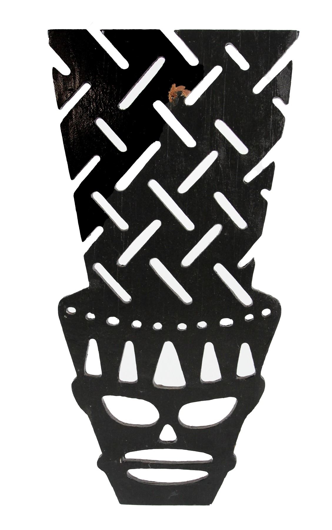 (1950s) Here is a stunning artifact salvaged from the famed, Waikikian Hotel in Honolulu. Perhaps no commercial venture of the Poly-Pop era was more influential and forward thinking as the Waikikian. Designed by star architect Pete Wimberley with installation art by Ed Brownlee, the hotel and it's Tahitian Lanai bar and restaurant were trendsetting to say the least. Inspired by Polynesian tribal Tiki masks, this astonishing, mid century stylization creates a bold, stark image incorporating the feathered headdress upon a Tiki god. These were installed in the guest rooms throughout the hotel as breezeway screens that framed the hotel balconies. They can be seen in the brochures of the period and several designs were randomly placed throughout the resort. These were rescued from the demolition of the complex which made way for a modern timeshare tower. Carved and painted wood. 14.25"x7". VG some minor wear with small drill hole.