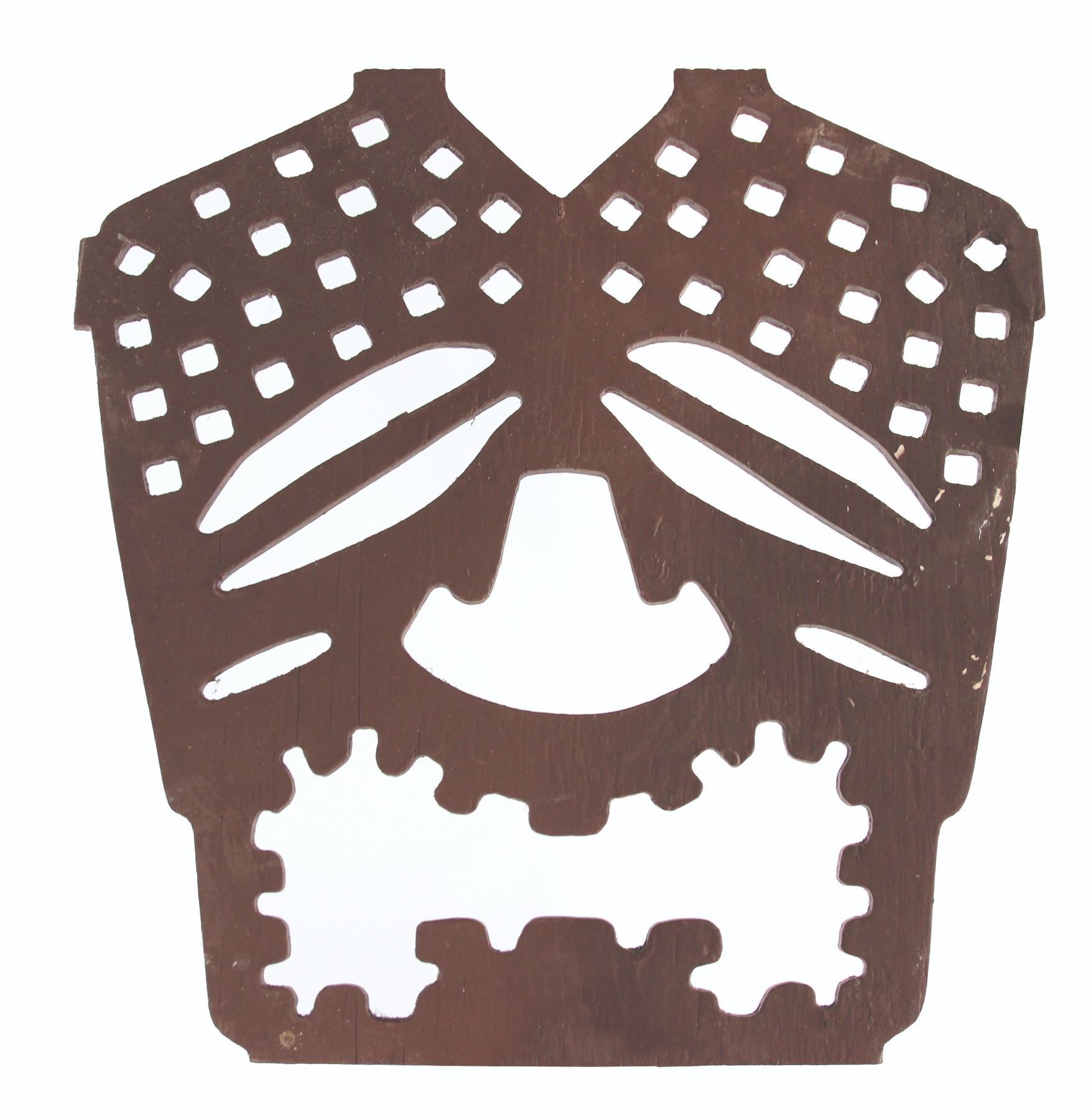 (1950s) Here is a stunning artifact salvaged from the famed, Waikikian Hotel in Honolulu. Perhaps no commercial venture of the Poly-Pop era was more influential and forward thinking as the Waikikian. Designed by star architect Pete Wimberley with installation art by Ed Brownlee, the hotel and it's Tahitian Lanai bar and restaurant were trendsetting to say the least. Inspired by Polynesian tribal Tiki masks, these were installed in the guest rooms throughout the hotel as breezeway screens that framed the hotel balconies. They can be seen in the brochures of the period and several designs were randomly placed throughout the resort. These were rescued from the demolition of the complex which made way for a modern timeshare tower. Wood punch stamped Tiki wall hanging.14"x14". VG some white spots.