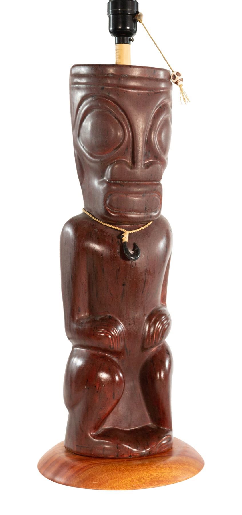 Captivating wooden Tiki God cast table lamp features a metal fishing hook necklace with skull pull chain. This was purchased at a commercial liquidation sale in Hawaii. Resort unknown. The lamp was refurbished by Tiki J (Jason) Lamps with new wiring, skull pull cord and ceremonial fishing hook. Fully functional lamp resting on solid wood base. 22.75"x8". VG+.