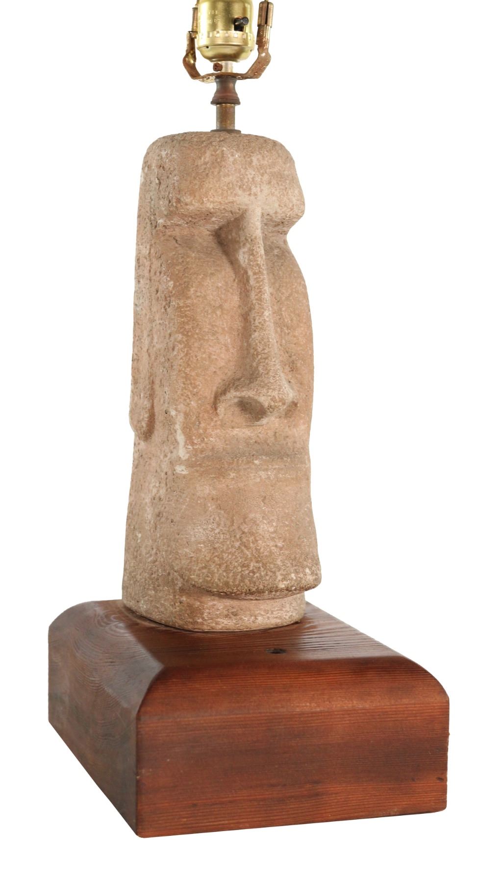 (1950s) Solid cast stone table lamp features a classic MOAI Tiki God placed on a solid wood base. This gorgeous piece was rescued from the Waikikian Hotel before its closure. Fully functional lamp with electric cord and lamp features. No shade. 19"x7.25"x8.25". VG+.