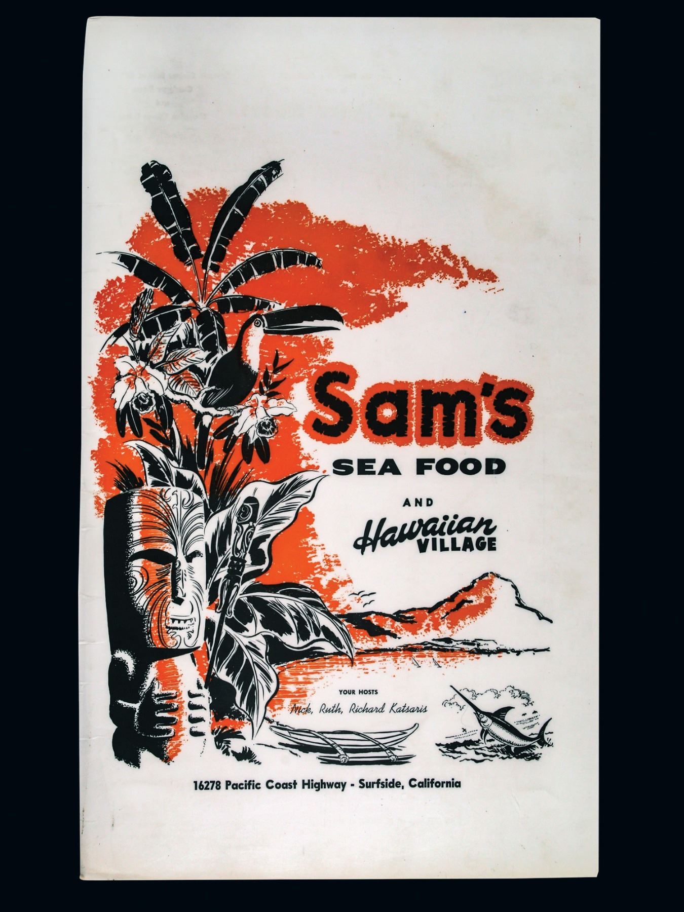 (1950s)* Full restaurant menu for the Surfside, CA restaurant. VG+ with light creasing and food staining. 10.75"x17.5" closed.