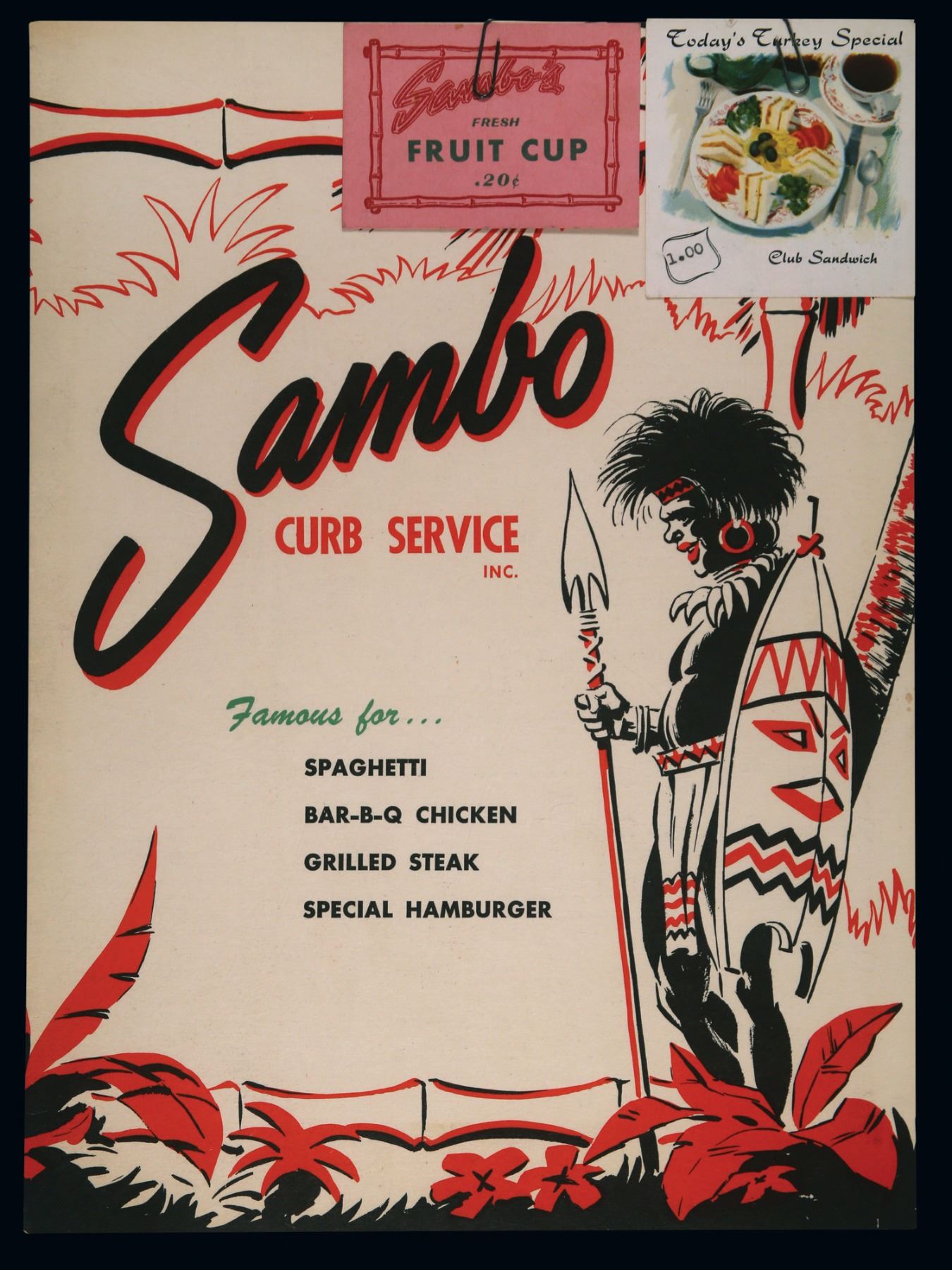 (1950s) No relation to better-known Sambo's coffee shops, this Restaurant menu features a warrior graphic across it's cover. No specific location indicated, but all items are listed in English and French. VG+. 9"x12" closed.