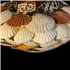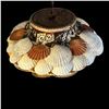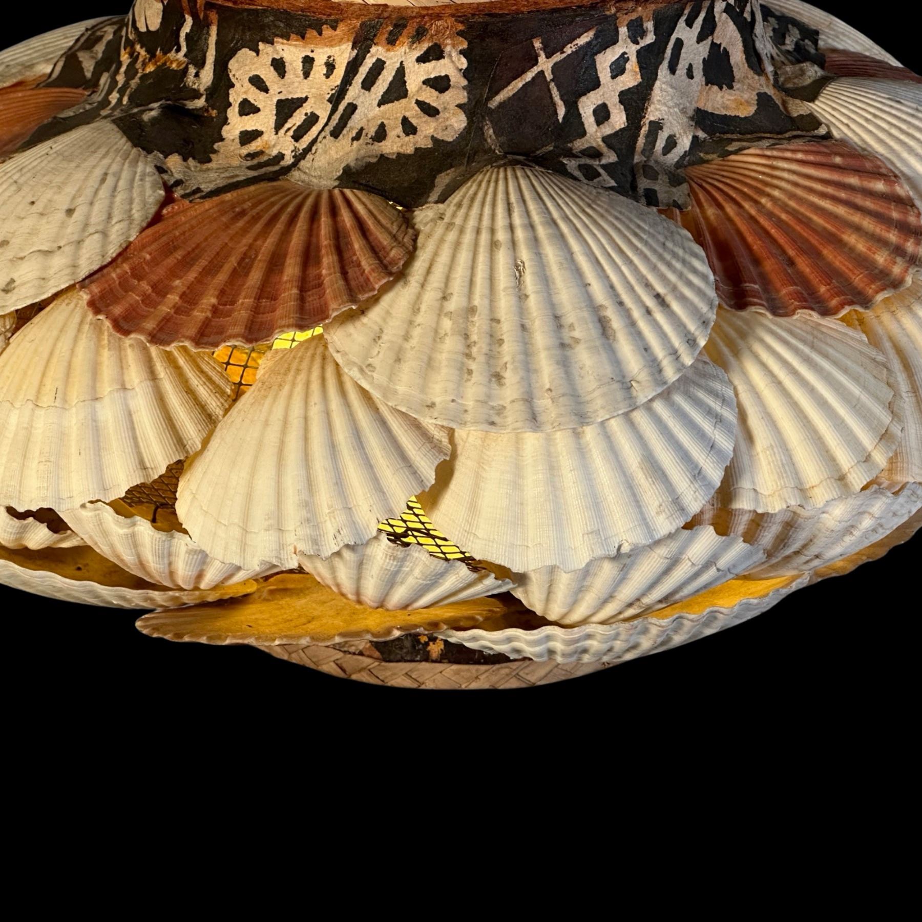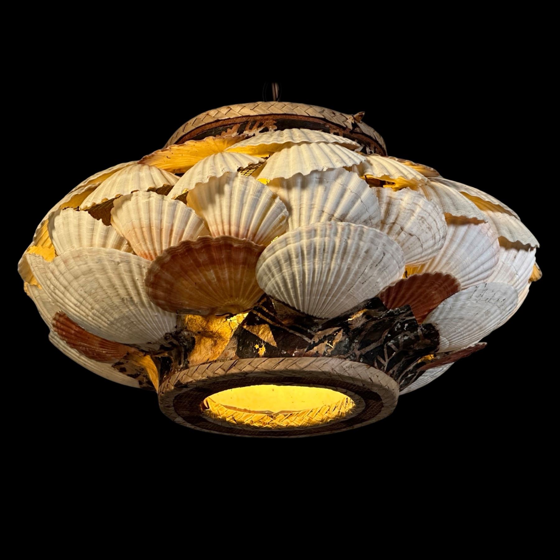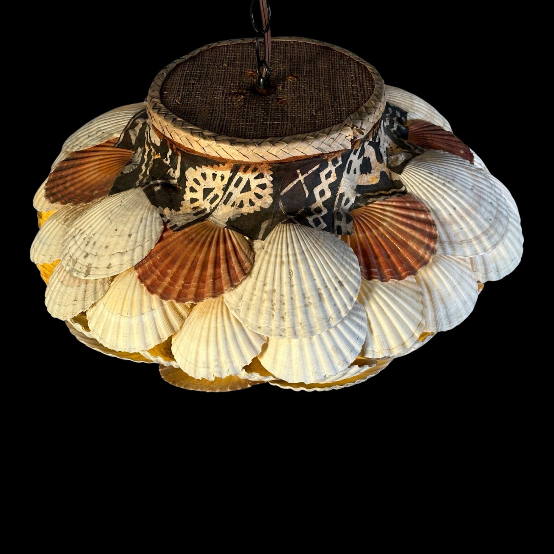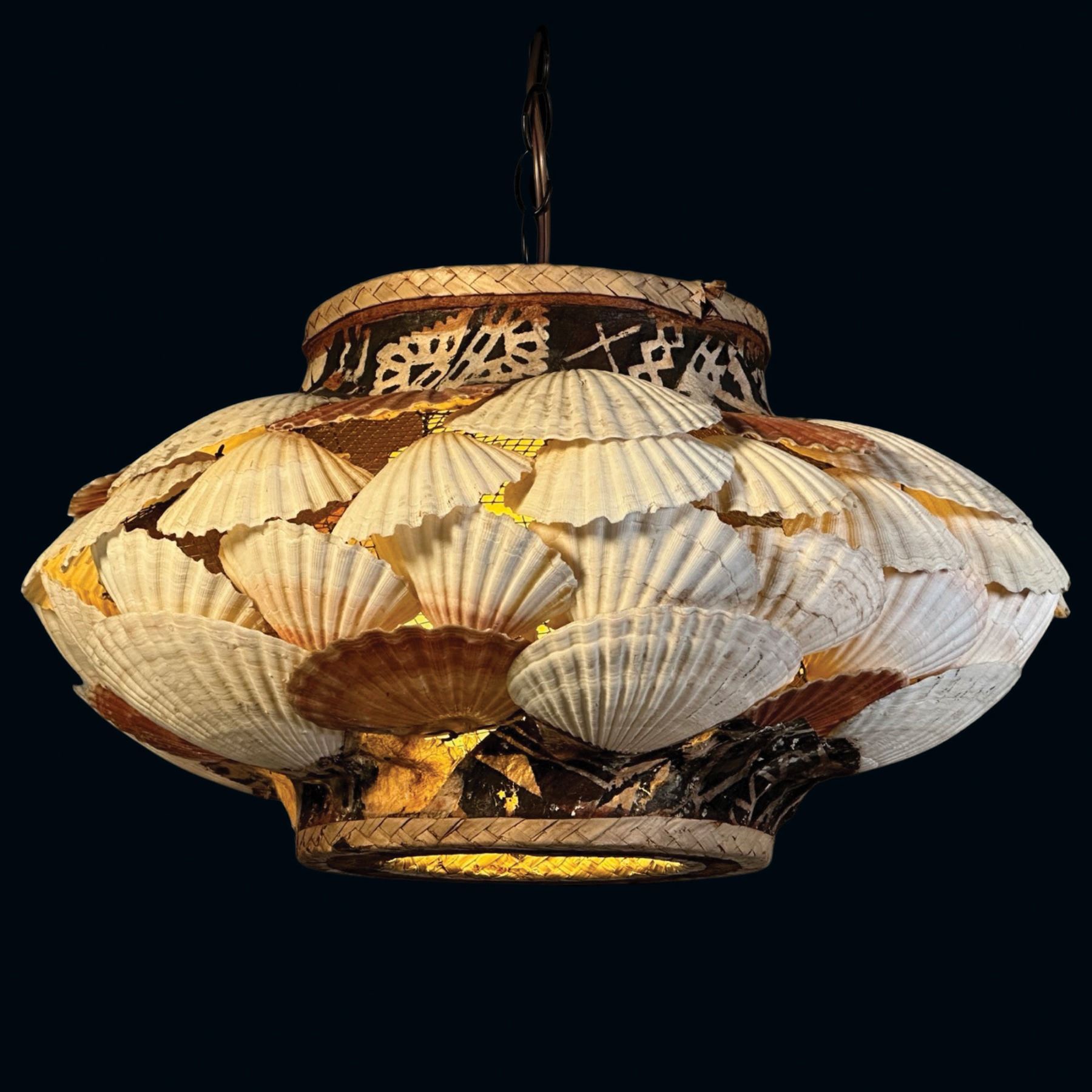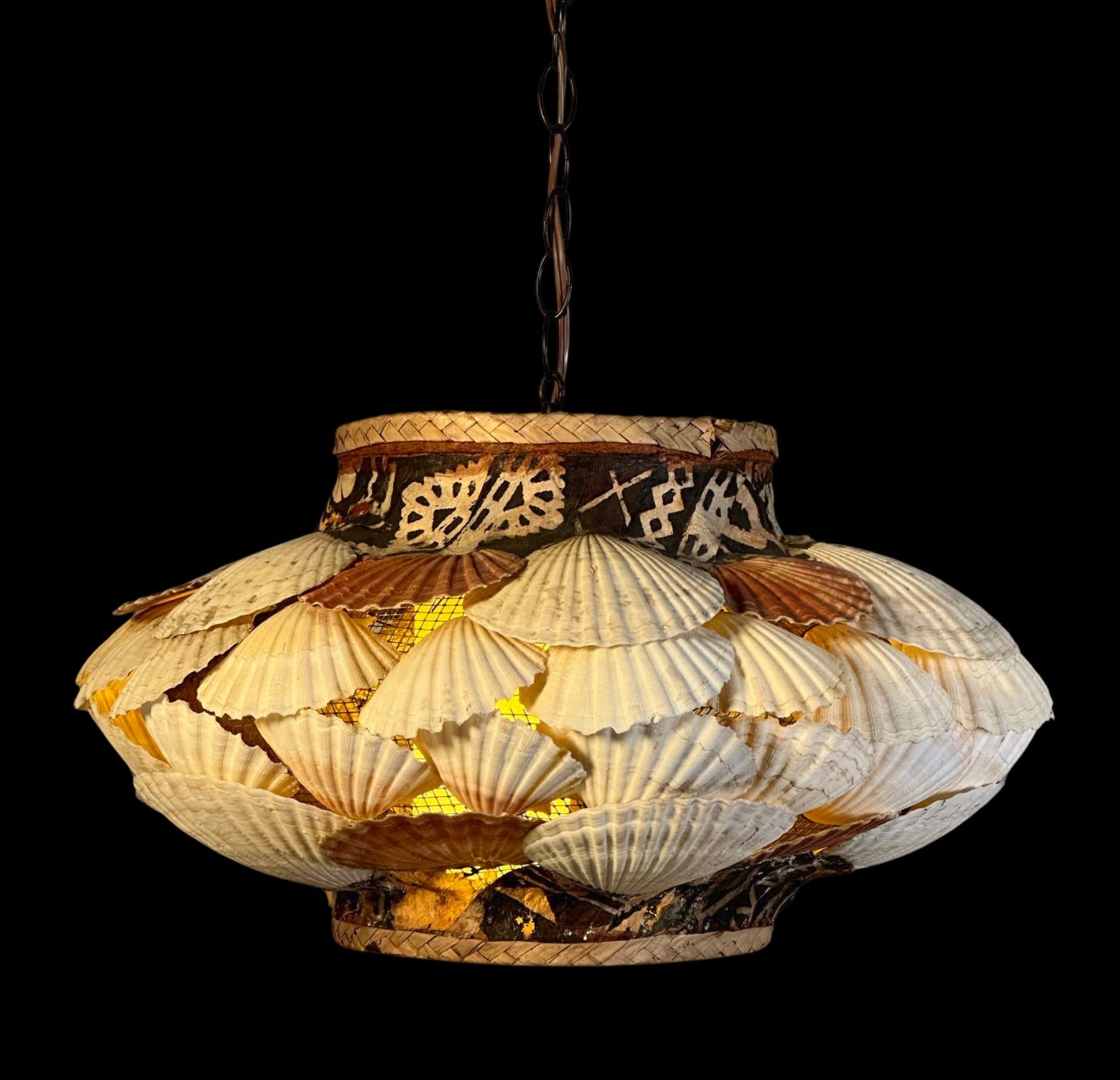 (1960s) An incredible original Sea & Jungle scallop shell lamp very much in the vein of the Oceanic Arts scallop shell lamps. Barbara Tobeckson was the very talented wife of Tiki designer, Toby Tobeckson (Designs by TOBY). She was employed by Sea & Jungle to add to their catalog of Polynesian inspired offerings. Barbara also did a good deal of the bamboo and resin lamps which were eventually sent to Taiwan and China for assembly line replication in the Orchids of Hawaii line of lighting. This is one of her late 50s to early 60s designs. A combination of large scallop "bake" shells, wood and tapa cloth. VG+ with typical wear. 23"dia x12".