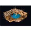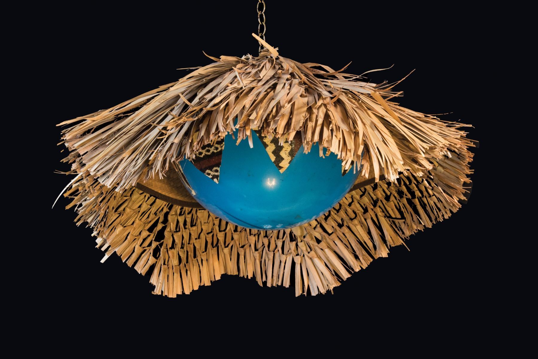 (1960s) A blue plastic fishing float with tapa accents and a palapa topped shade. 11"x20". VG+ with typical wear.