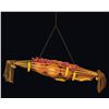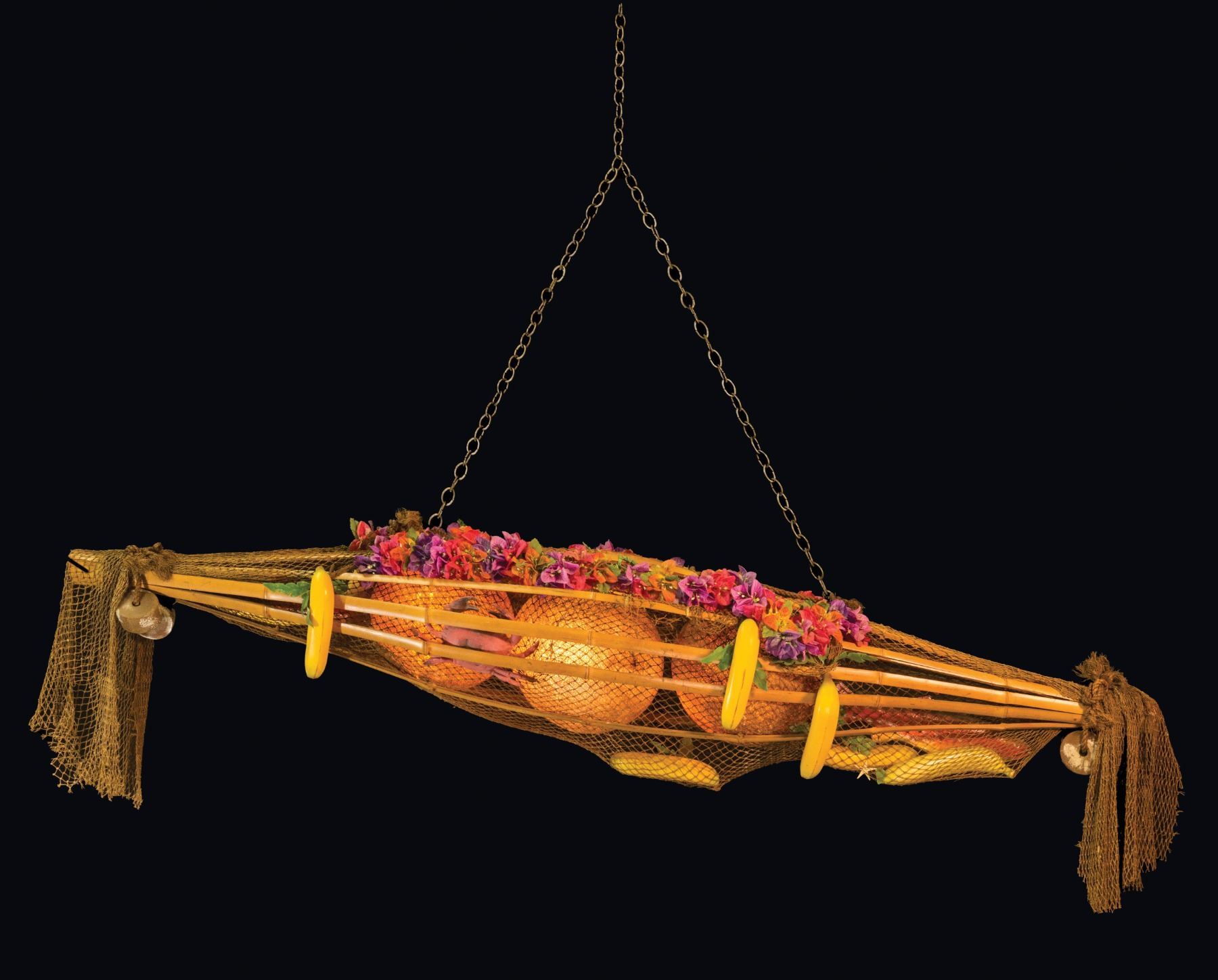 (1960s) Perhaps no other lamp embodies the kitsch impressionism of the Poly-Pop movement more than this stunner by Sea & Jungle in Glendale, CA. A Tahitian Fish Trap frame is filled with the theme of bounty: fish nets, cork floats, plastic sea life, flowers and fern leaves. Fiberglass resin gravel shades supply the central lighting element. Again, saved perhaps only as this was a display sample from the Sea & Jungle showroom. 11"x64"x11". VG+ with typical wear.