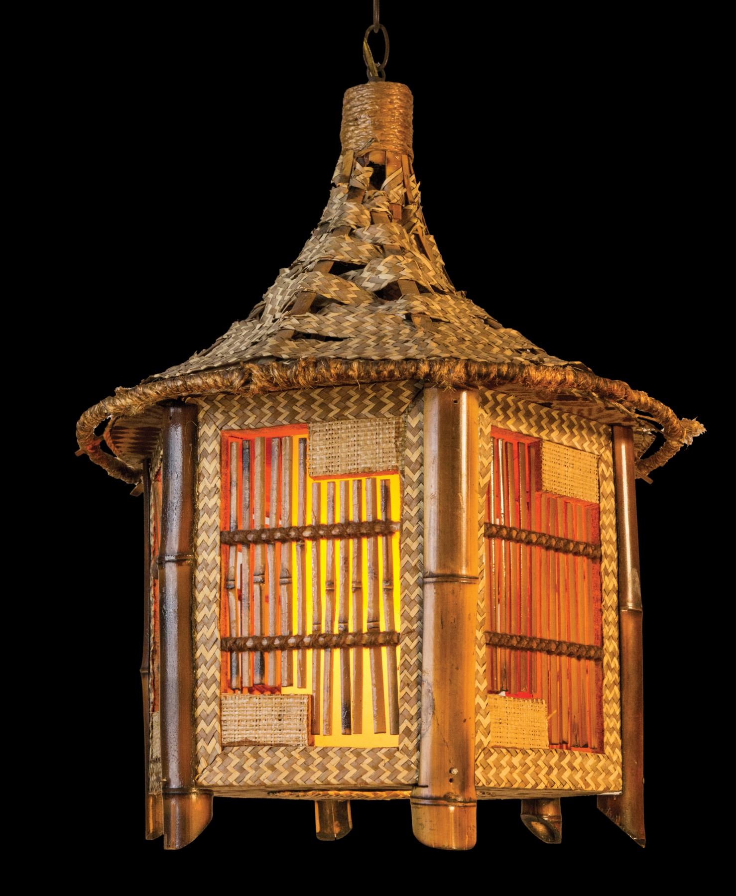 (1960s) Six sided hut structural lamp with cane door panels. 23"x17" VG+ with typical wear.