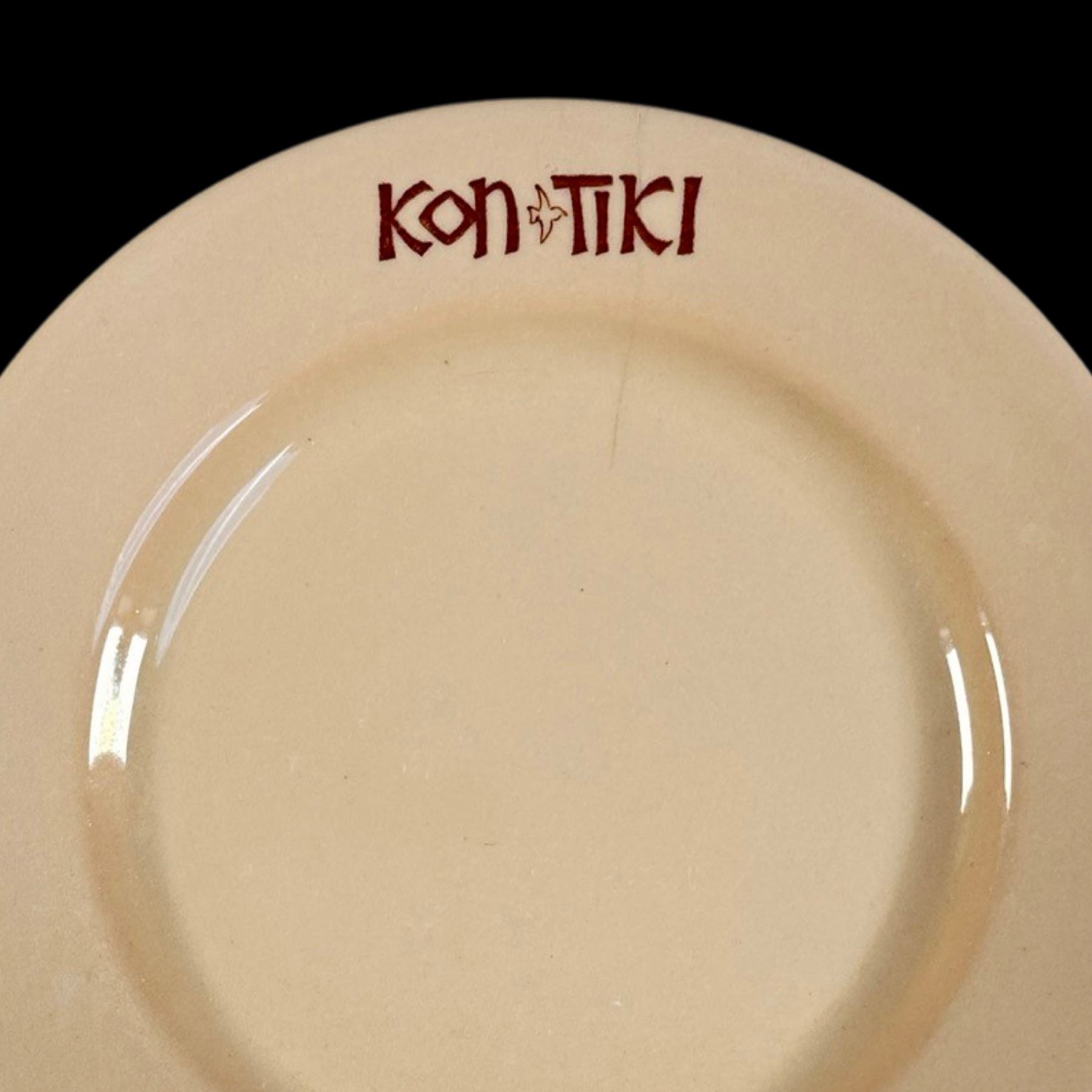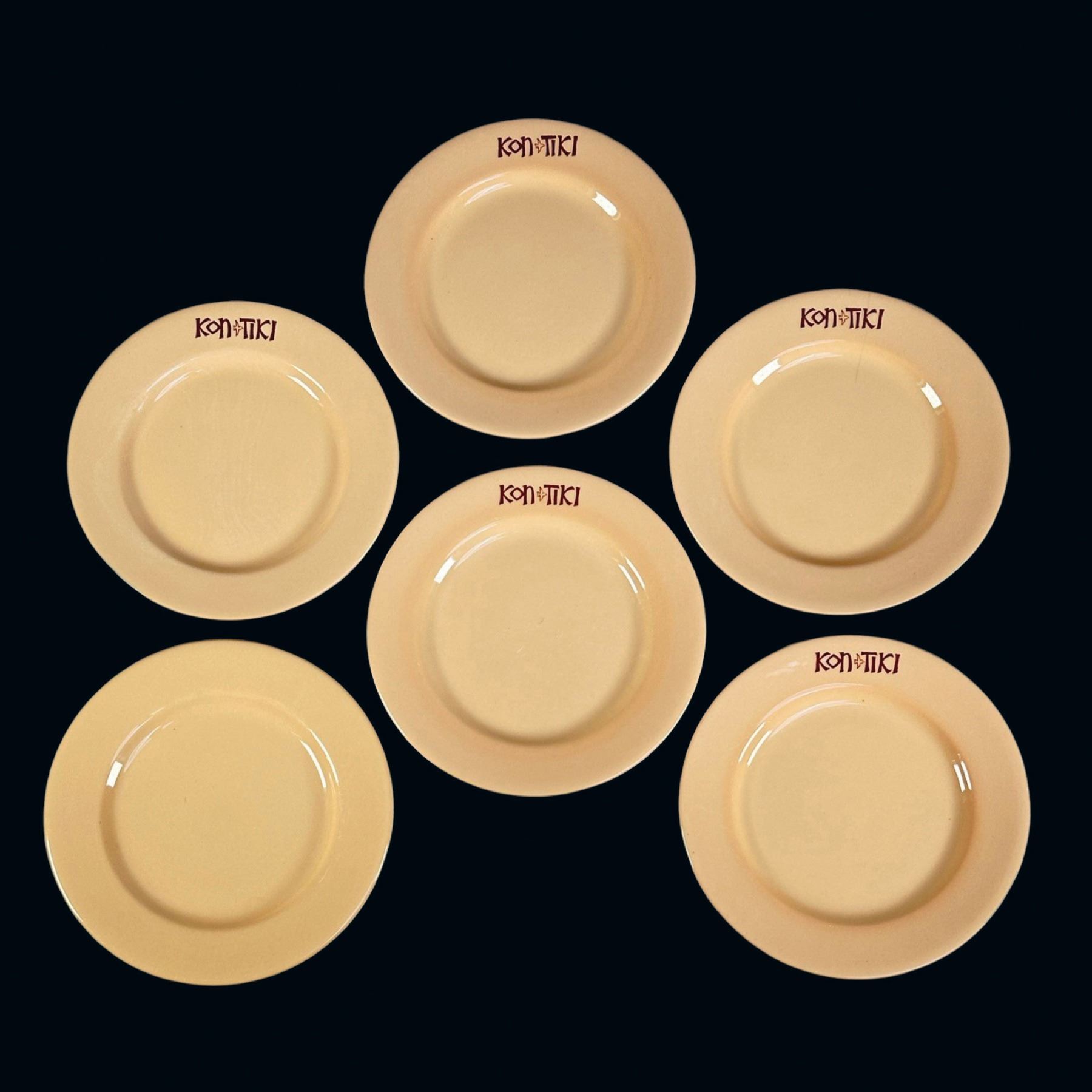 (1960s) Nice set of six side dishes from Steve Crane's first chain of restaurants for Sheraton Hotels. One plate does NOT have the KON-TIKI logo but comes with the set. VG+. 6.25"dia each.