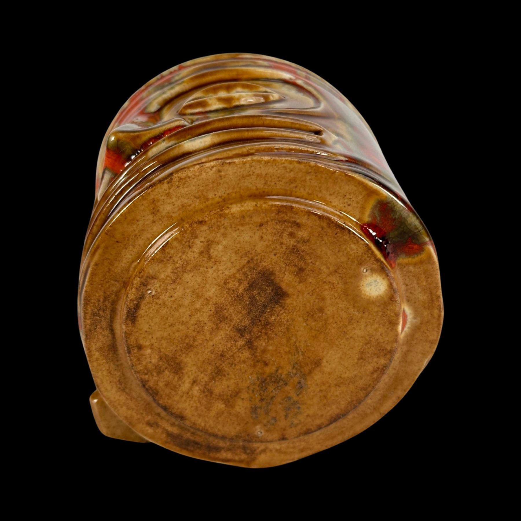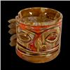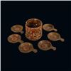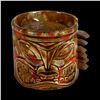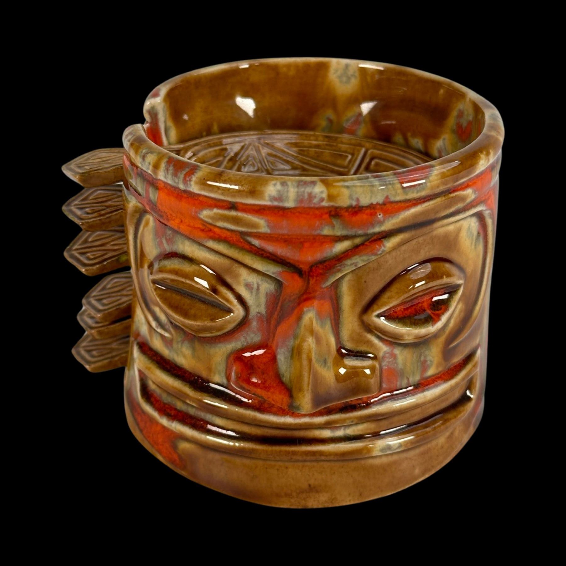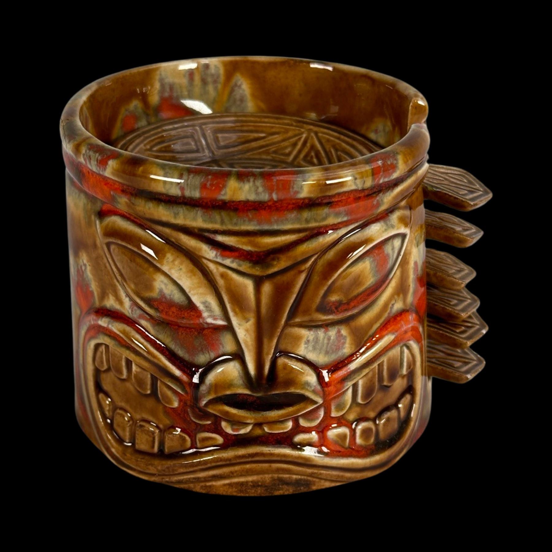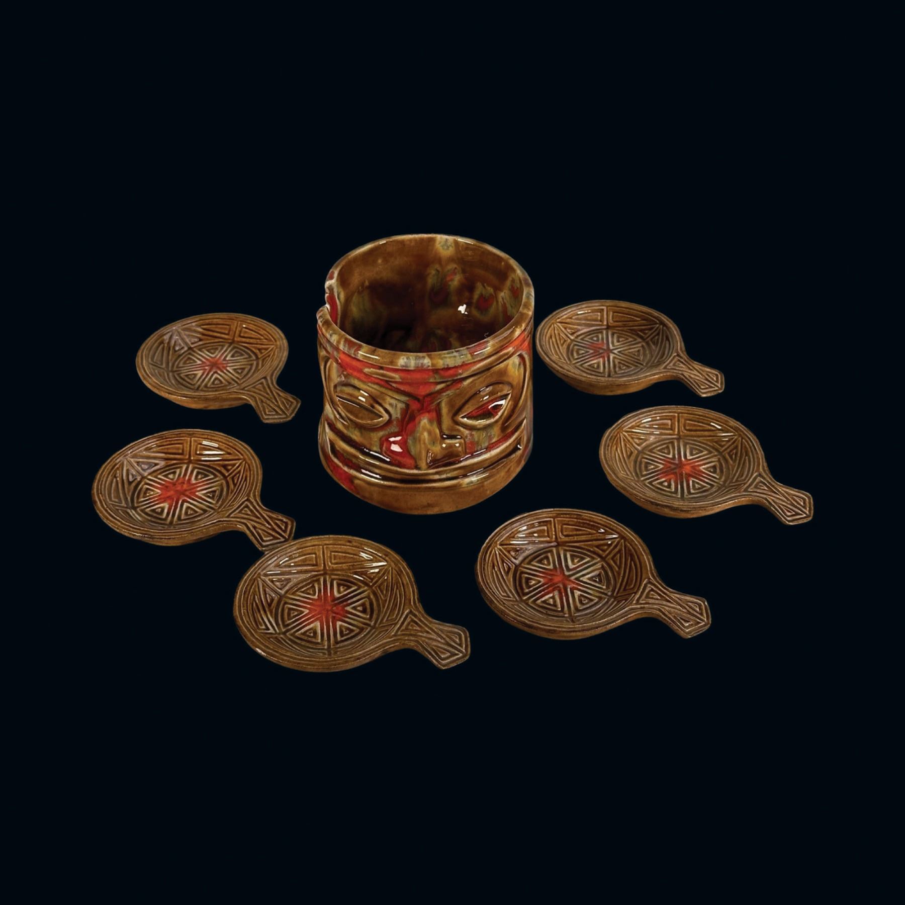 (1960s)* Psychedelic set of small dishes set into a Tiki head holder. Small flea bite chips on some handle edges. Displayed at the Musee Quai Branly. Published in Tiki Pop page 19. VG+. 4"dia x 3" in holder.