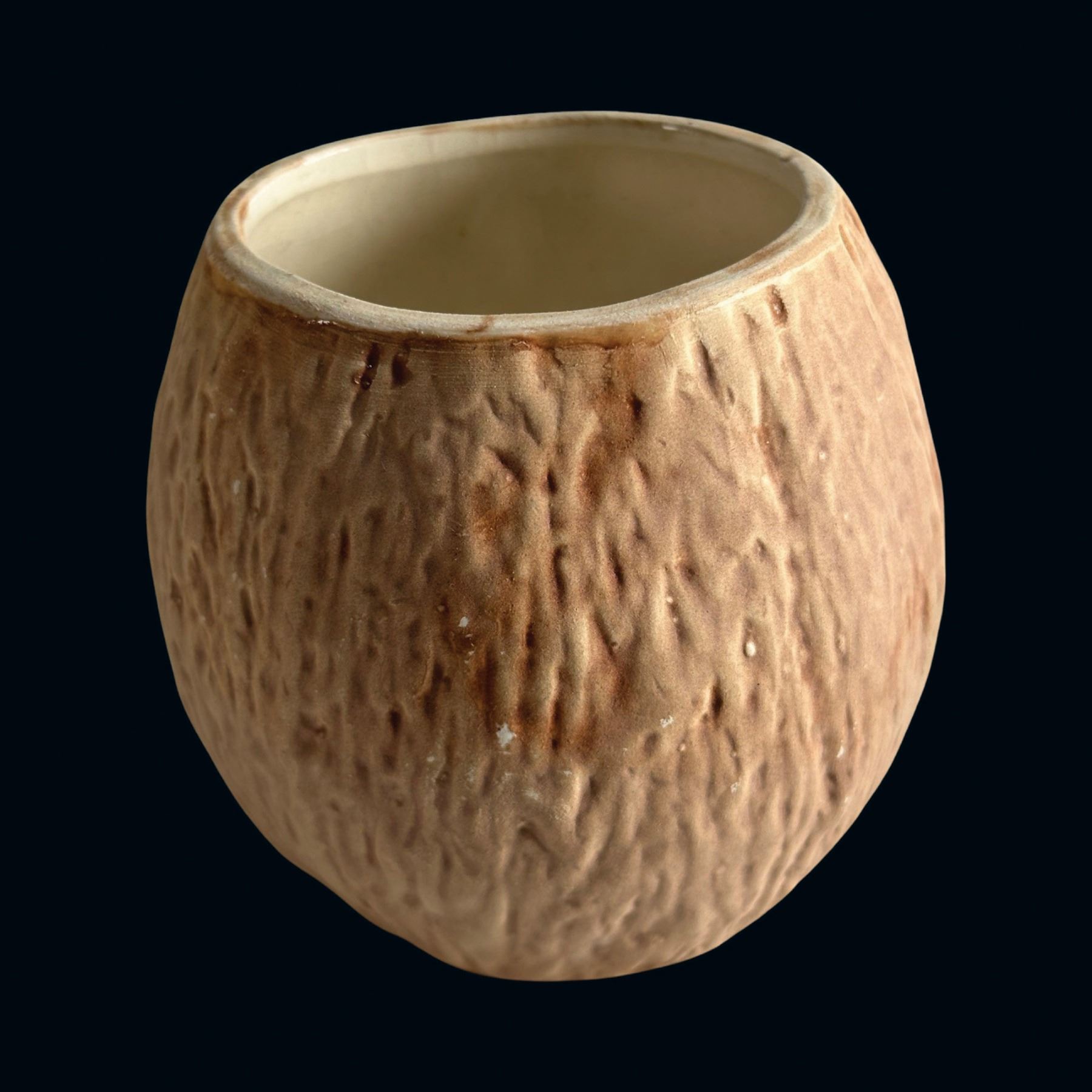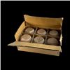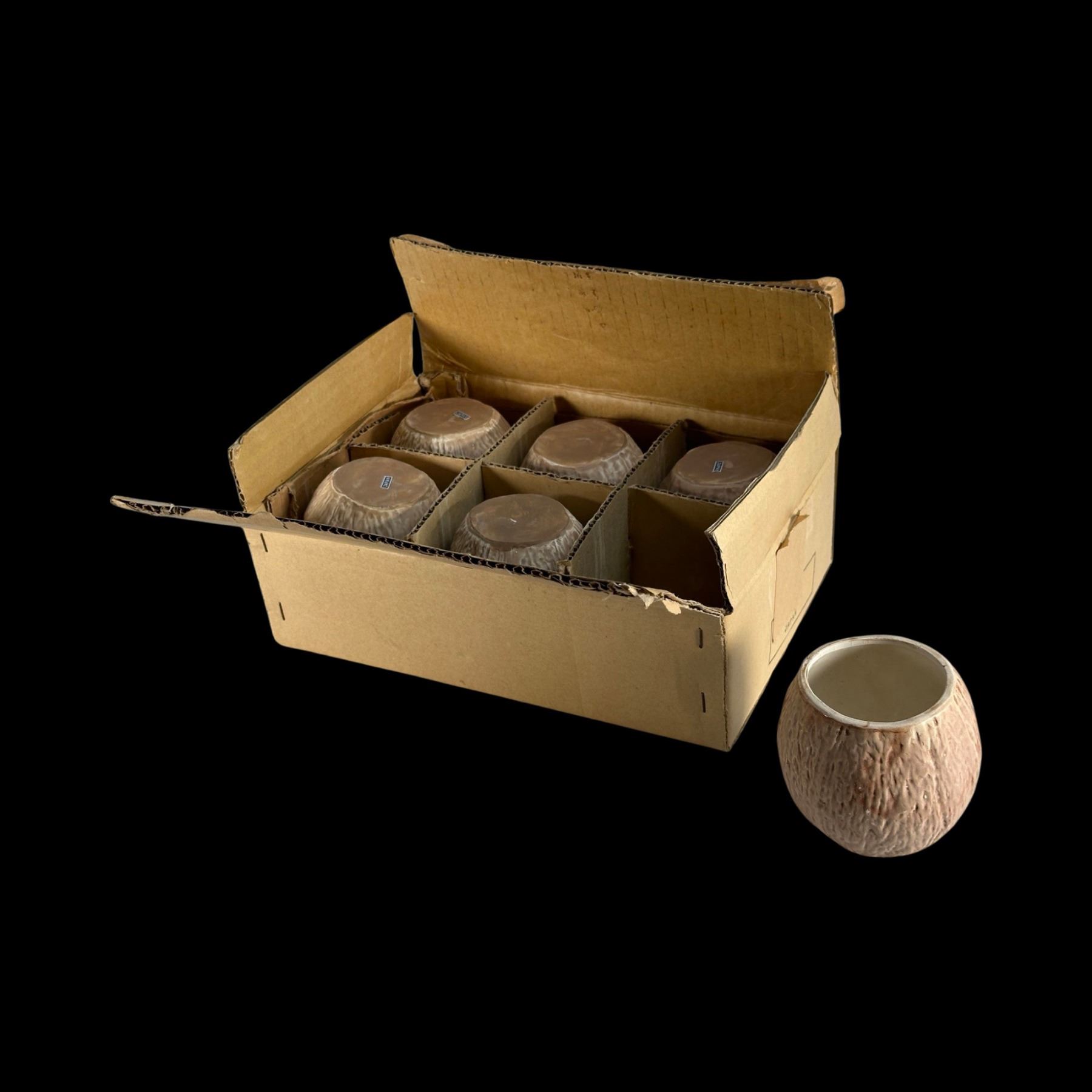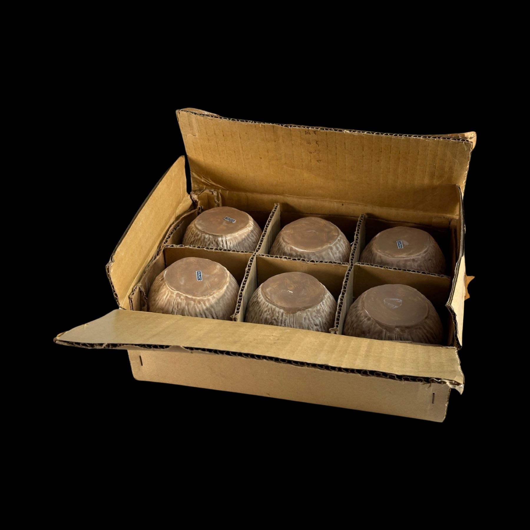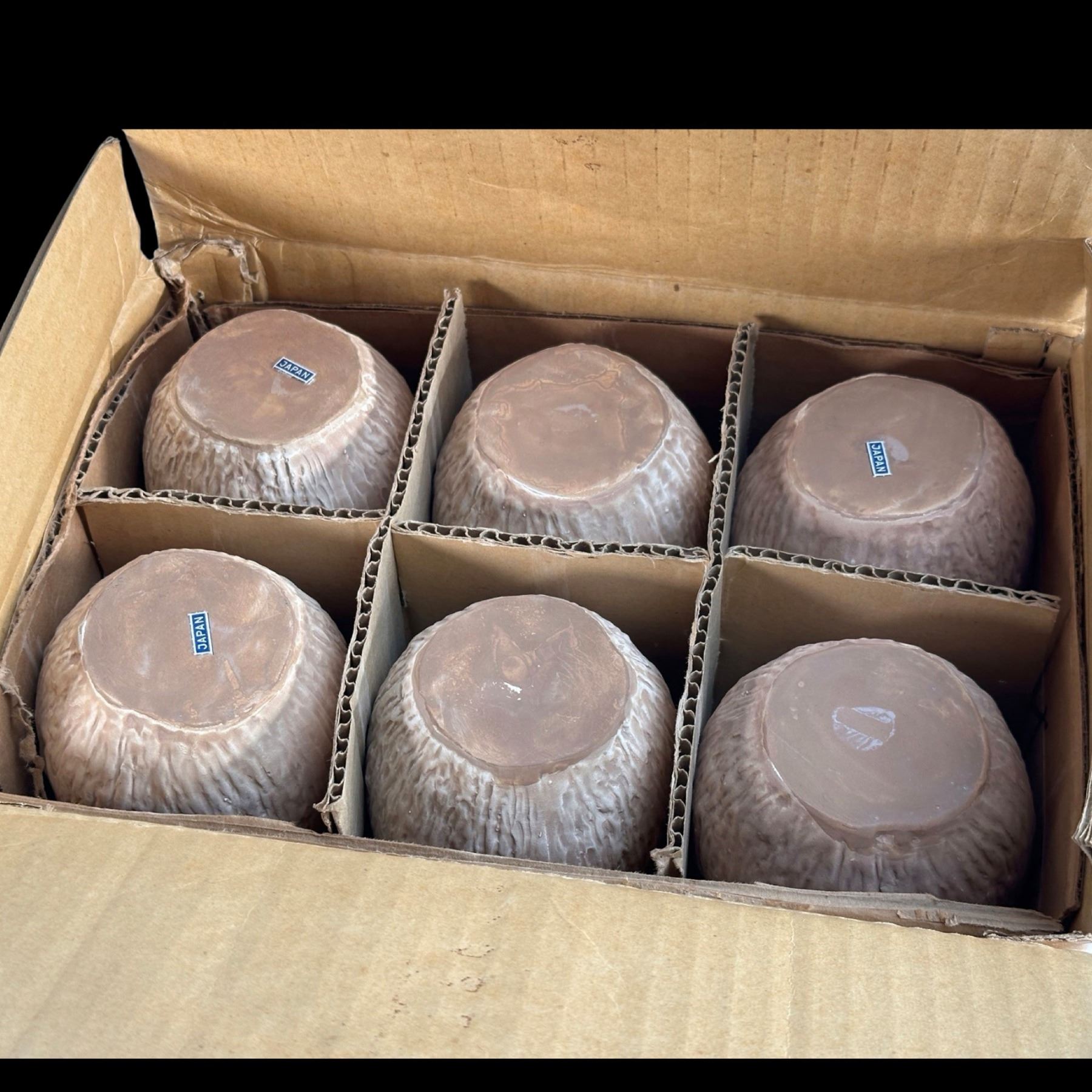 (1950s) Very likely Otagiri mugs still in their shipping box with dividers. Some retain paper JAPAN label. Raw glaze on the six mugs. VG+ with typical wear. 3.5"dia x 3.5" each.