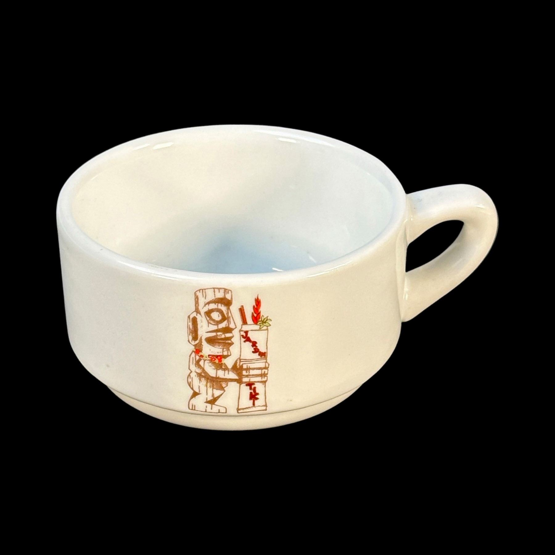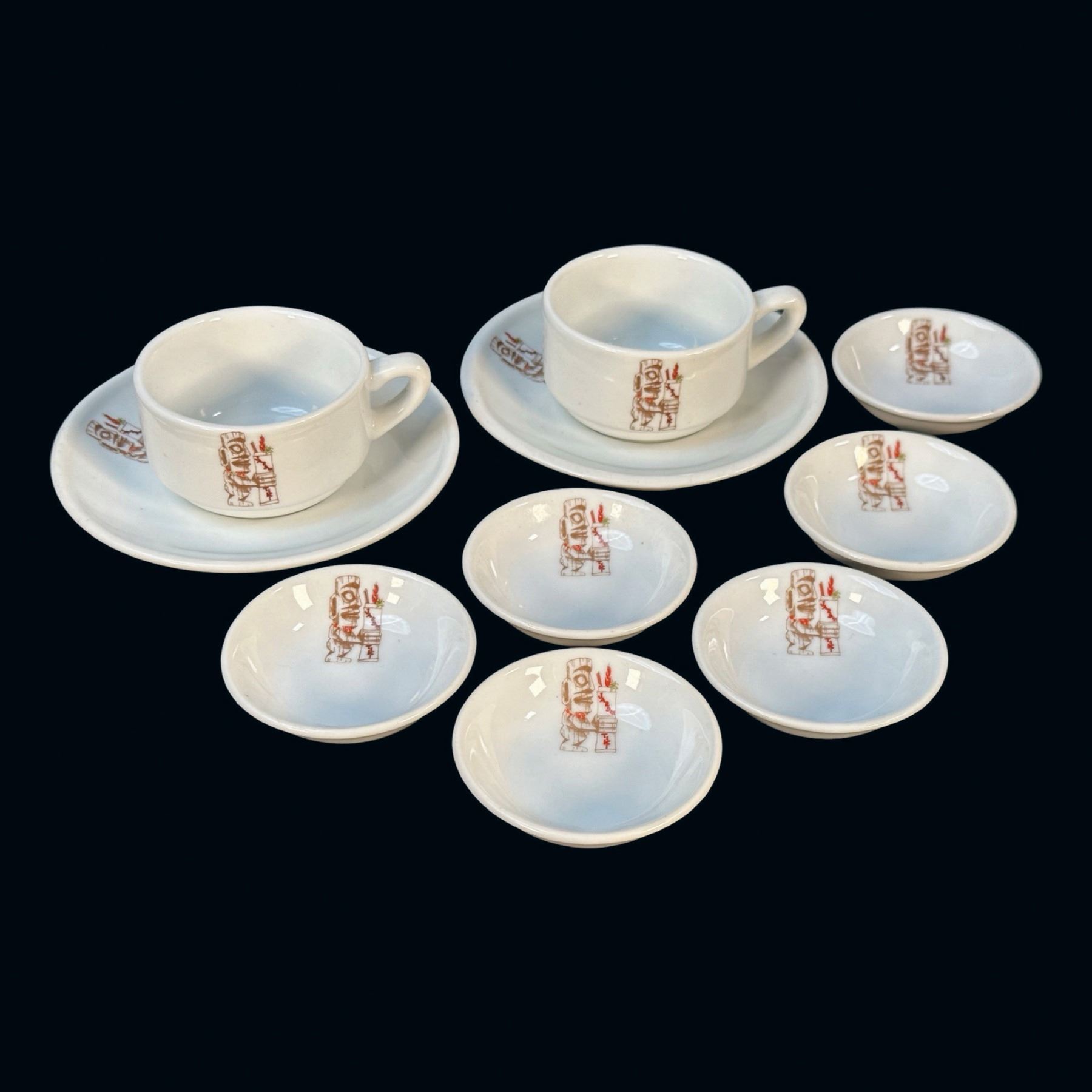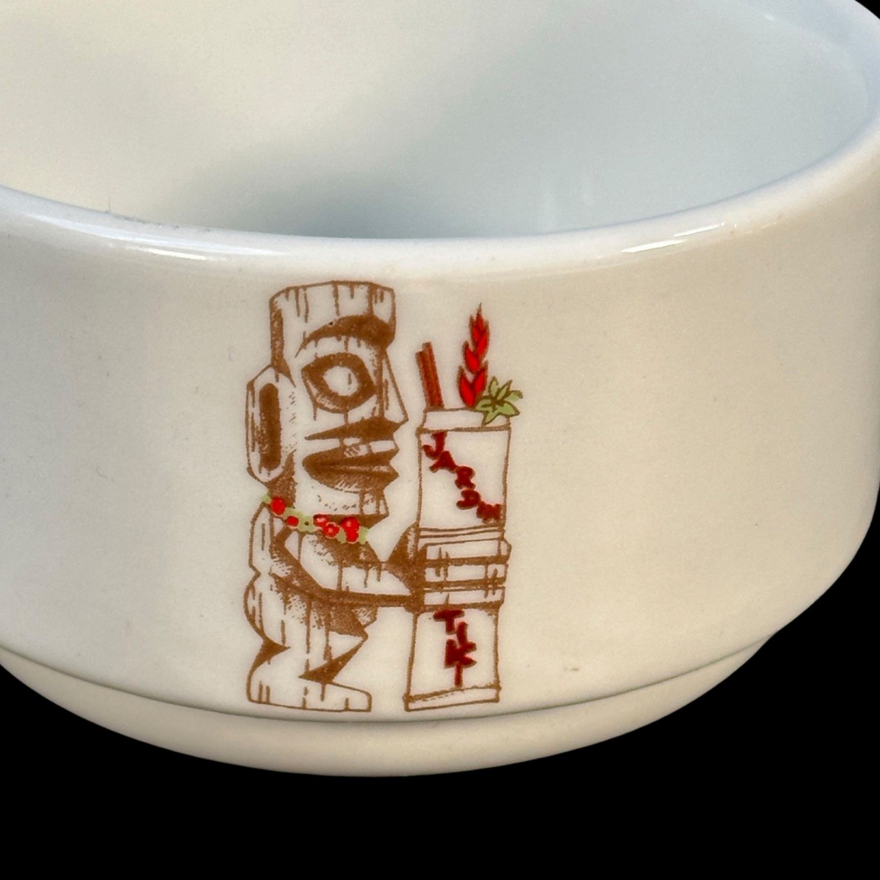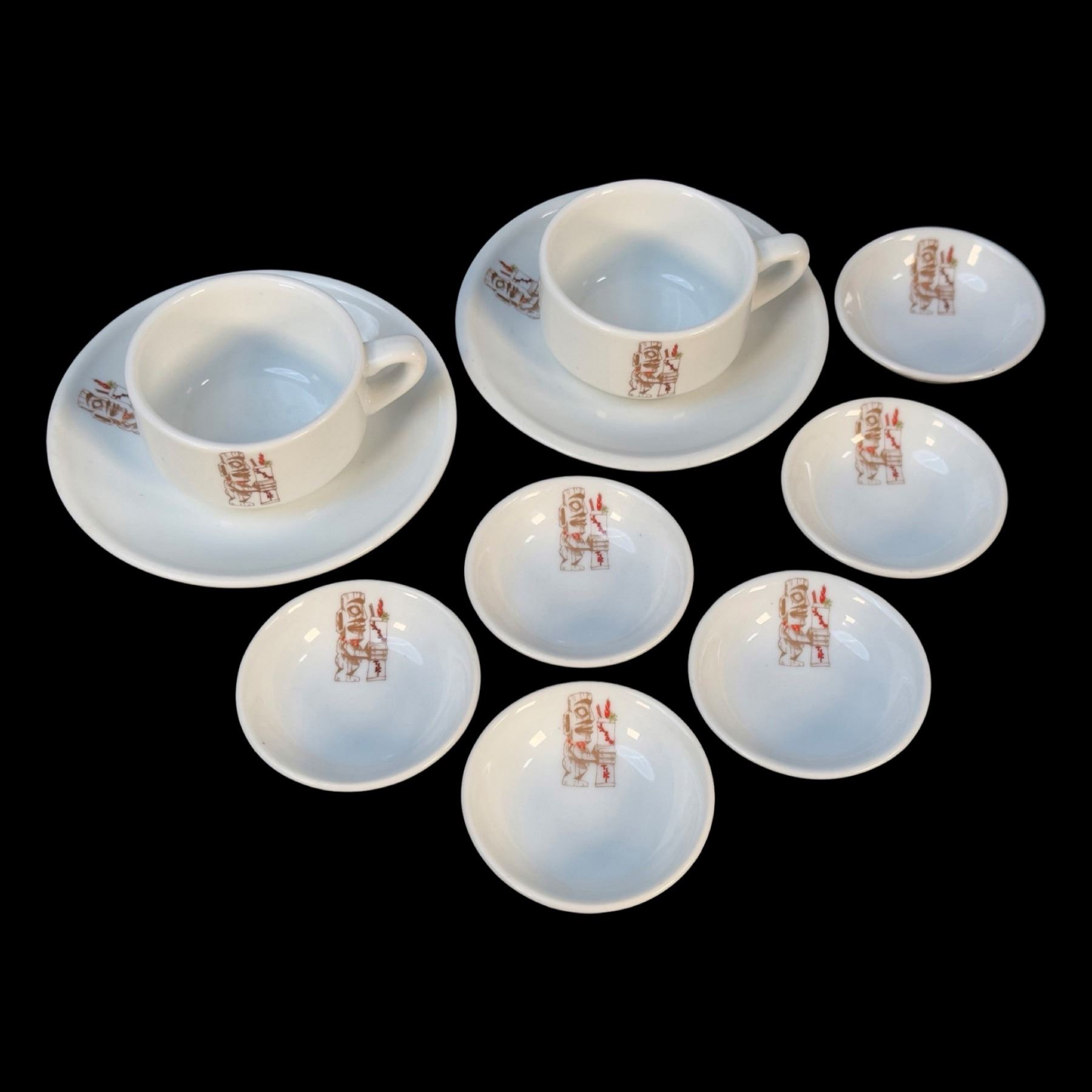 (1970s) JARDIN TIKI was a much beloved part of the Montreal Tiki scene in the 1960s, up until 2015 when it closed. The familiar logo might be recognized by fans of the TIKI-TI!. Large set of dishware. VG+. Cups & saucers 5"dia x 2" each, bowls 2.75"dia each.