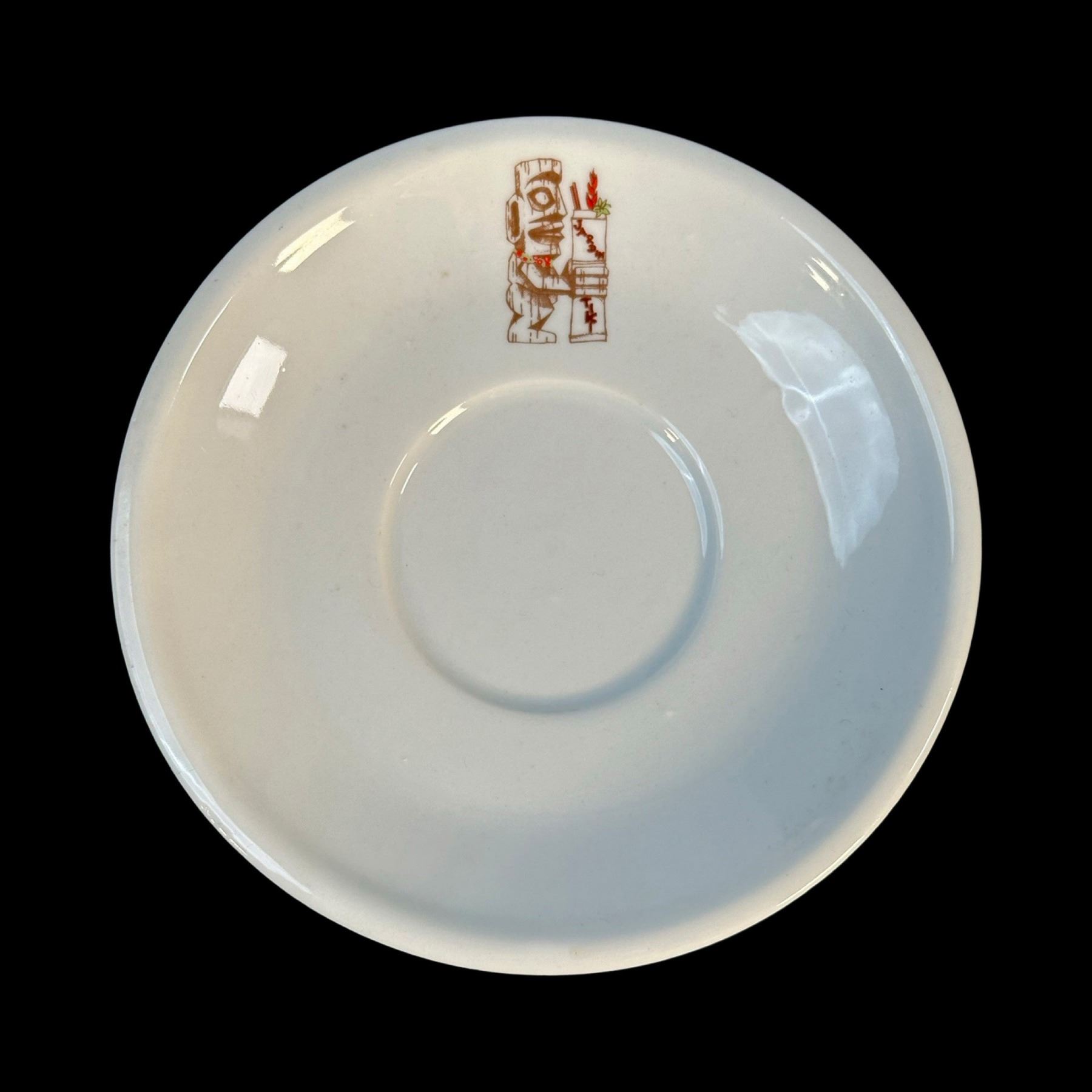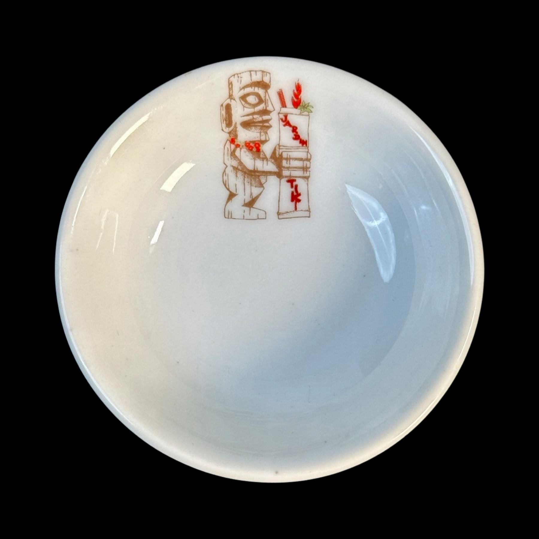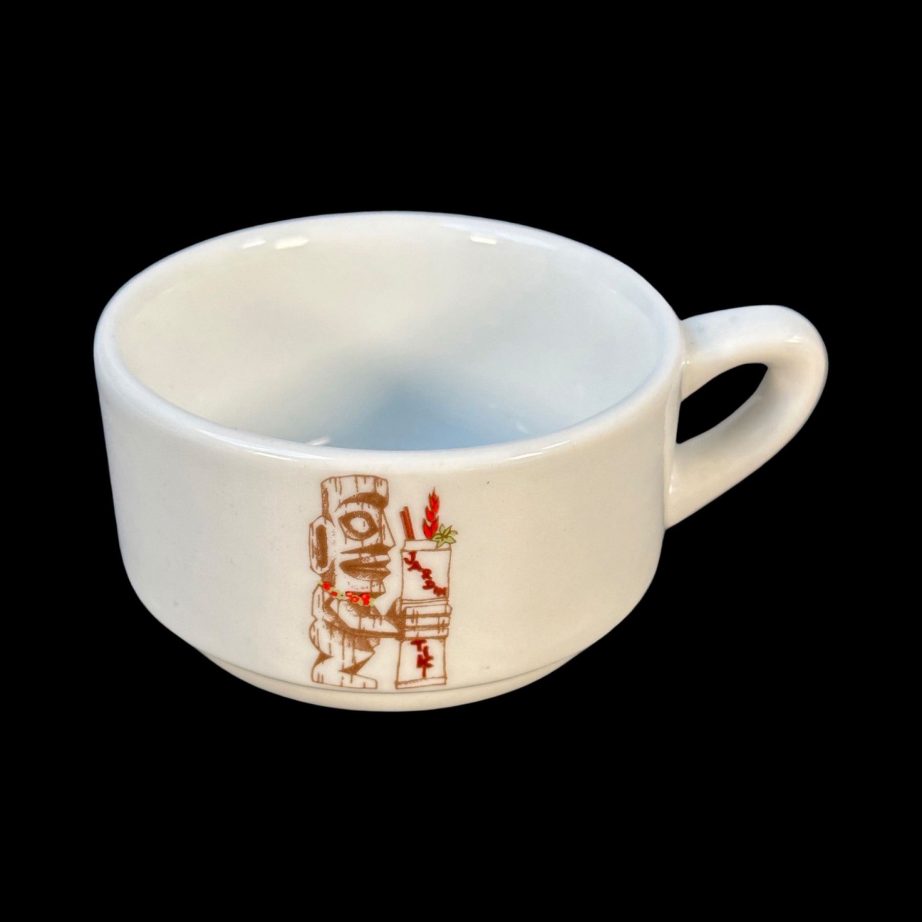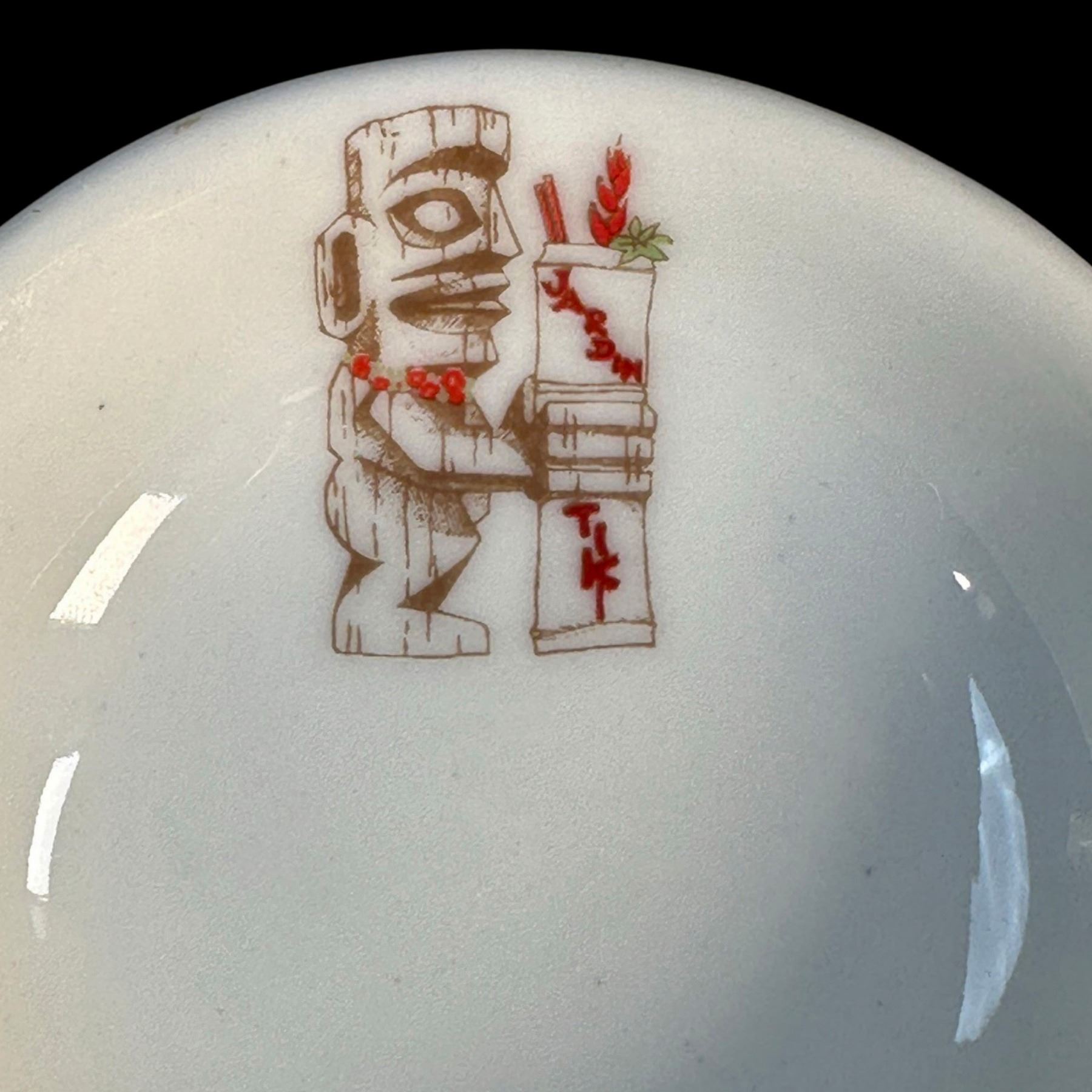 (1970s) JARDIN TIKI was a much beloved part of the Montreal Tiki scene in the 1960s, up until 2015 when it closed. The familiar logo might be recognized by fans of the TIKI-TI!. Large set of dishware. VG+. Cups & saucers 5"dia x 2" each, bowls 2.75"dia each.