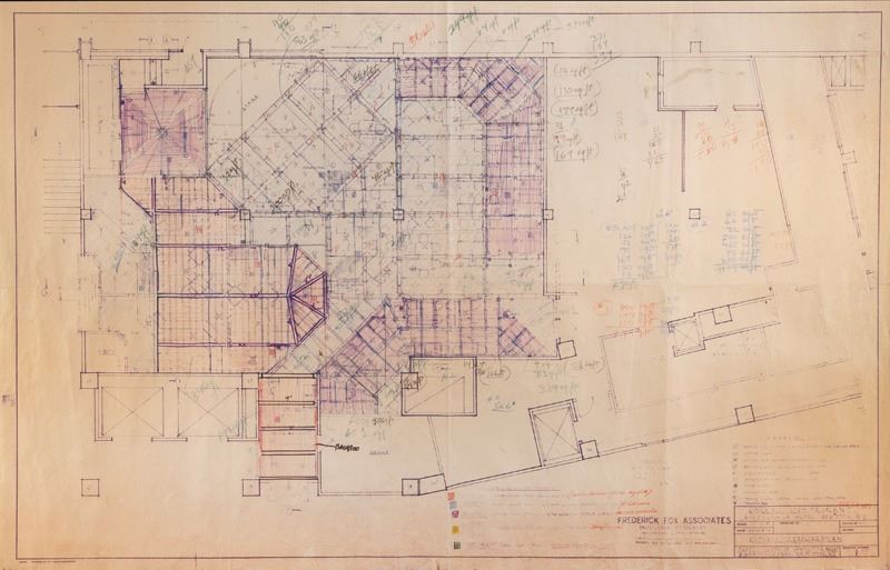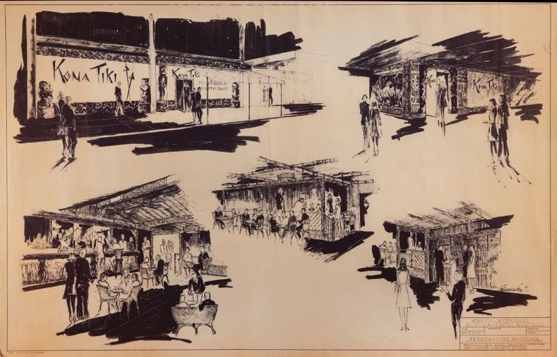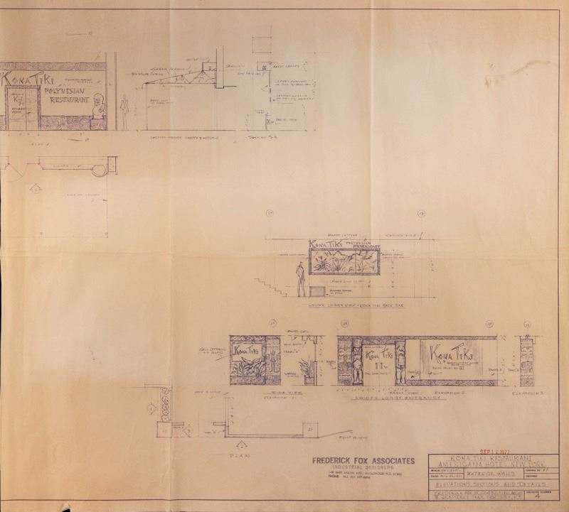 (1977) An astonishingly late period, somewhat full-bore Poly-Pop build out for the ill-fated KONA TIKI Restaurant. This was a job OA did with designer Fredrick Fox in New York City at the Americana Hotel on 24th Street. By 1977, this was certainly a late bloomer and unfortunately, the restaurant went into bankruptcy in 1982. There are blueprint plans with a sheet of "perspective sketches" showing different interior and lobby exterior features of the venue.22"x34", 22"x24"VG+ with light edge creasing