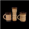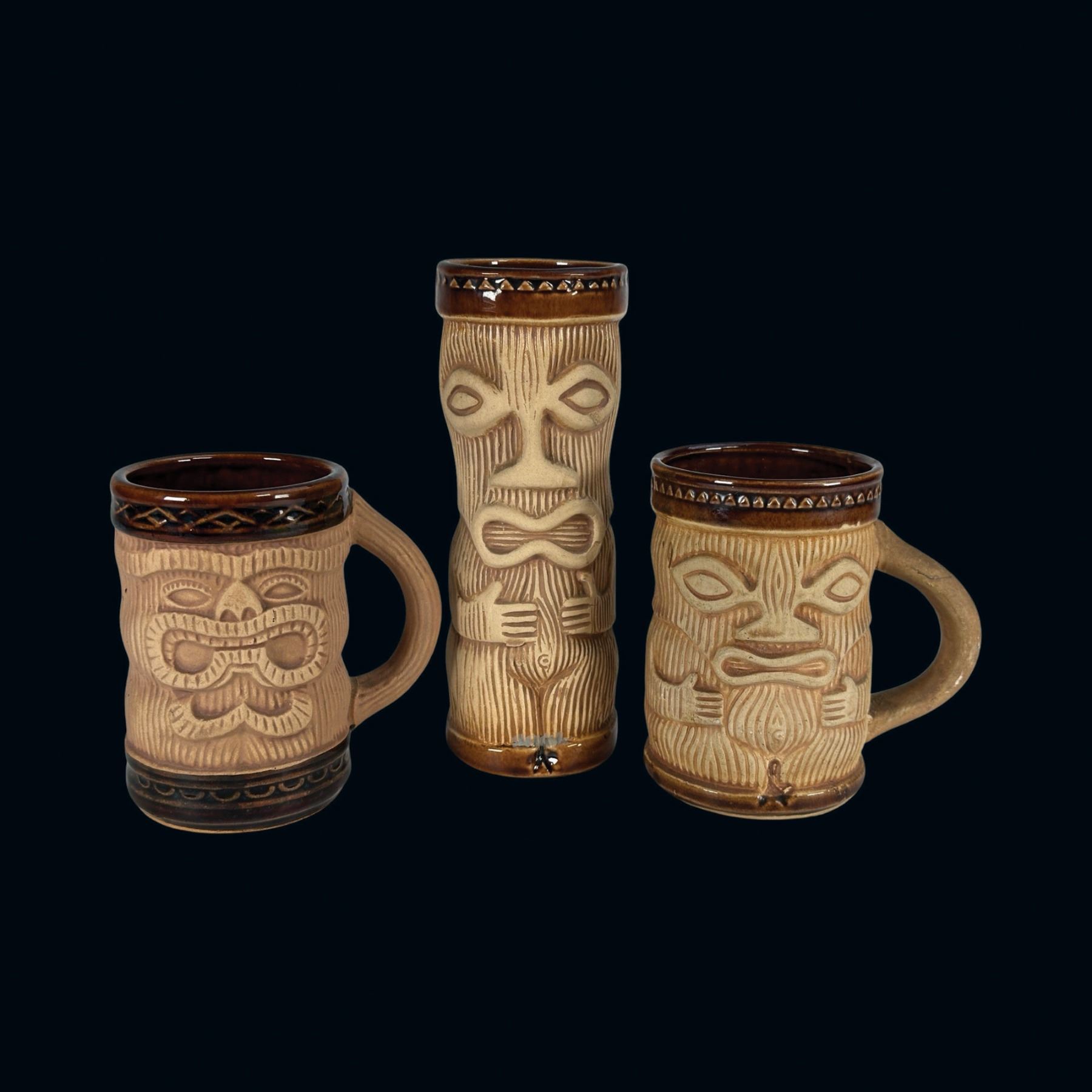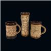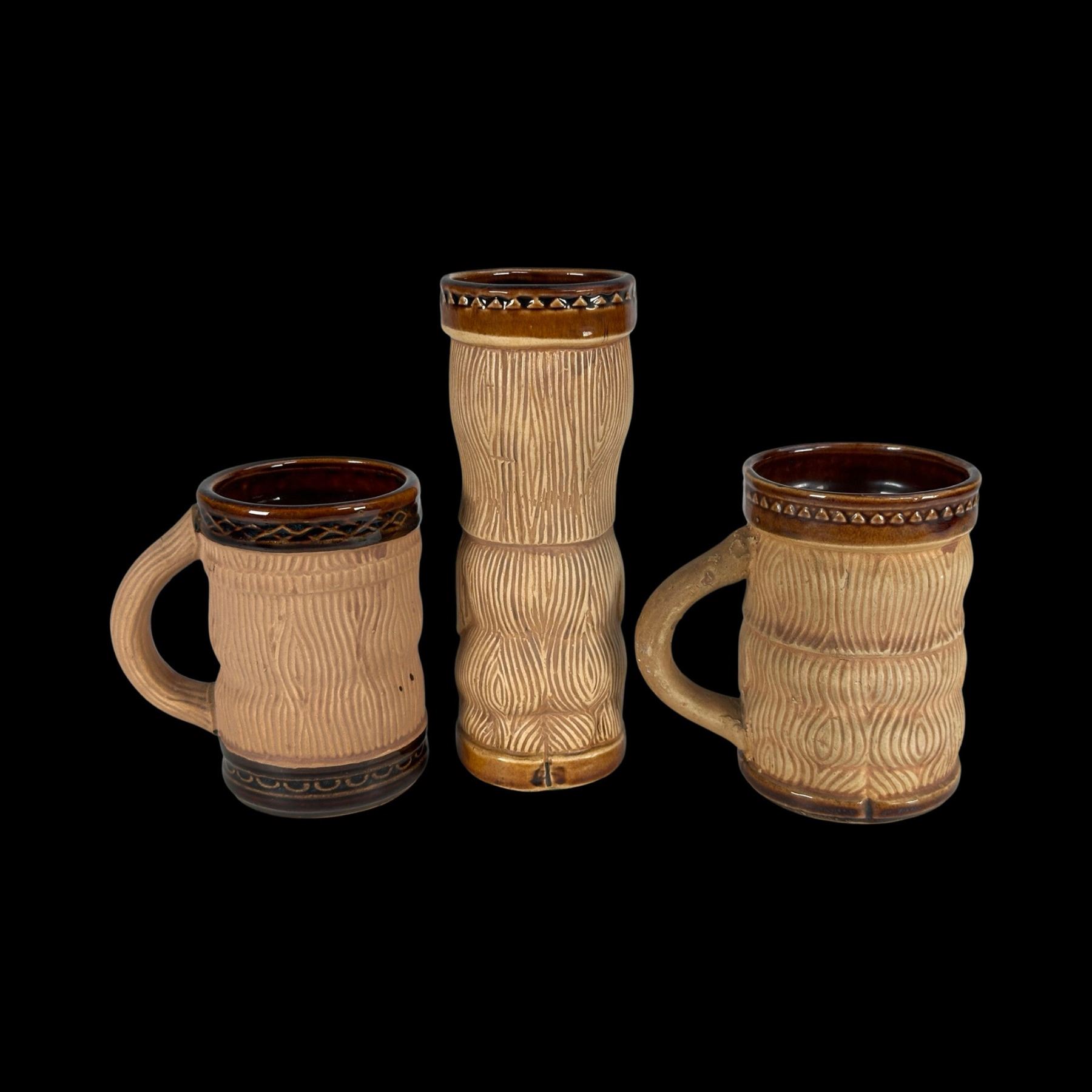 (1950s)* Two coffee and a standard PMP mug. VG+ with typical wear. 2.75"dia x 7", 4.5"x4.5"x3", & 4.25"x4.25"x2.75".