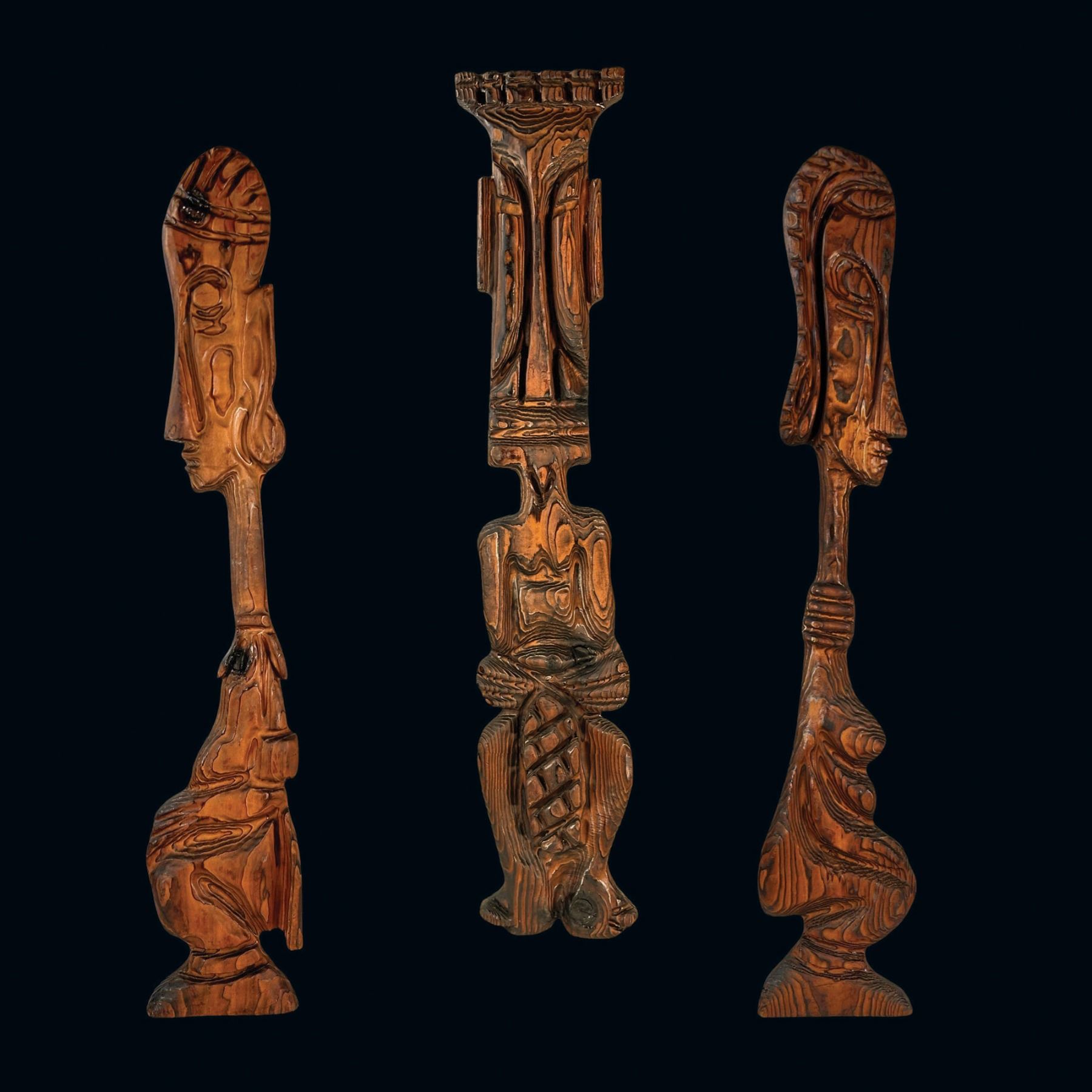 (1960s)* "Female Dancer", "Male Dancer", and "Bongo Drummer". Hung in Sven's den. VG+ with typical wear. 9"x48"x2" each.