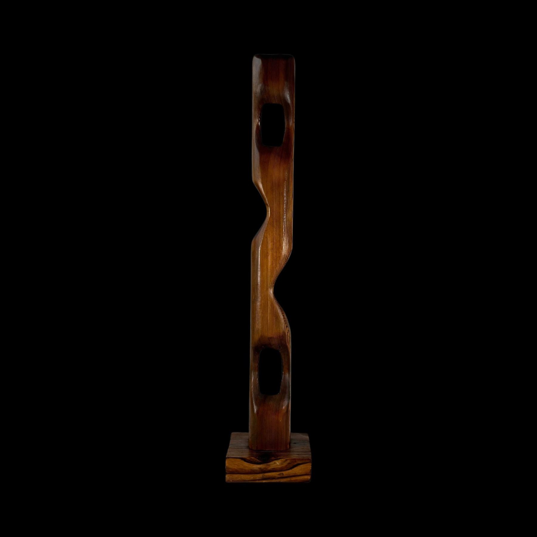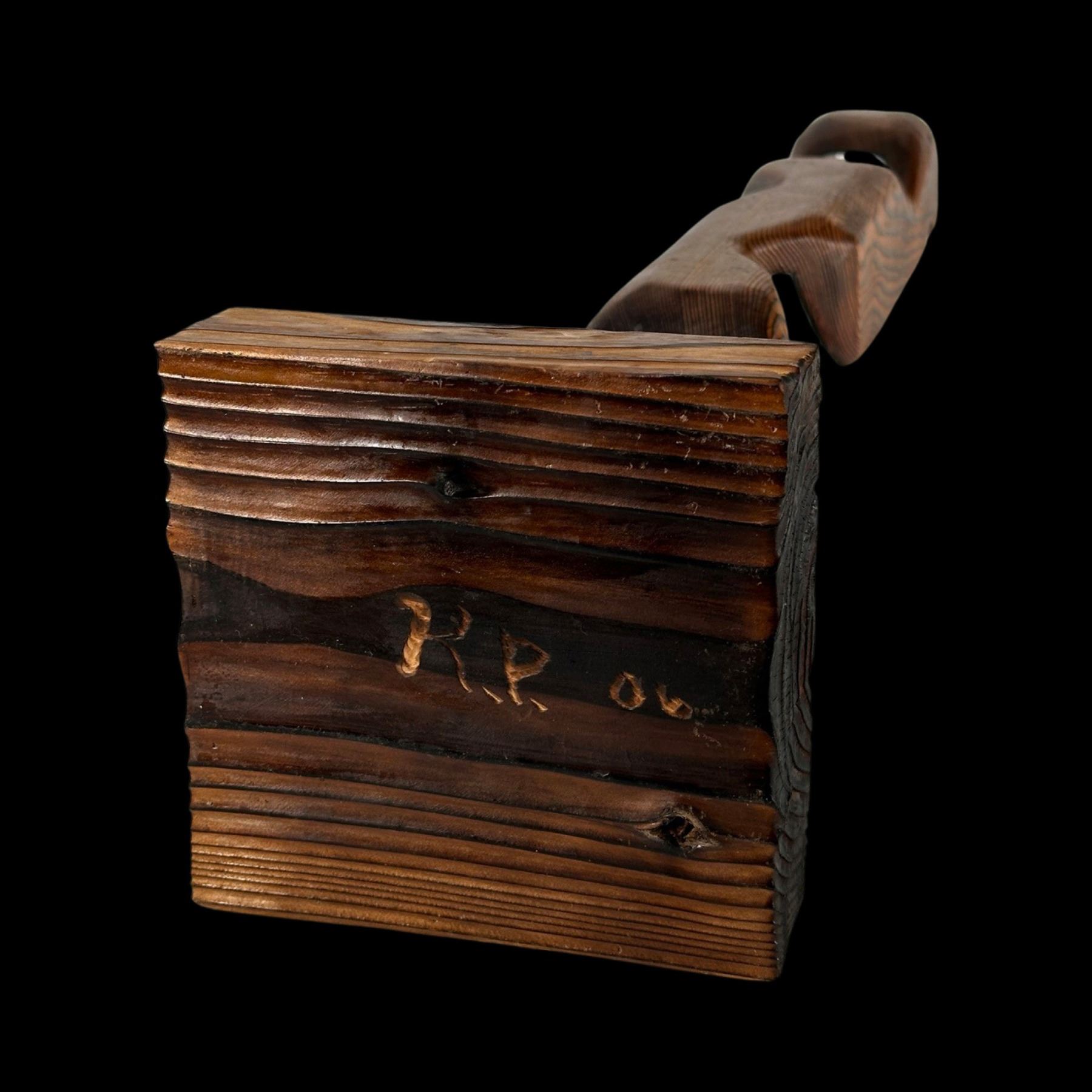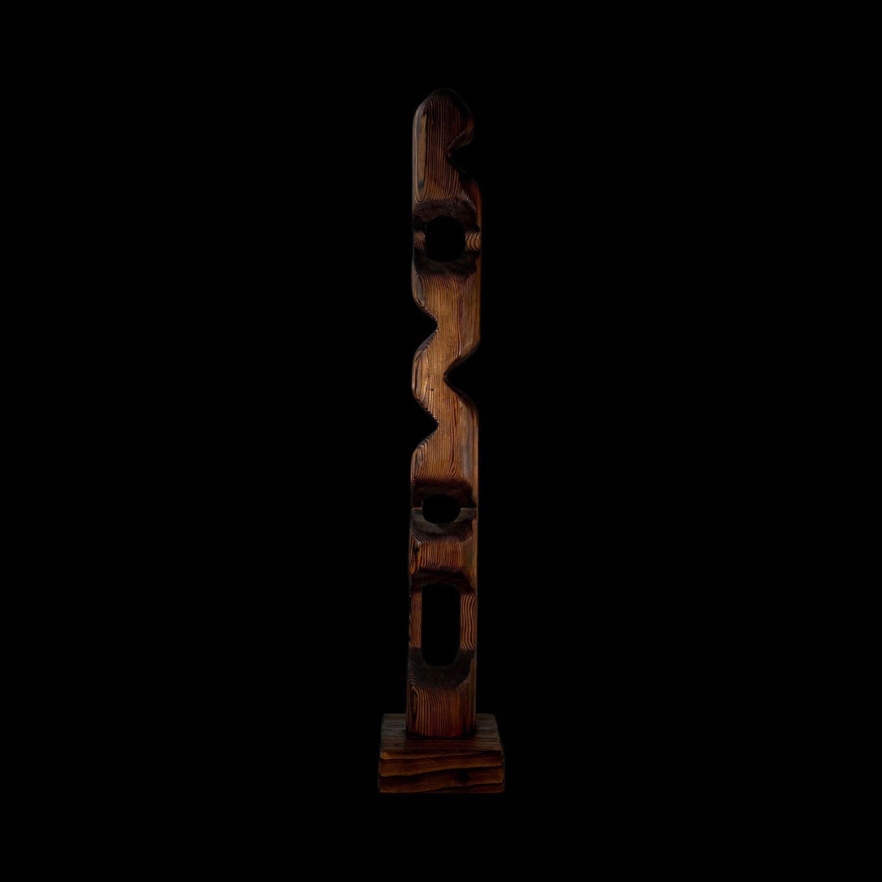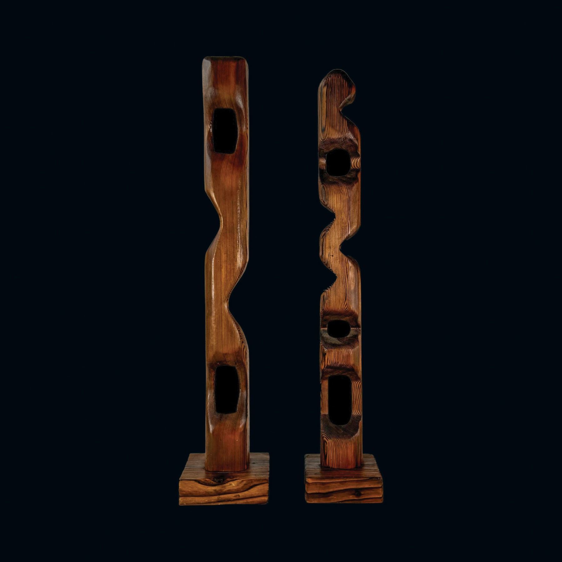 (2006)* In the tradition of William Westenhaver's ID line, using cedar rain gutters cut into abstract art. "ID" is based on the Freudian theory of the human consciousness, which was quite the rage in the 1960s. Published in Book of Tiki, page 252. VG+. 7"x34"x6.75" & 6"x33.75"x6.25".