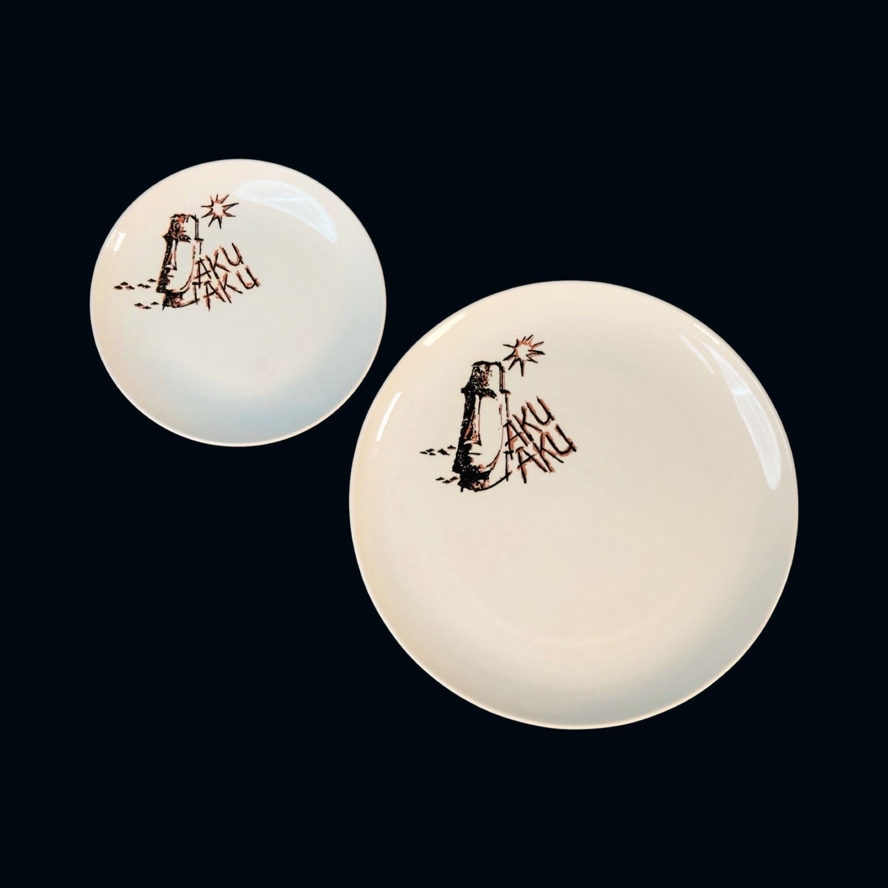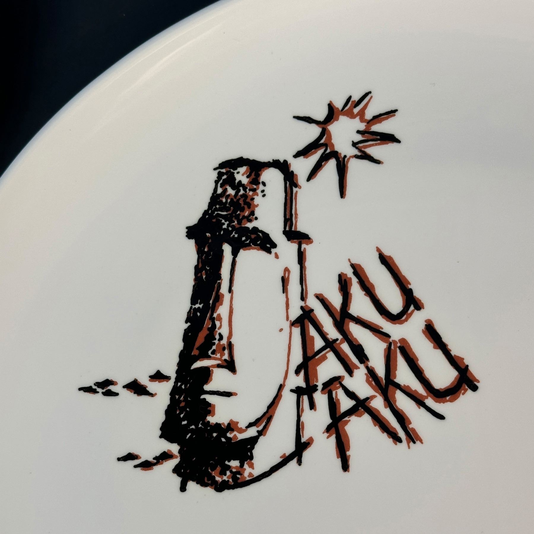 (1970s) A pair of restaurant serving ware from the famous AKU AKU restaurant and lounge at the Stardust Casino in Las Vegas. Features a fun, rustic Moai graphic. VG+. 6.5"dia & 10"dia.