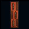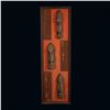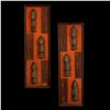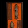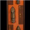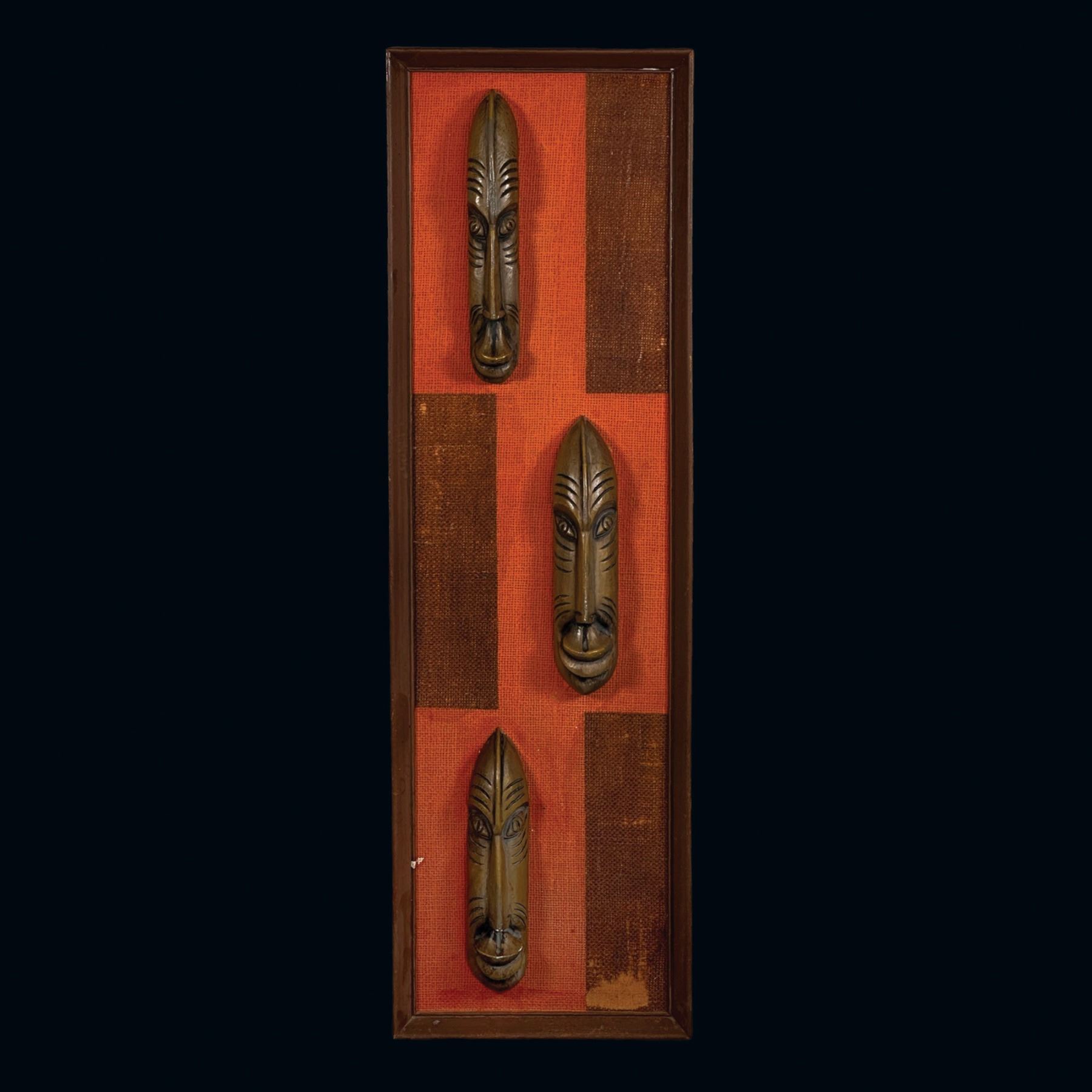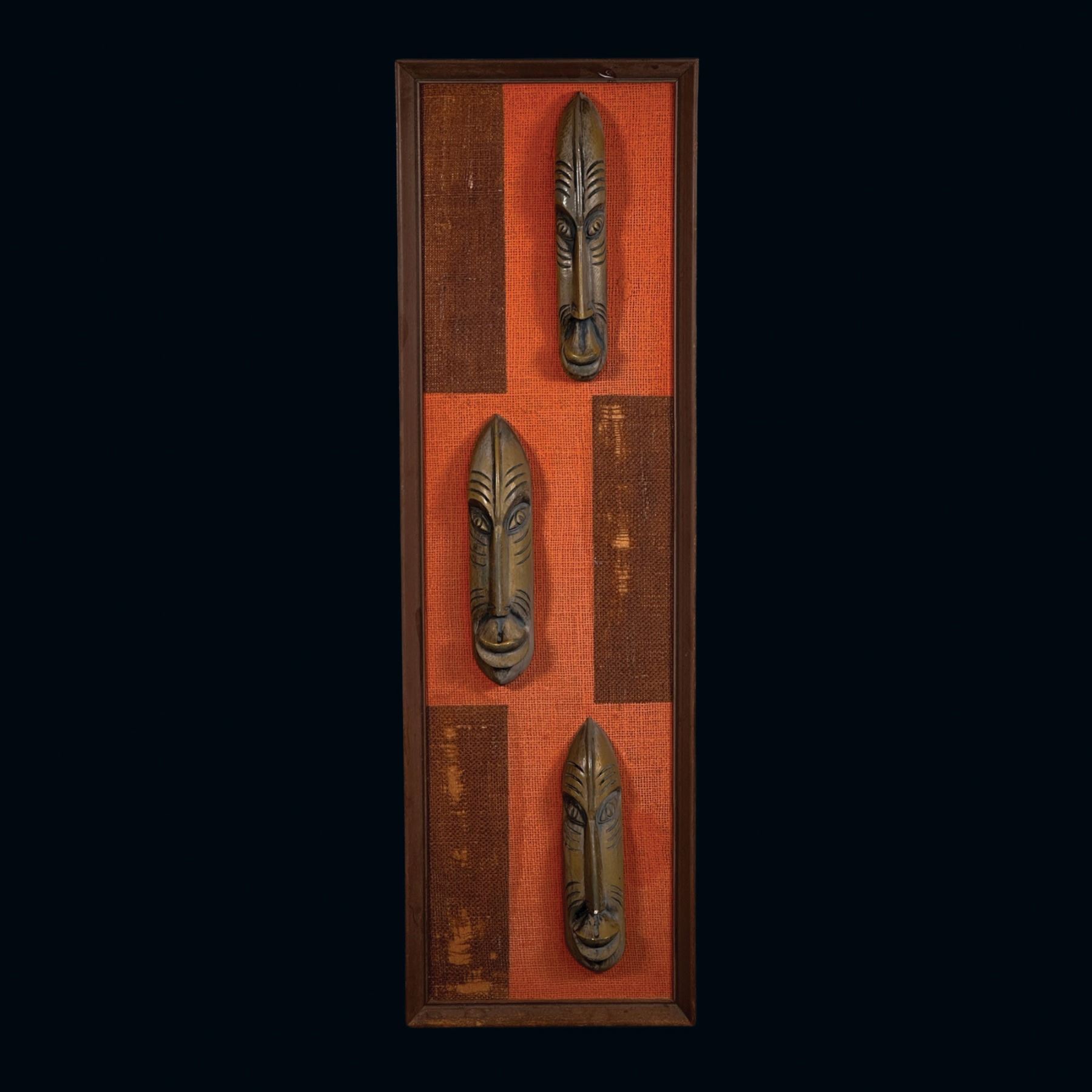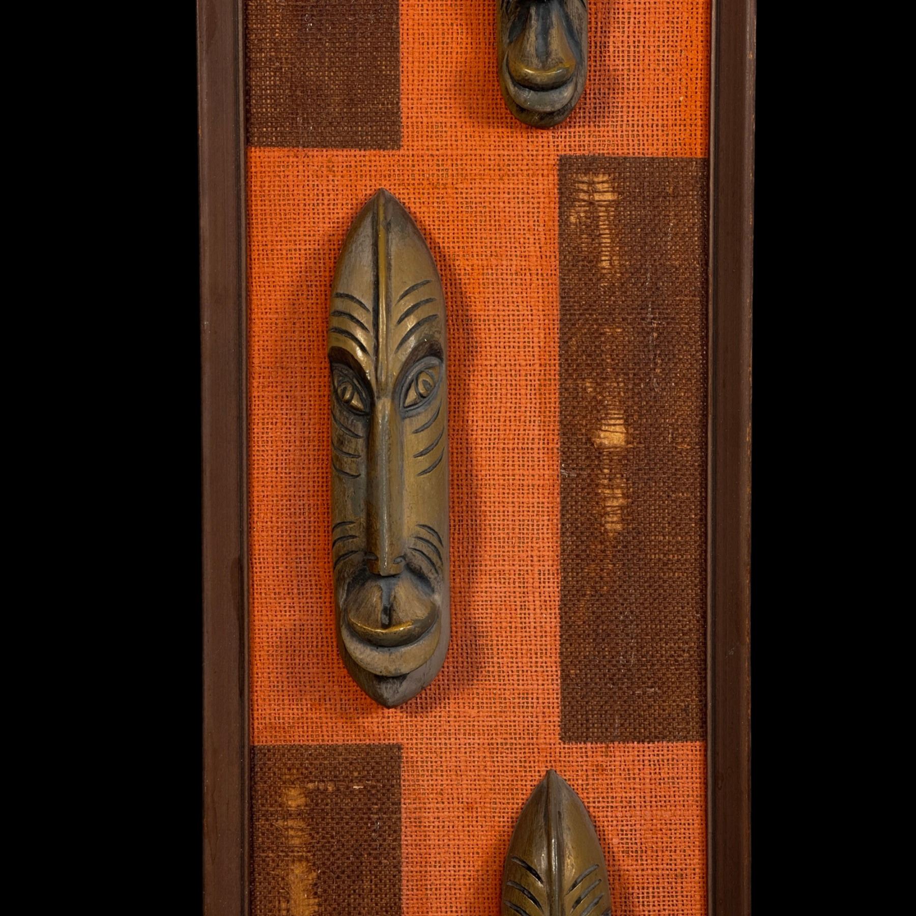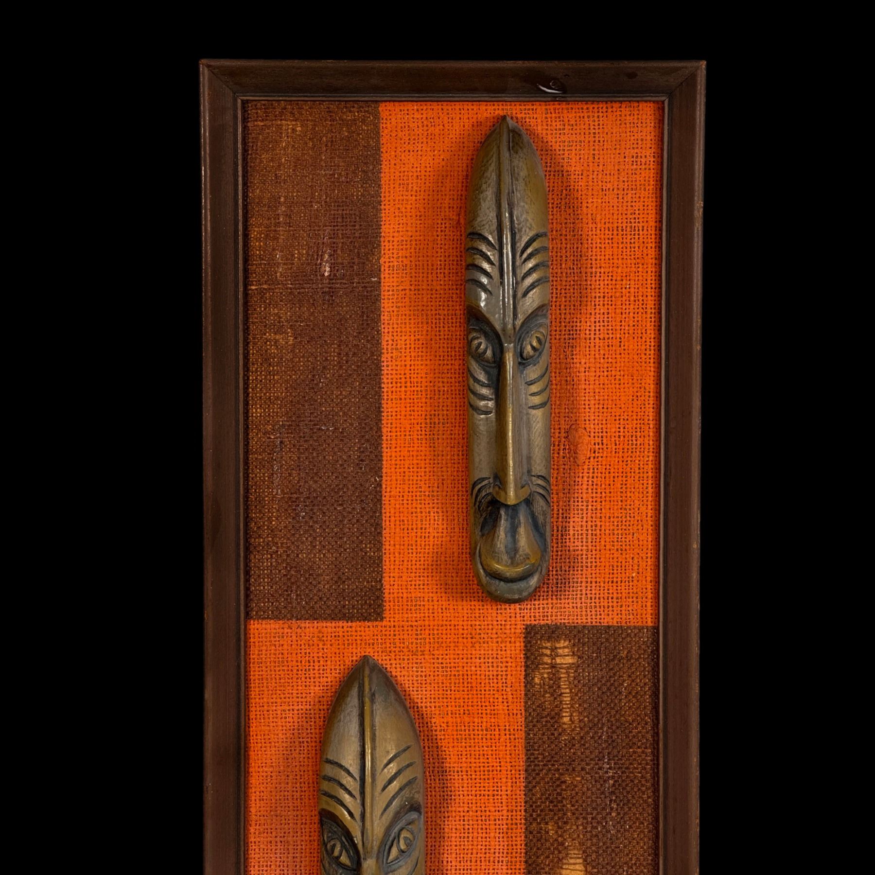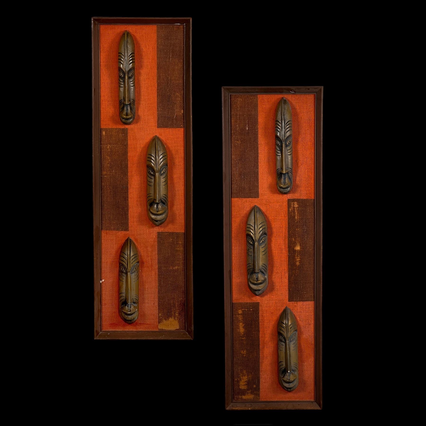 (1950s) Primitive art for the Populuxe era. These chess-like mask wall art frames epitomize the contrasting mindset used in mid-century exotic design. These pieces were featured in Sven's TIKI MODERN book. VG+ with some wear to the outer frames and fraying to areas of the burlap backing. 10.25"x24.25" each.