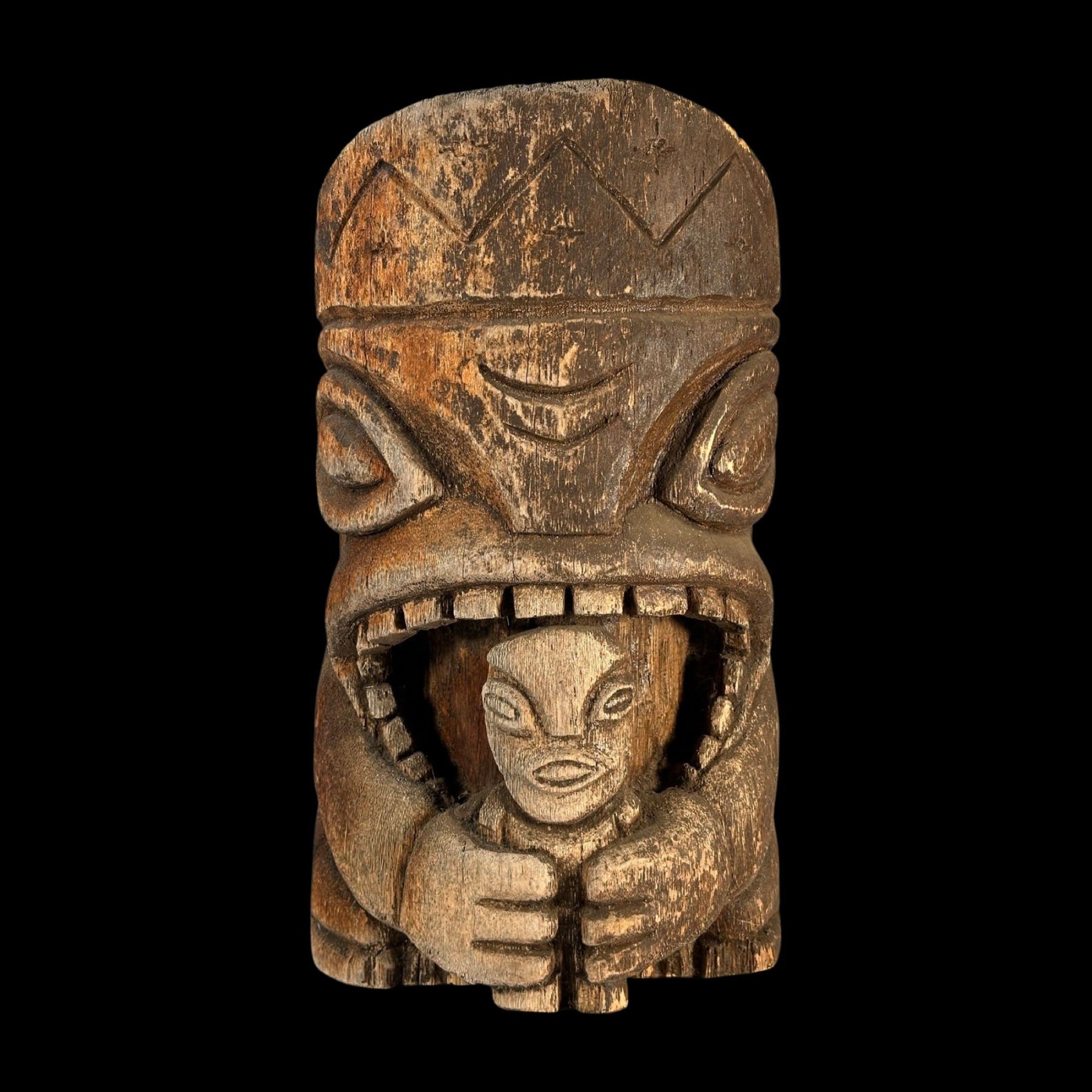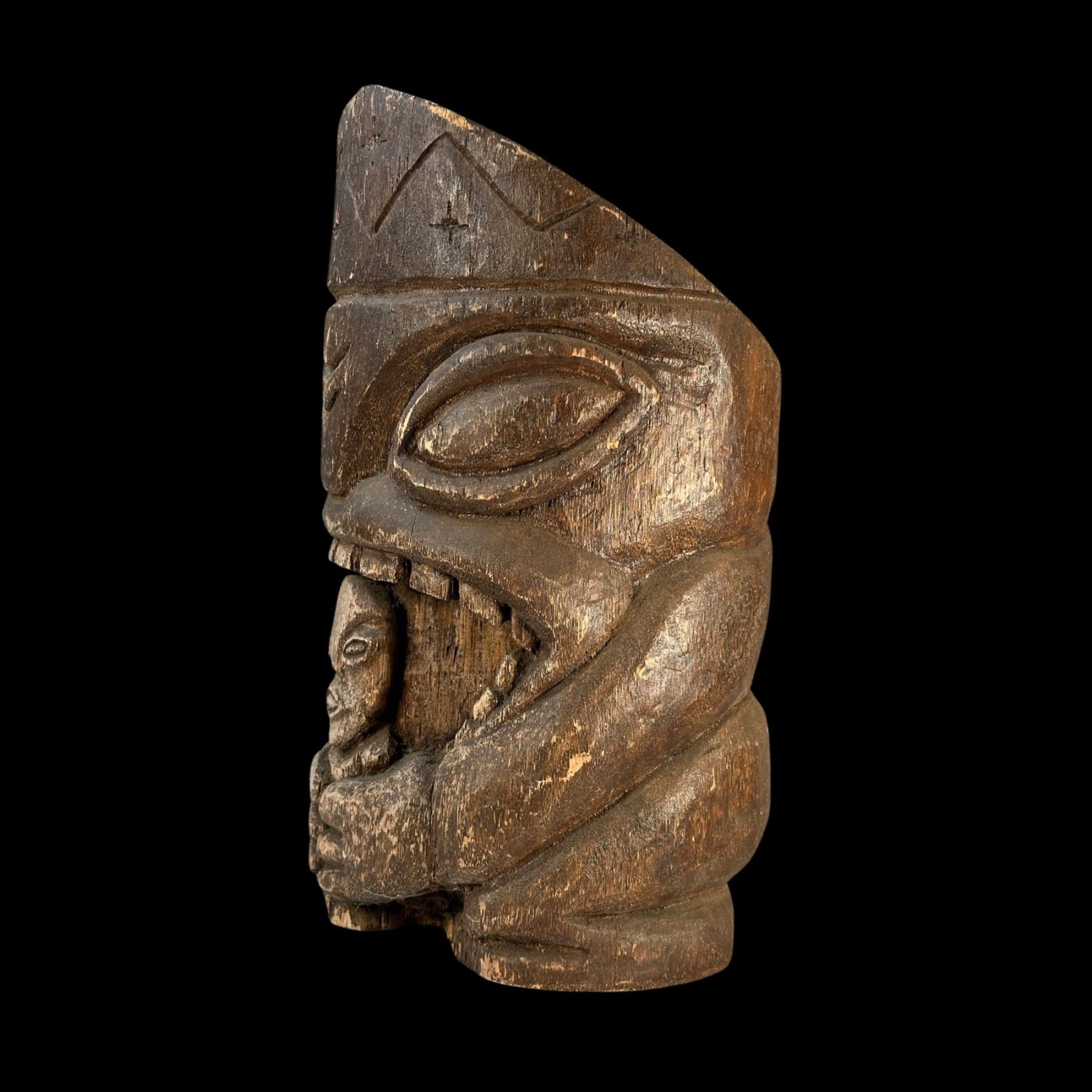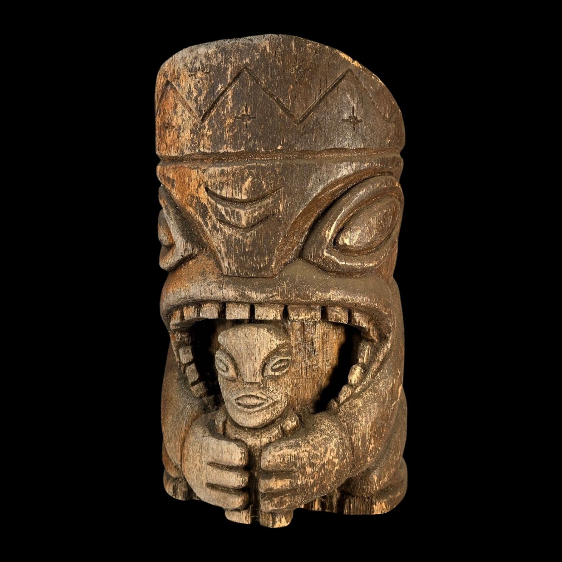 (1990s)* Cannibal carving in the style of Stephen Crane Kon Tiki poles used at the Luau and Kon Tikis. Overall VG with a weathered patina that accents the piece. 13"dia x 20".