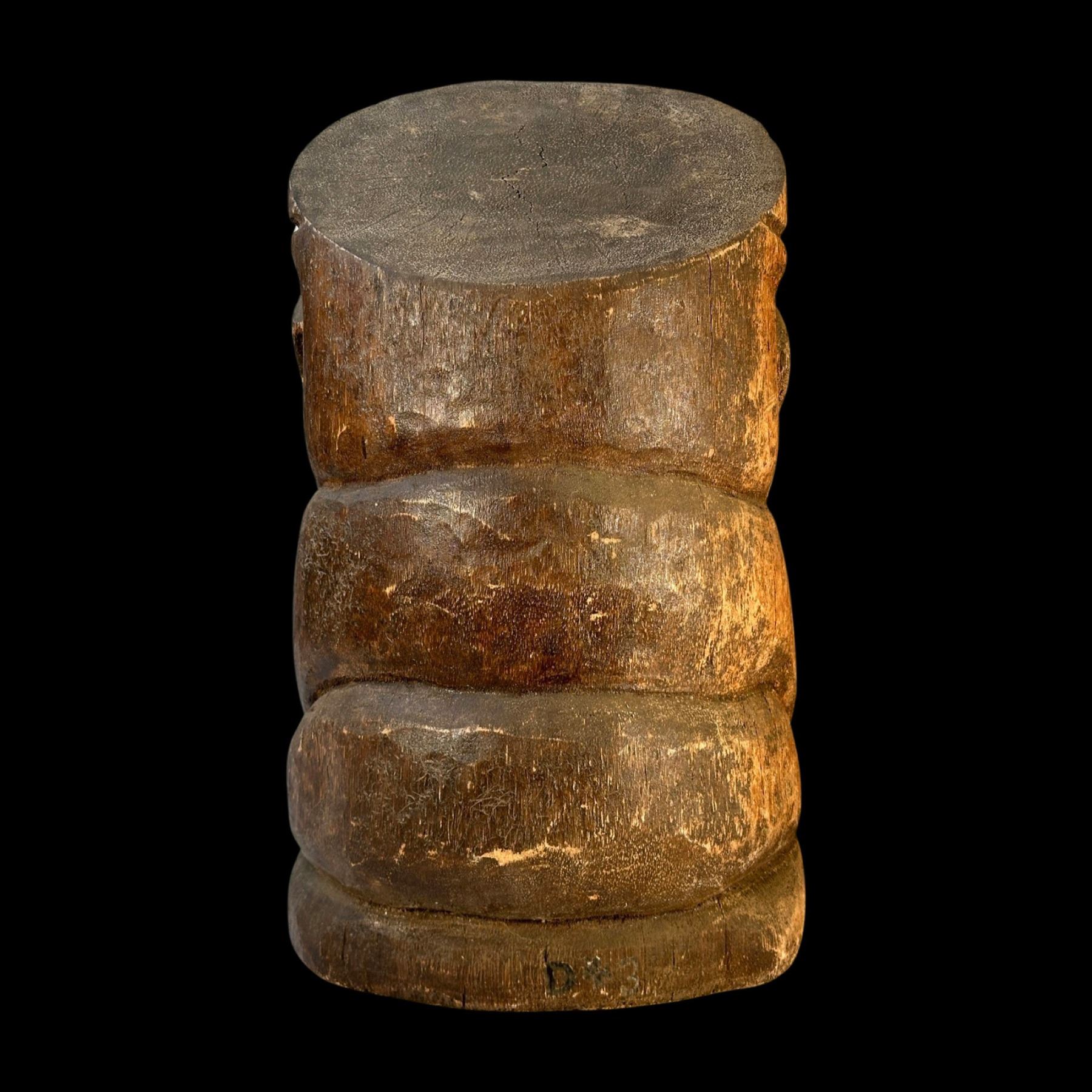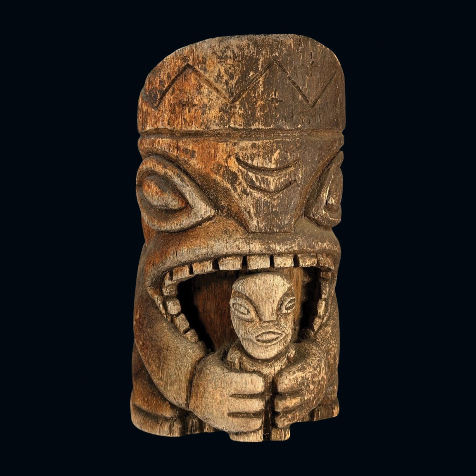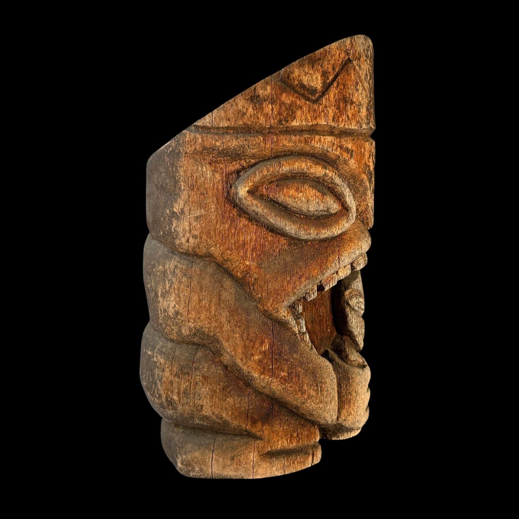 (1990s)* Cannibal carving in the style of Stephen Crane Kon Tiki poles used at the Luau and Kon Tikis. Overall VG with a weathered patina that accents the piece. 13"dia x 20".