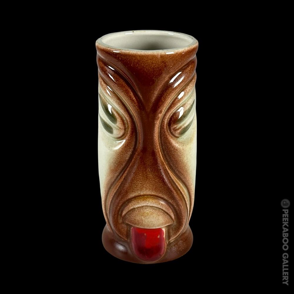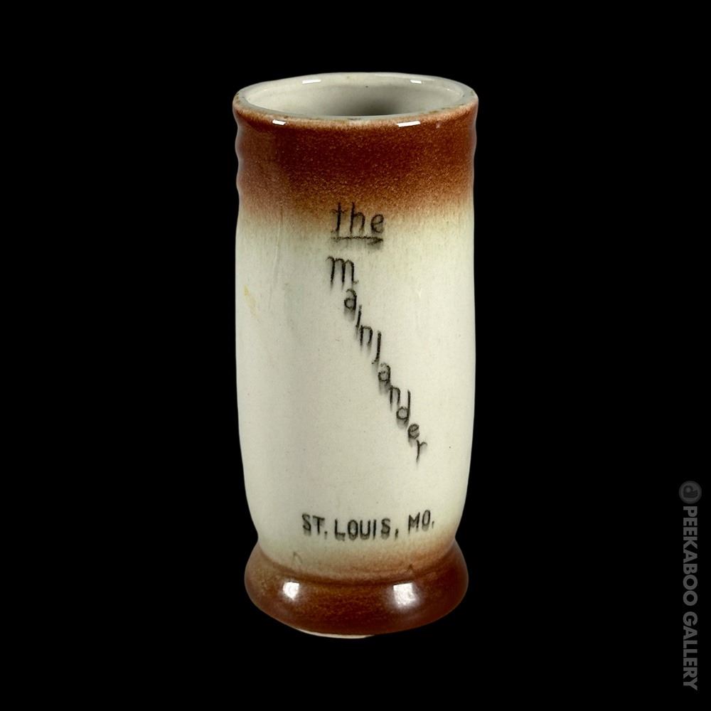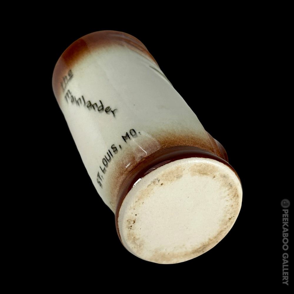 (1960s) A unique signature mug for The Mainlander in St. Louis, MO where the company's logo was a WITCO fountain carving found in their decor. That logo was also used on their printed matter such as menus, cocktail lists, napkins and matchbooks. This is the shorter version of the mug and was produced by OMC. VG+ with typical chipping to the top cold paint on the tongue and eyes. 5.5"x2.75"dia.