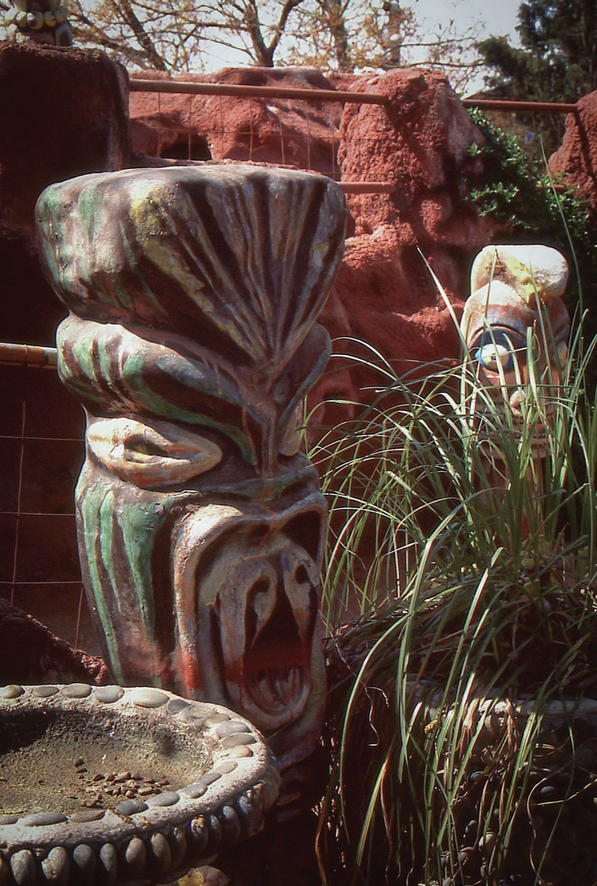 (1970s) Here is a relic of the famed THE TIKIS Polynesian Theme Park in Monterey Park, California. Created by Danny Balsz, the park has an absolutely mythic status among Poly-Pop aficionados. This Tiki was cast of one of the park carvings and made to light up on the various stages. The fiberglass is very thin and there is some cracking in spots. Overall, it displays well and is an easy candidate for restoration if one chooses to, although not necessary. There is a hole in the back for placement of a light fixture but does not currently have one in place. This Tiki was also used extensively at the ALOHA, OA! events celebrating the history of Oceanic Arts in Whittier, CA in 2022. VG with some splits and cracking in areas. 17"x51.5"x14".