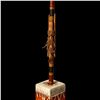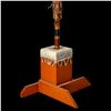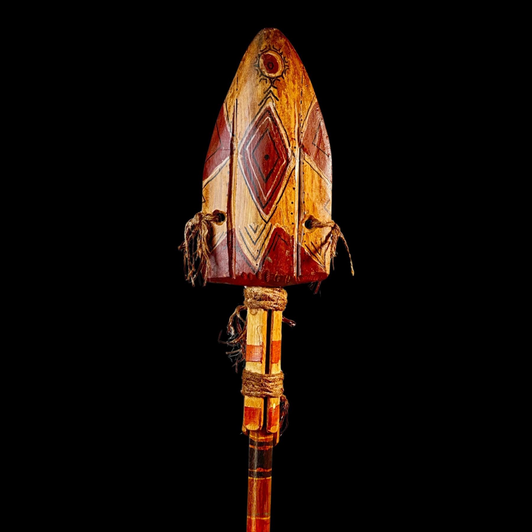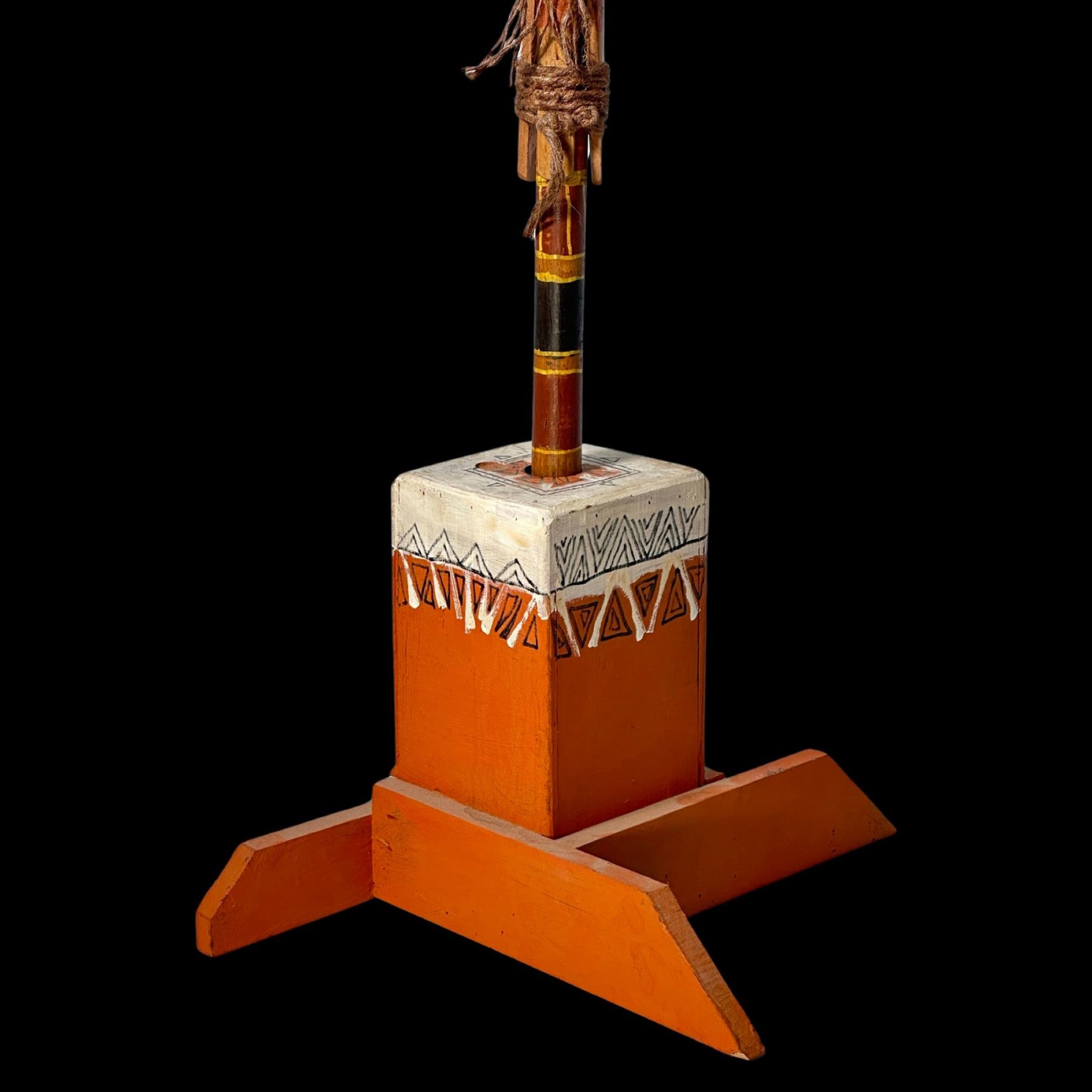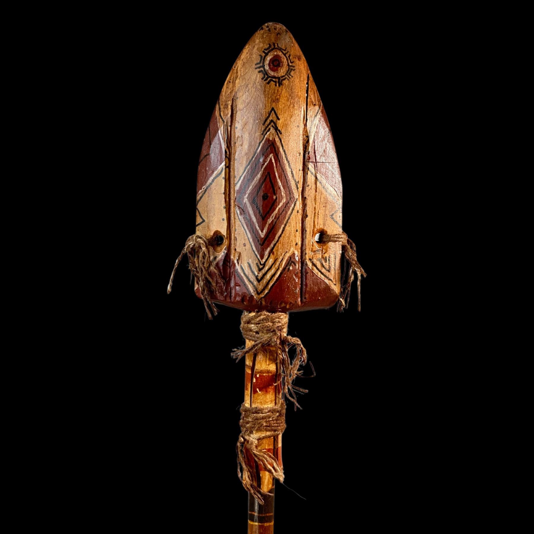 (2000s) Hand constructed and acrylic painted spear and stand by master carver, LeRoy Schmaltz. These spears were part of the OA rental department stock and were created to offer a foreboding presence at your backyard luau. VG+. 22"x82"x22".