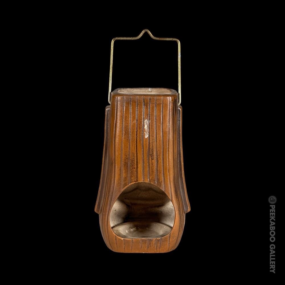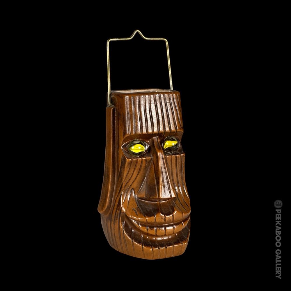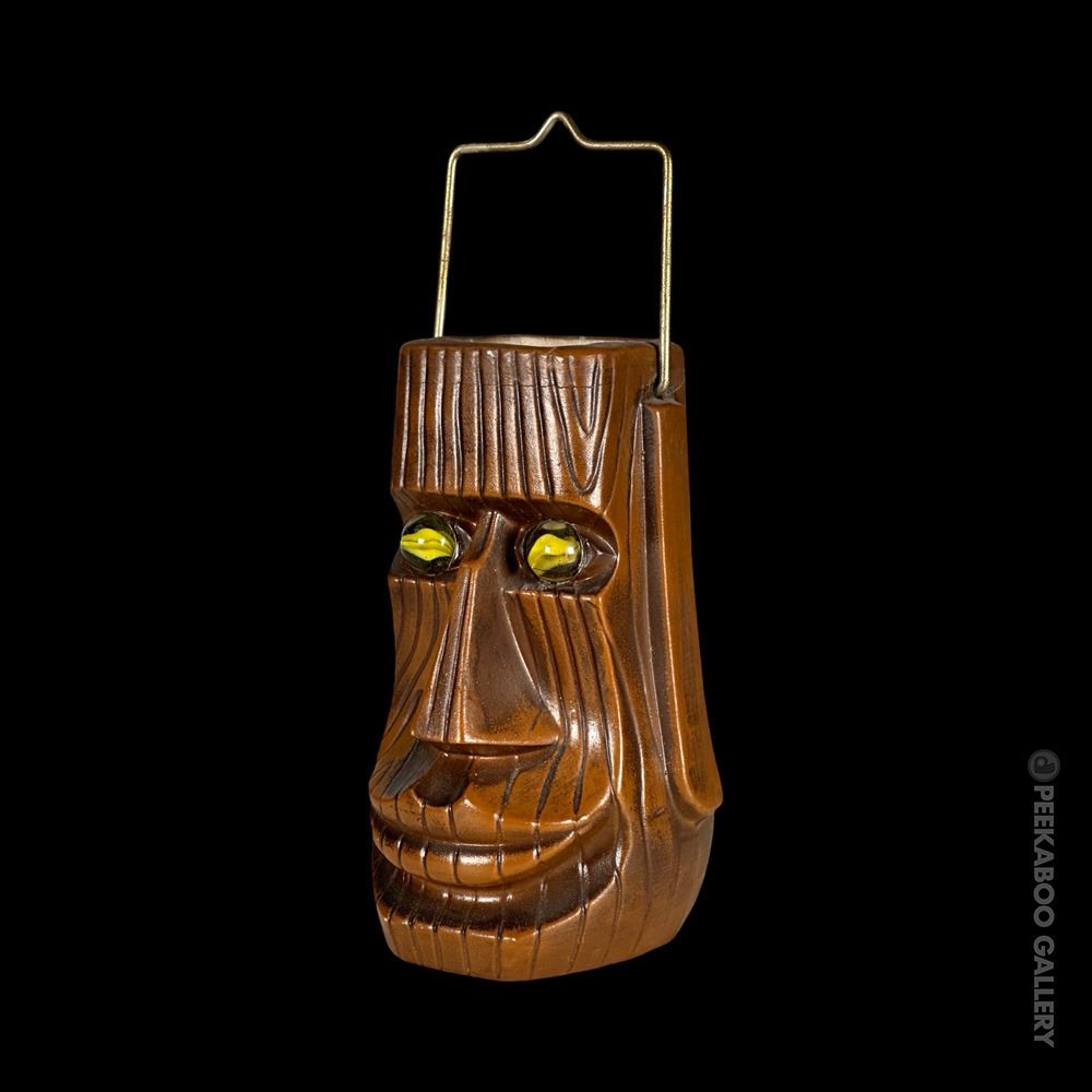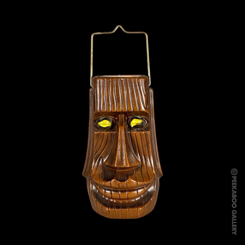 (1960s) Quon-Quon was a Taiwanese importer of pan-Asian and Polynesian novelty items to the United States. Oceanic Arts, Sea & Jungle and Paul-Marshall all did a significant amount of business with Quon-Quon. Here is a novelty Moai tiki lantern with glass marble eyes. VG+ with minor wear. 6.25"x3.5"dia.