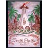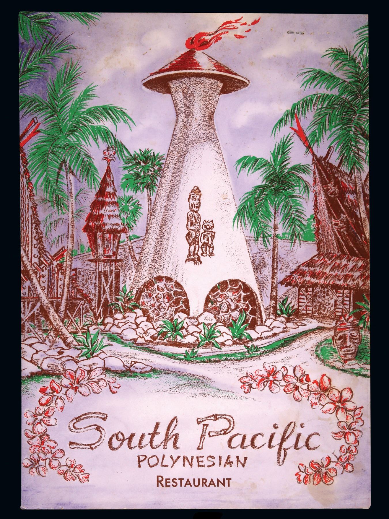 (1960s) One of the most elaborate Tiki restaurants outside of the MAI-KAI and The Kahiki, the South Pacific in Hallandale, FL featured a fully realized theatrical property, immersive interiors and entertainment. Rare menu. VG+ with minor wear. 10"x14.25" closed.