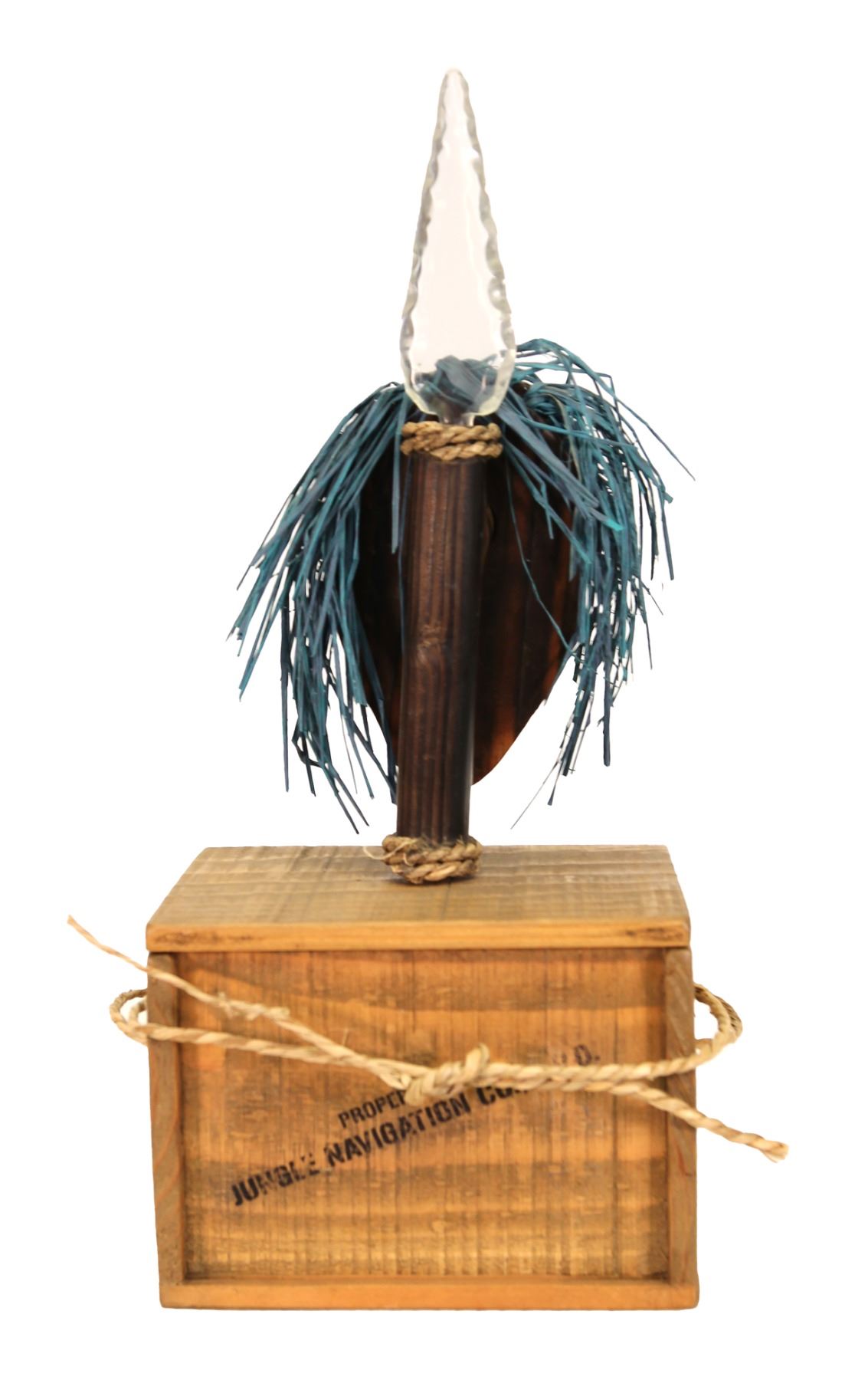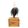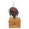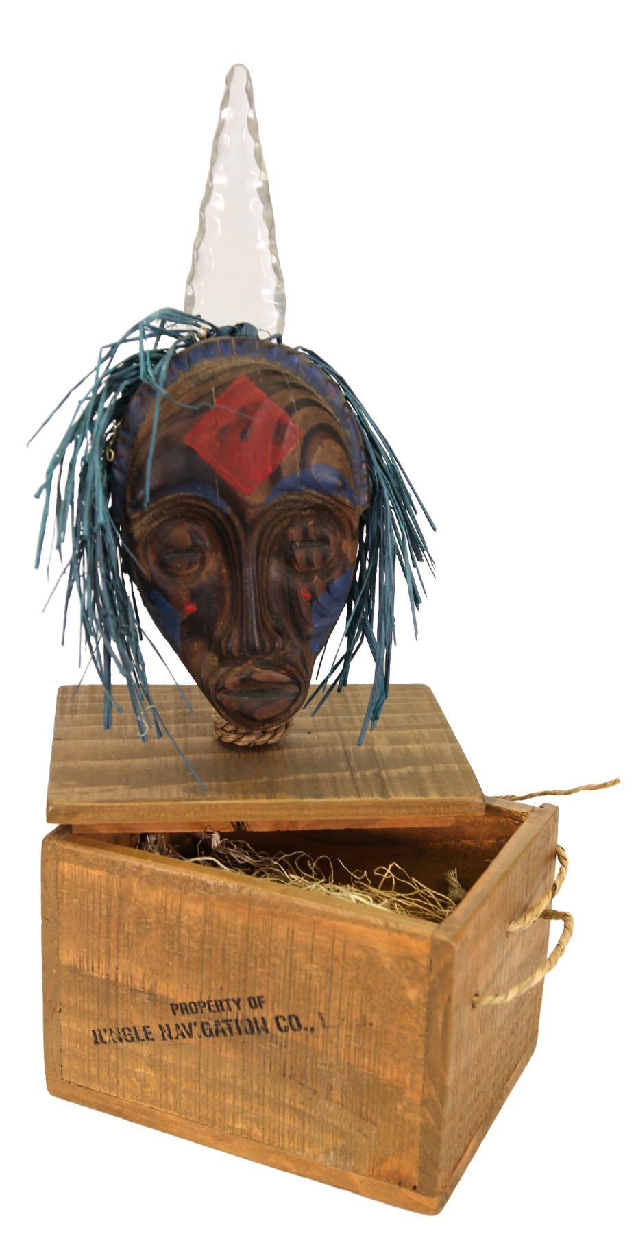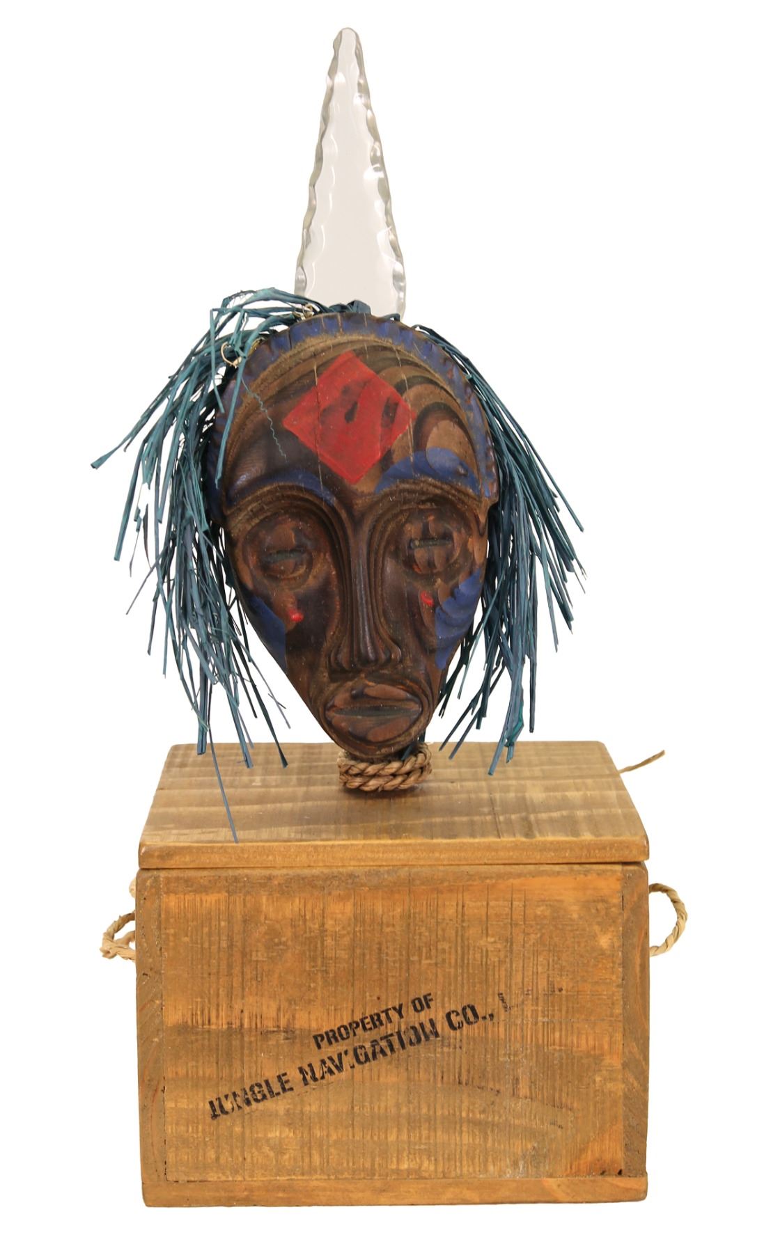 (2000s) Here is a specialty item made expressly for Disneyland's Adventureland gift shop. These were only available there in very limited quantity. Hand carved and painted Shrunken Head mask with blue raffia hair and long crystal horn on the top of the head. Solid wood. 17.25"x7.5"x6". VG+.