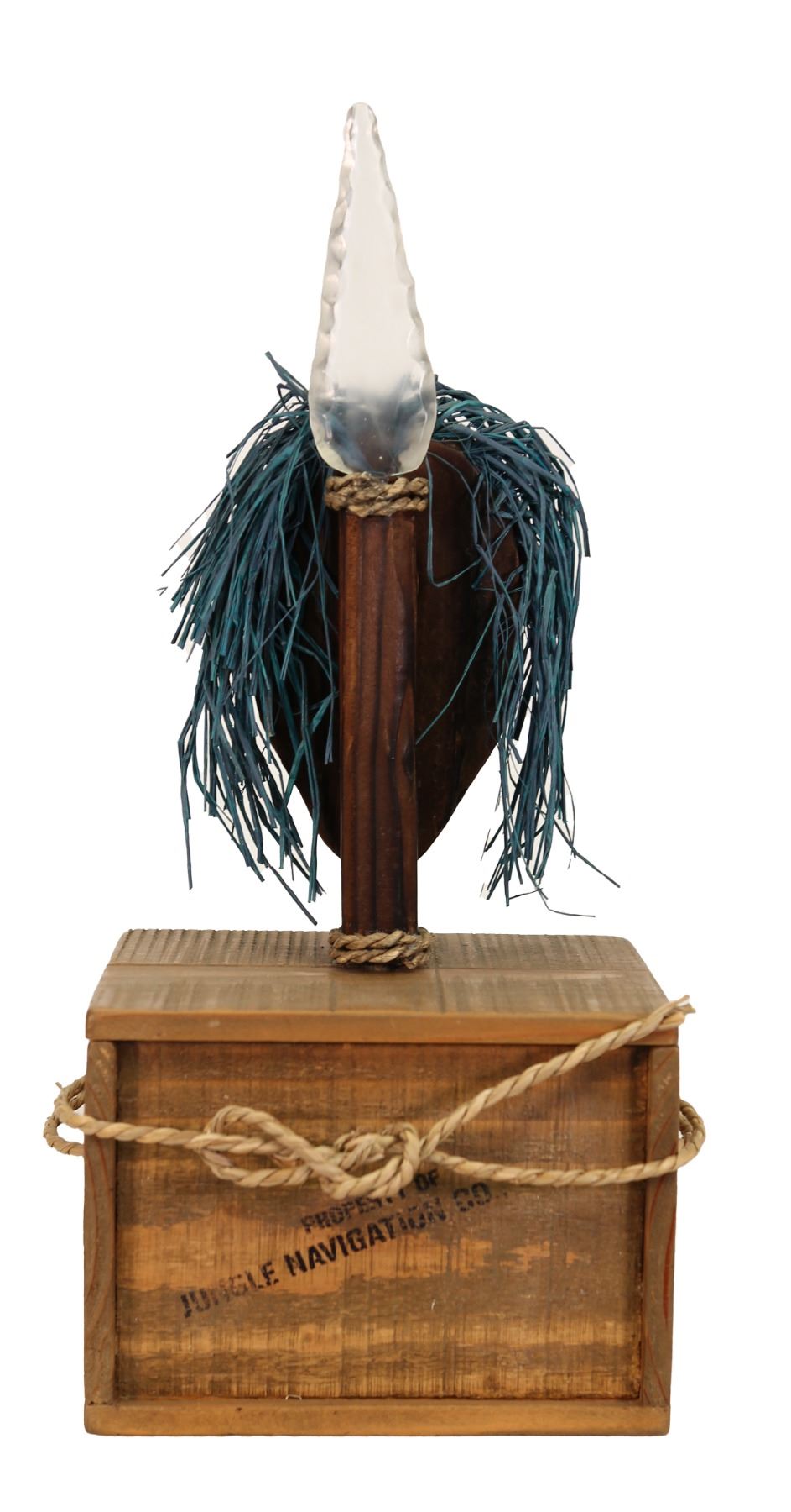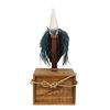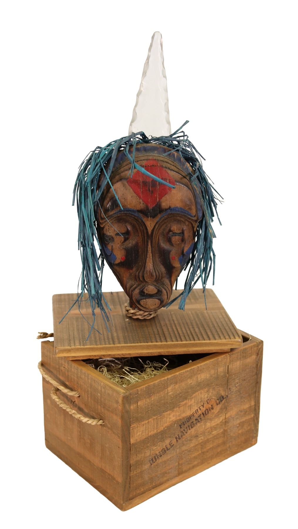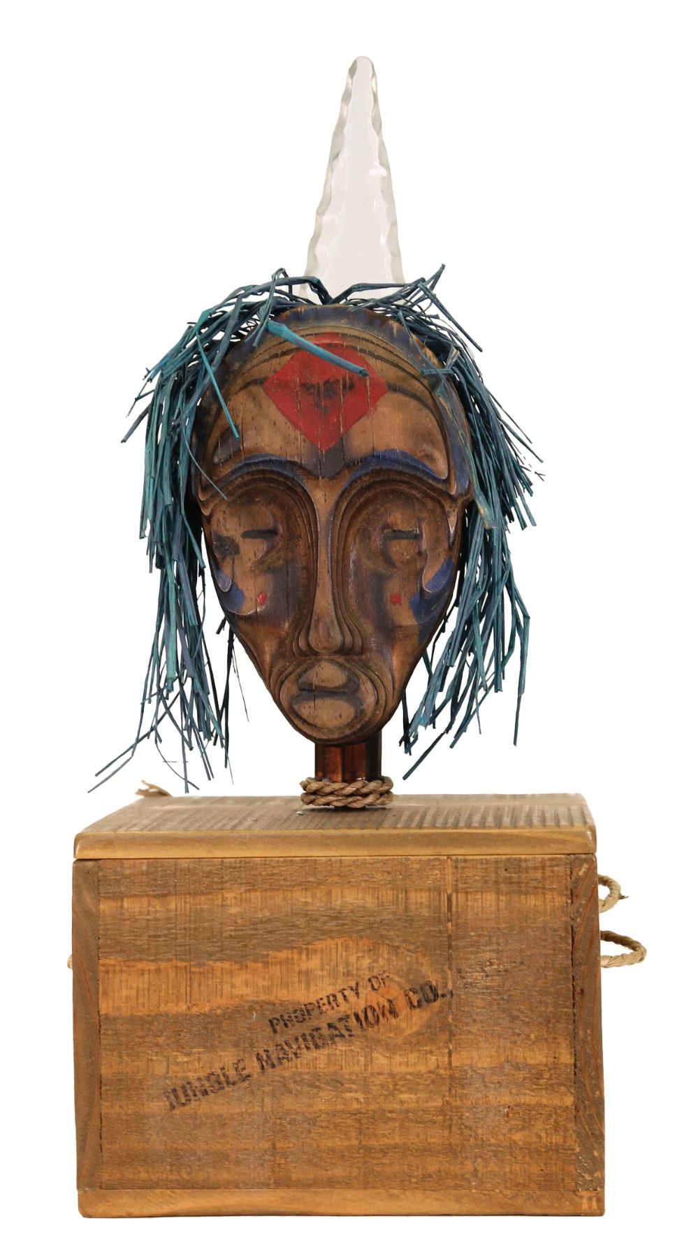 (2000s) Here is a specialty item made expressly for Disneyland's Adventureland gift shop. These were only available there in very limited quantity. Hand carved and painted Shrunken Head mask with blue raffia hair and long crystal horn on the top of the head. Solid wood. 17.25"x7.5"x6". VG+.