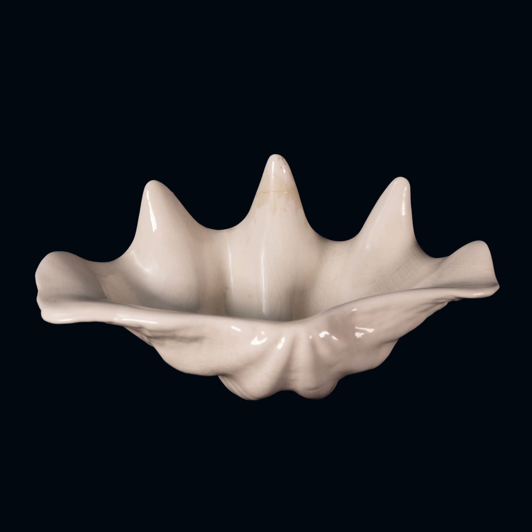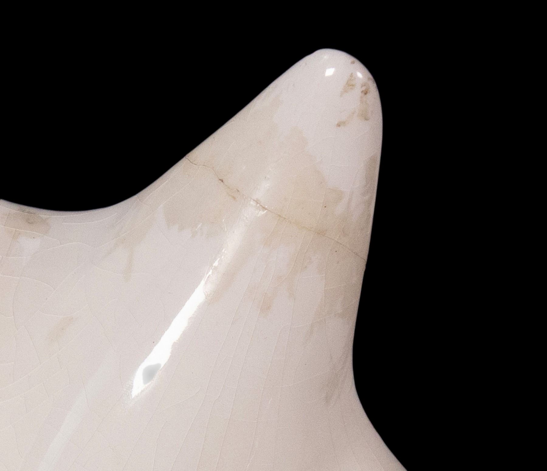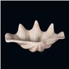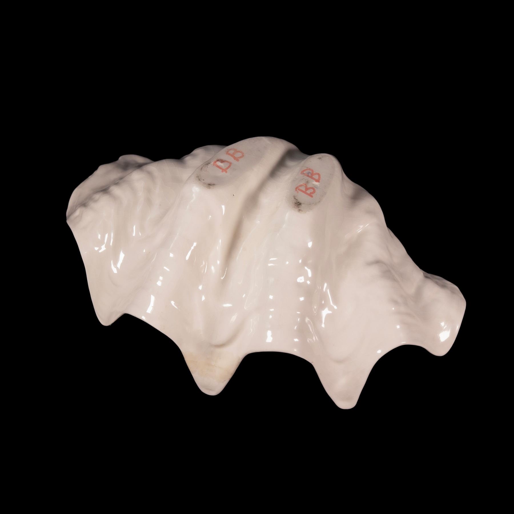 (1950s) As in the previous lot, this wonderful tridacna inspired serving bowl is a factory sample from Stella Bodey's, SPURLIN CERAMICS. It is hand marked with Spurlin production code "BB" on the bottom. This again, comes from the archives of Oceanic Arts. VG+ with a repaired break on the tip of the shell edges. 14"x6"x8".